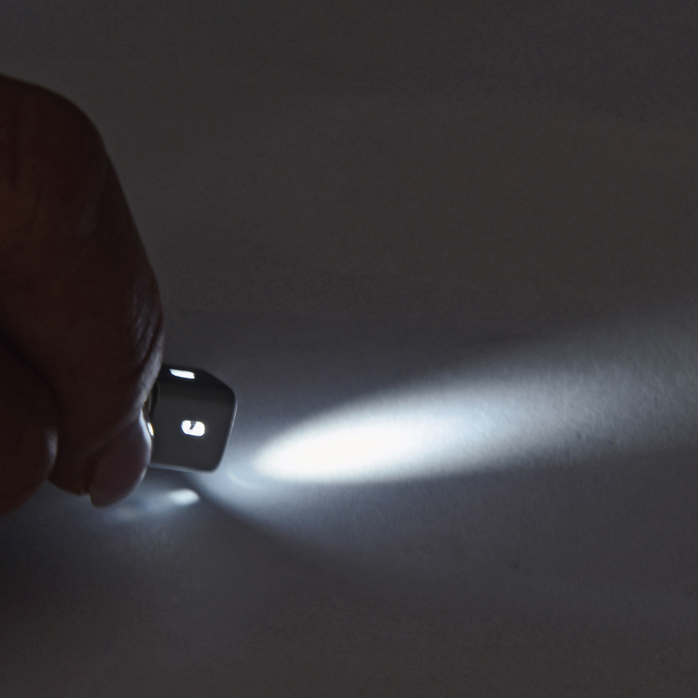 Die extrem kleine LED Leuchte verfügt über eine hohe Leuchtkraft und eine lange Brenndauer von ca. 40 Std. Dieser Werbeartikel passt nahezu zu jeder Zielgruppe. Das hochwertige, eloxierte Aluminiumgehäuse ist mit einem Karabiner zum unkomplizierten Befestigen der Leuchte ausgestattet. Gehäuse: Aluminium eloxiert. Leuchtmittel: DIP LED. Lichtwerte: 2,25 Lumen. Leuchtdauer: ca. 40 Stunden. Leuchtmodi: 100% Power weißes Licht. Equipment: Karabiner. Stromversorgung: 3 x LR41 Knopfzellen (inkl.). Verpackung: schwarze Geschenkverpackung.
