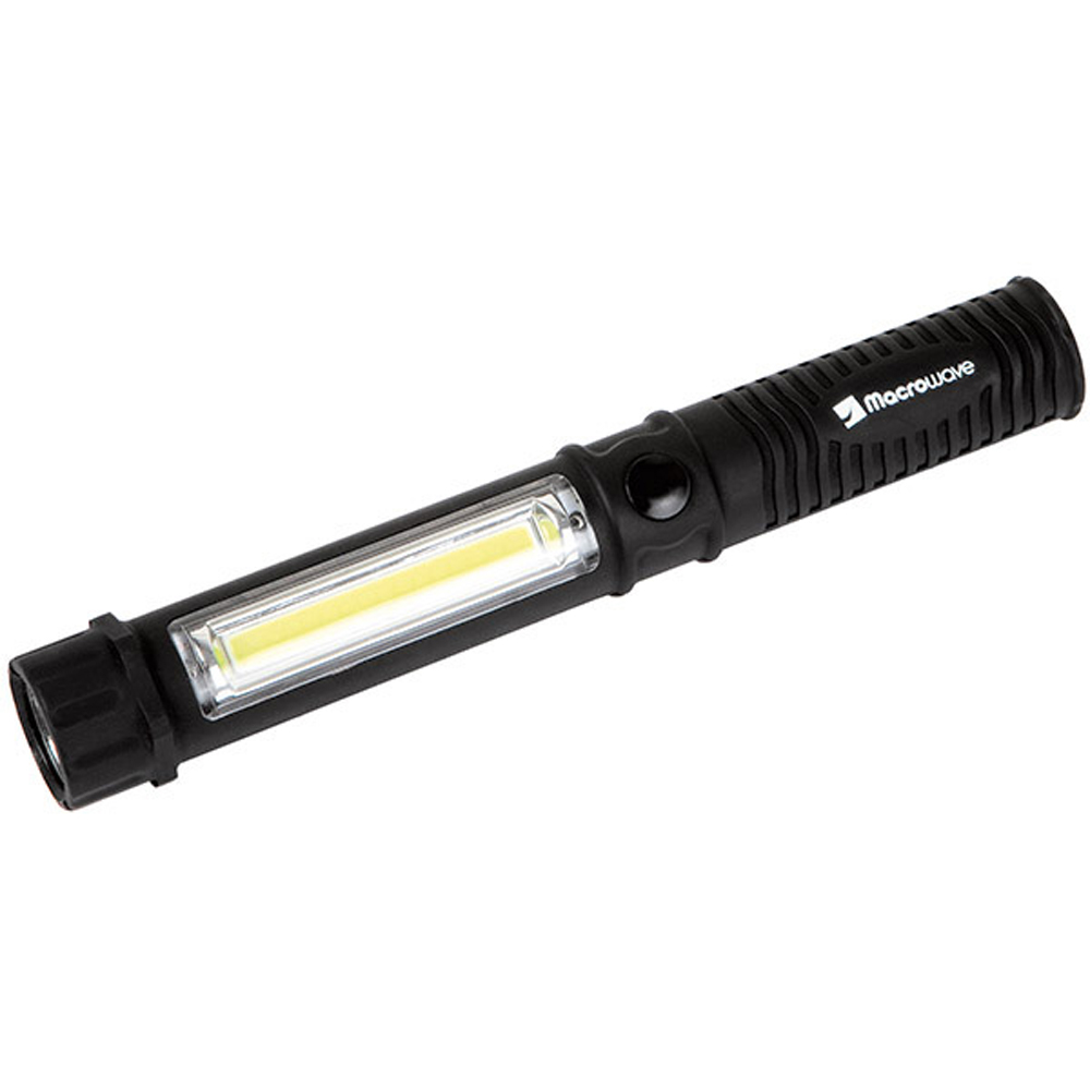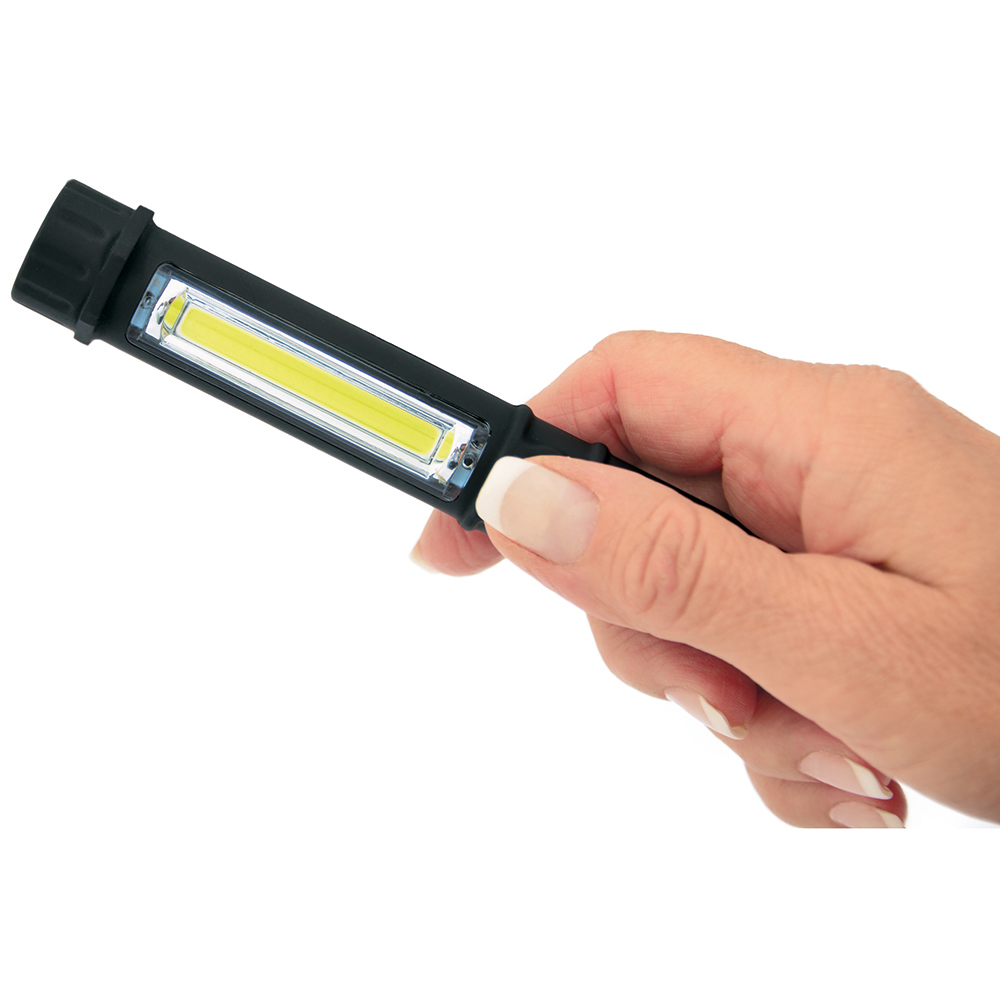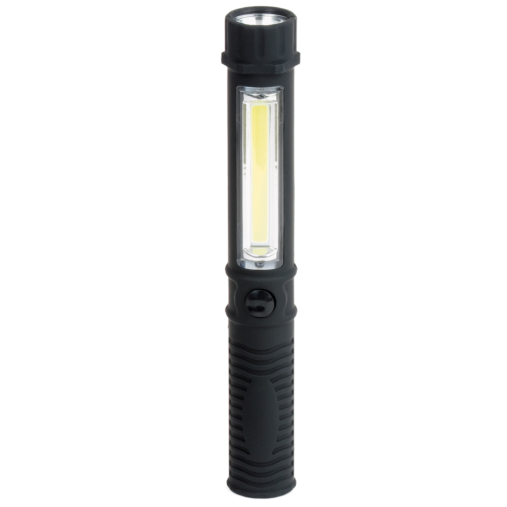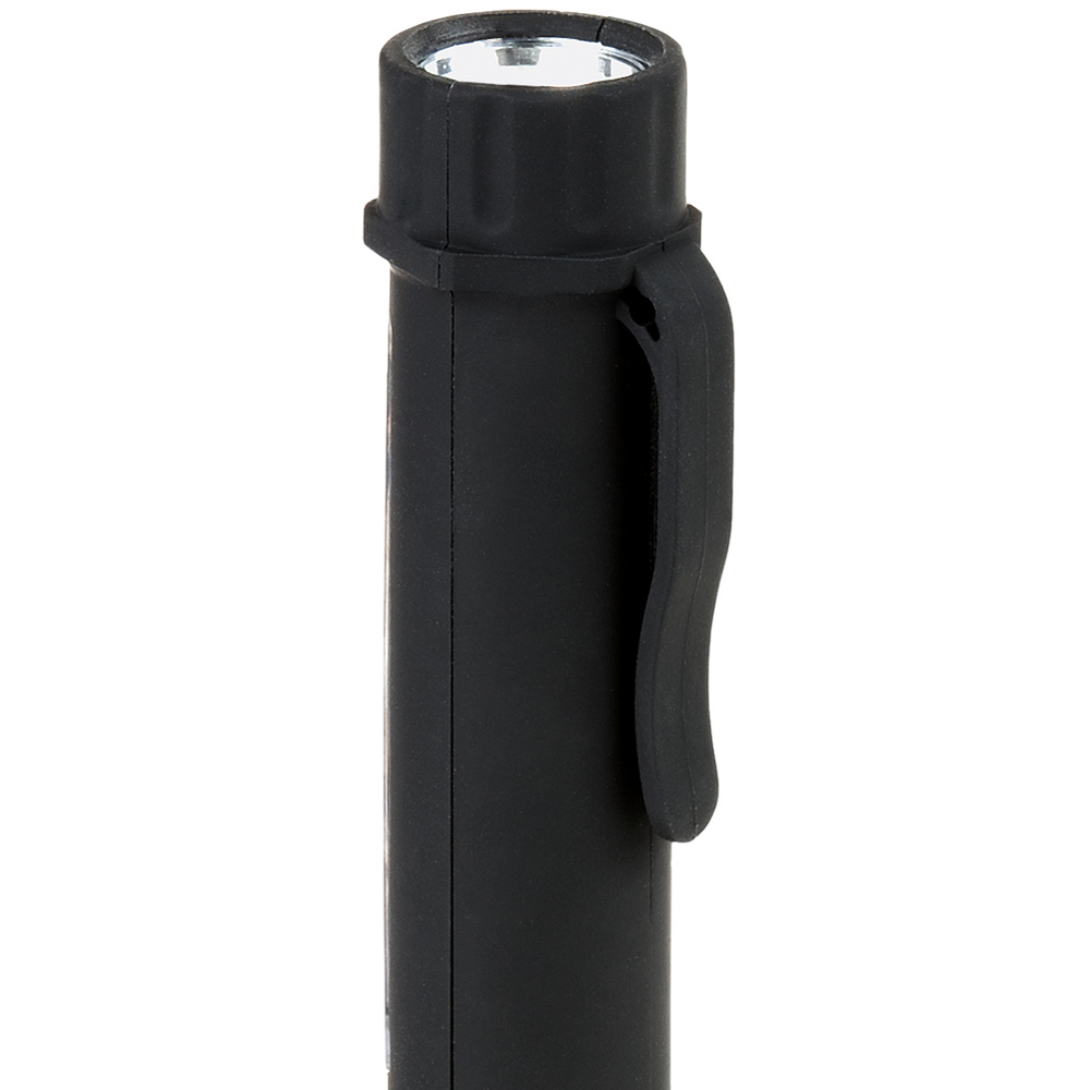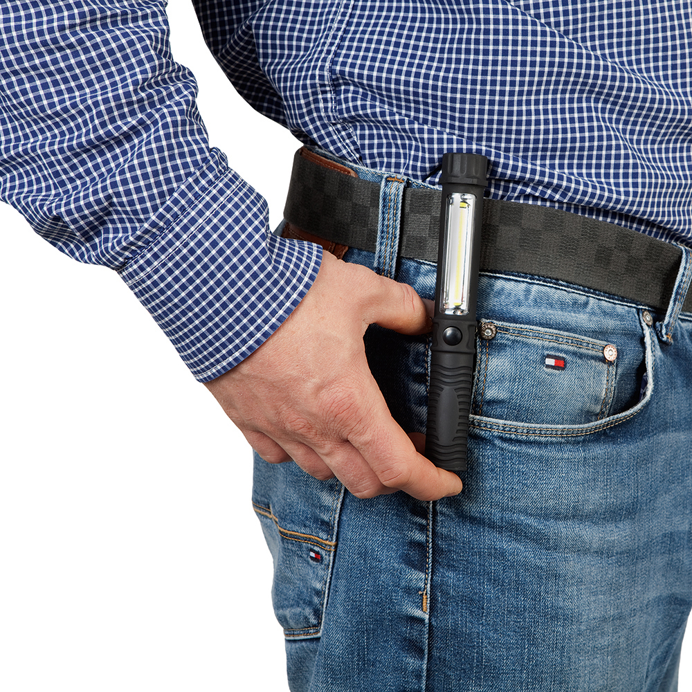 LED Arbeits- und Inspektionsleuchte. Das Gehäuse ist mit einem praktischen Clip ausgestattet, mit dem die Leuchte z. B. an der Brusttasche des Arbeitsoverall befestigt werden kann. Im Fuß der Leuchte befindet sich ein starker Magnet, mit dem diese an magnetischen Oberflächen fixiert werden kann. Gehäuse: ABS mit gummierter Oberfläche. Leuchtmittel: Arbeitsleuchte mit 1,5W COB LED, Inspektionsleuchte mit 0,5W COB LED. Lichtwerte: Arbeitsleuchte 160 Lumen, Inspektionsleuchte 35 Lumen. Leuchtdauer: ca. 15 Stunden. Leuchtmodi: 100% Power weißes Licht. Equipment: starker vernickelter Magnet im Fuß, Gürtelclip. Stromversorgung: 3 x AAA Batterie (inkl.). Verpackung: schwarze Geschenkverpackung.
