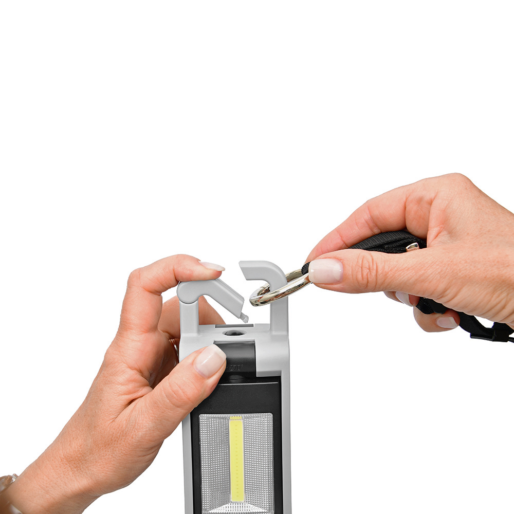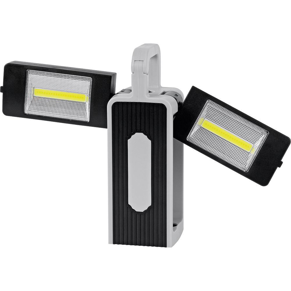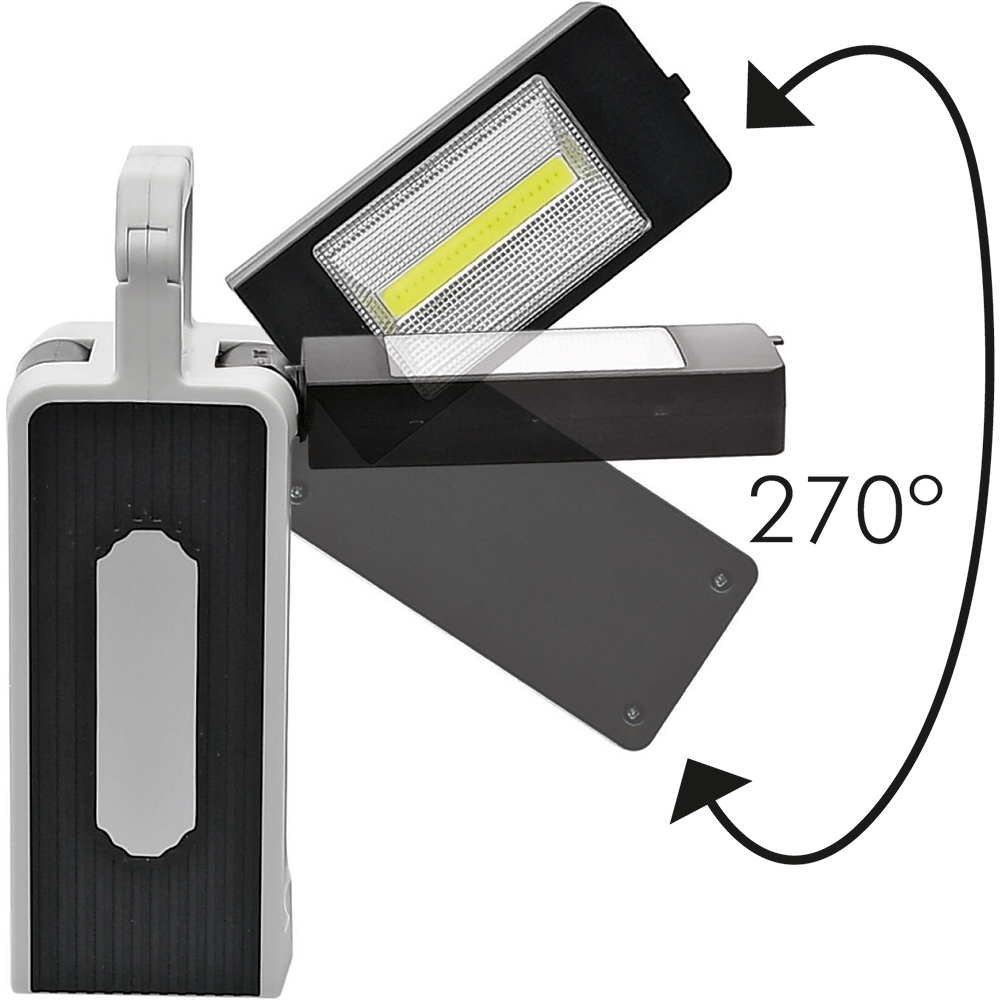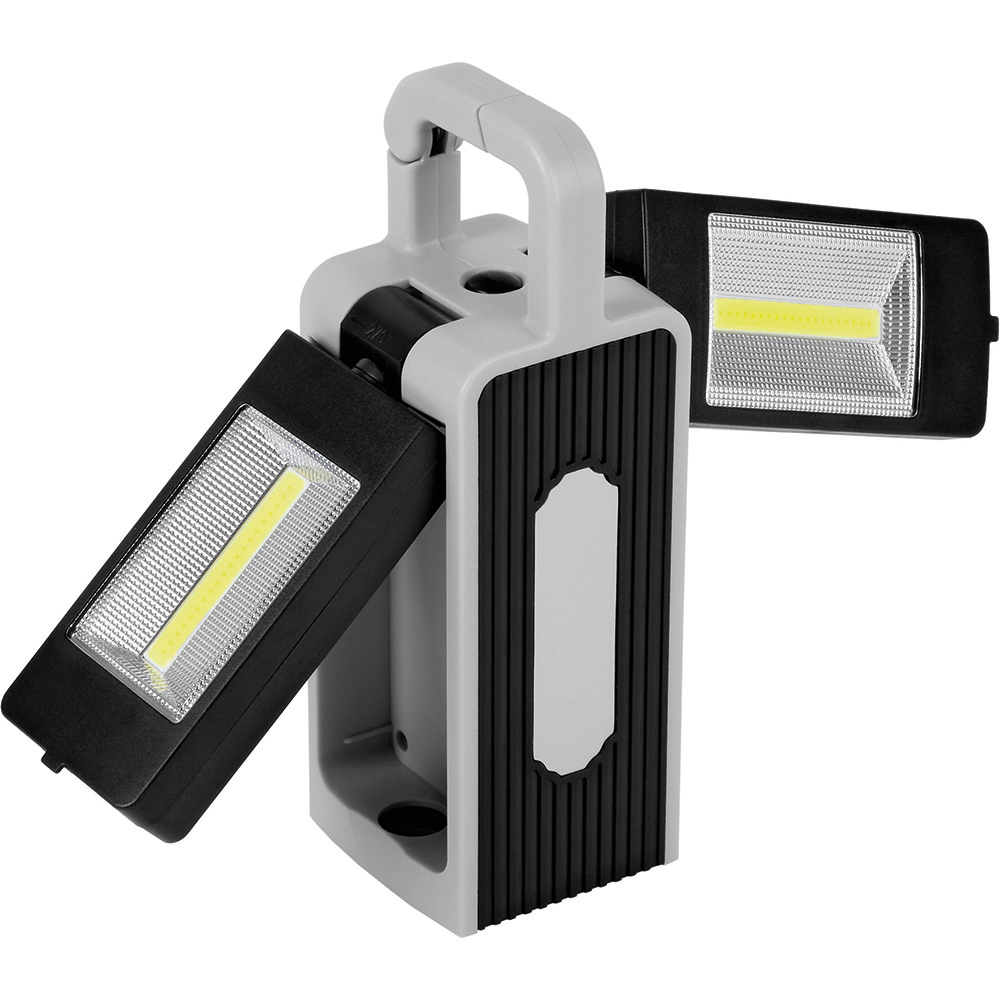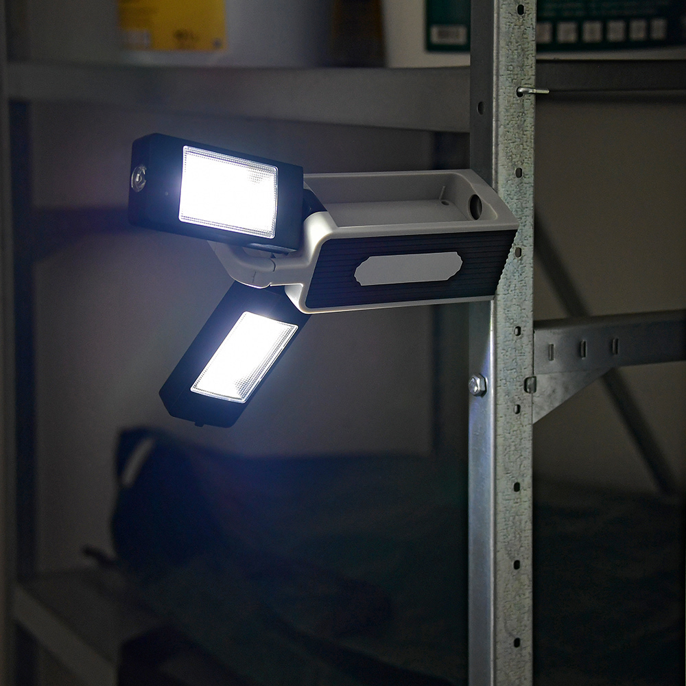 LED Arbeits- und Taschenleuchte. Optimale Helligkeit bei all Ihren Handwerksarbeiten und Freizeitaktivitäten. Klappen Sie die beiden LED Flügel aus und positionieren und drehen diese flexibel, um die perfekte Beleuchtung zu erhalten. Mit ihrem intelligenten Equipment ist die Leuchte vielseitig einsetzbar. Gehäuse: ABS. Leuchtmittel: 2 Flügel mit je einer 3W COB LED und 1W SMD LED. Lichtwerte: Flügel einseitig beleuchtet 260 Lumen, zweiseitig beleuchtet 235 Lumen, Flügel eingeklappt als Taschenleuchte 90 Lumen. Leuchtdauer: ca. 4,5 Stunden. Leuchtmodi: 100% Power weißes Licht. Equipment: jeder Flügel ist bis zu 180° ausstellbar und 270° drehbar, vier starke vernickelte Magnete im Fuß, Griff mit Karabiner, gummierte Füße. Schutzklasse: IP44. Stromversorgung: 3 x AA Batterie (inkl.). Verpackung: schwarze Geschenkverpackung.