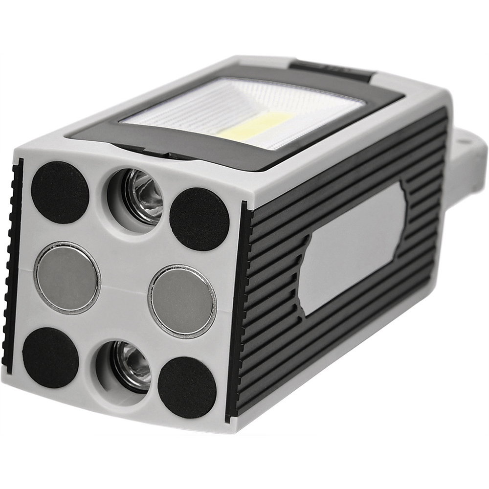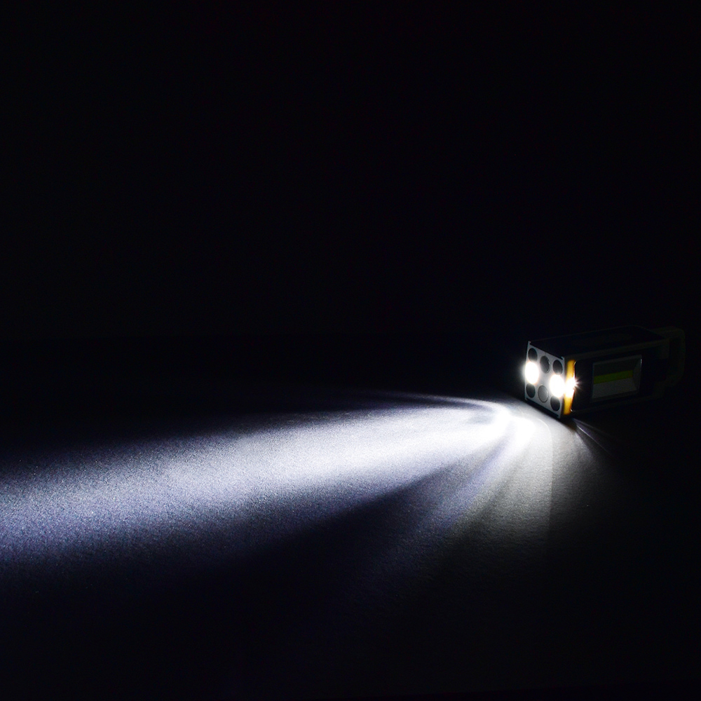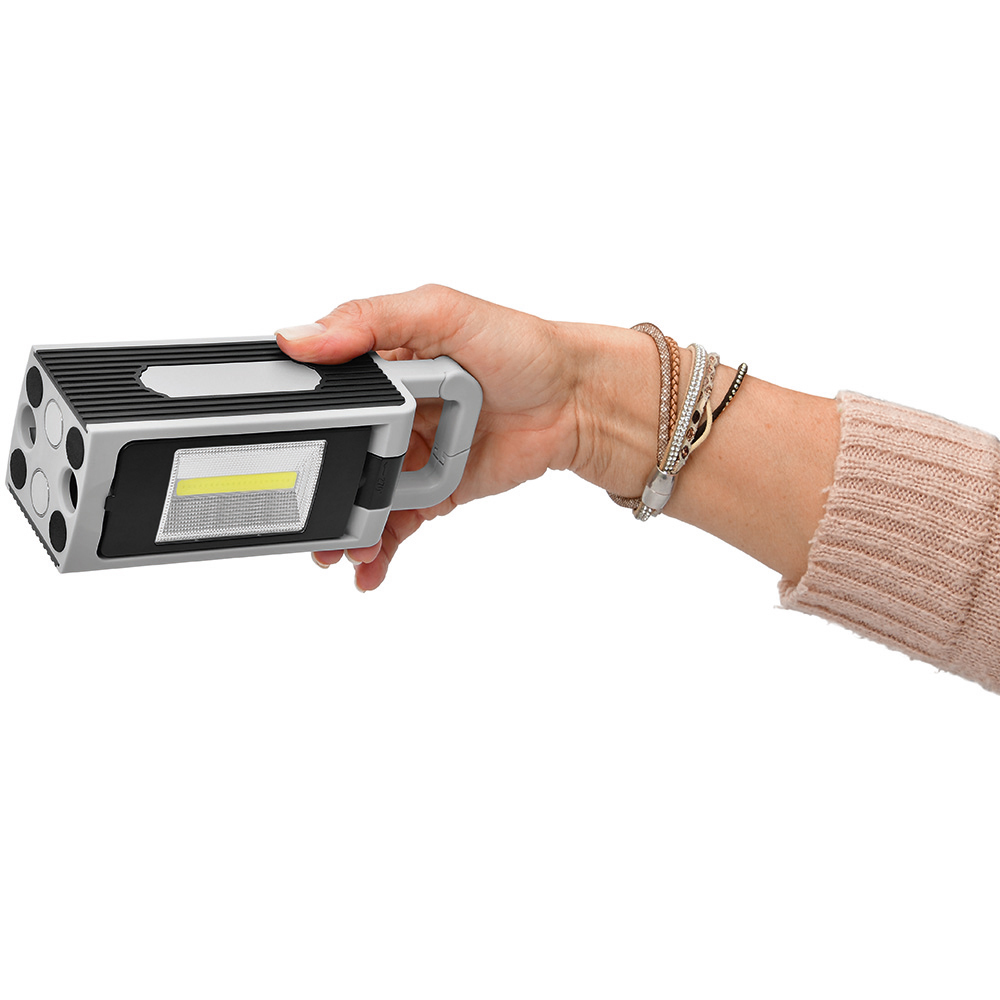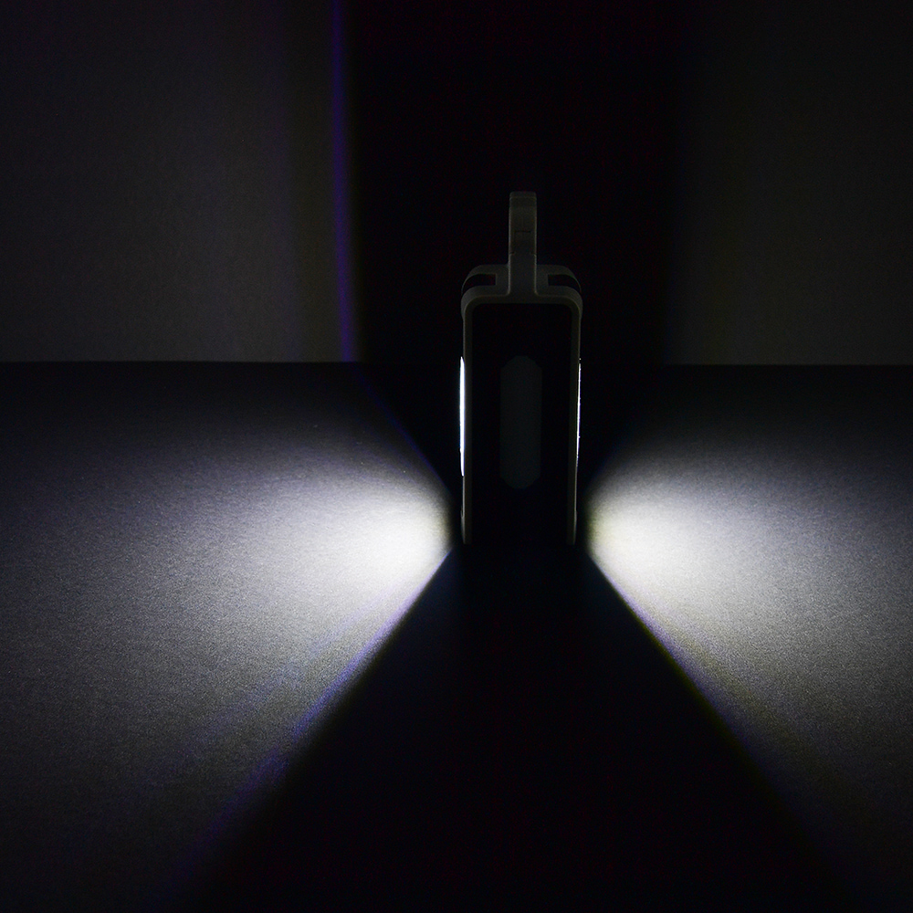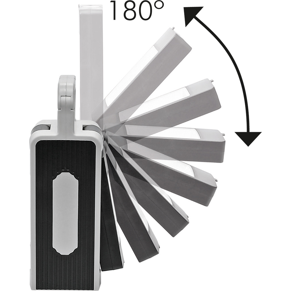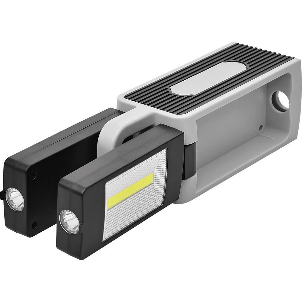 LED Arbeits- und Taschenleuchte. Optimale Helligkeit bei all Ihren Handwerksarbeiten und Freizeitaktivitäten. Klappen Sie die beiden LED Flügel aus und positionieren und drehen diese flexibel, um die perfekte Beleuchtung zu erhalten. Mit ihrem intelligenten Equipment ist die Leuchte vielseitig einsetzbar. Gehäuse: ABS. Leuchtmittel: 2 Flügel mit je einer 3W COB LED und 1W SMD LED. Lichtwerte: Flügel einseitig beleuchtet 260 Lumen, zweiseitig beleuchtet 235 Lumen, Flügel eingeklappt als Taschenleuchte 90 Lumen. Leuchtdauer: ca. 4,5 Stunden. Leuchtmodi: 100% Power weißes Licht. Equipment: jeder Flügel ist bis zu 180° ausstellbar und 270° drehbar, vier starke vernickelte Magnete im Fuß, Griff mit Karabiner, gummierte Füße. Schutzklasse: IP44. Stromversorgung: 3 x AA Batterie (inkl.). Verpackung: schwarze Geschenkverpackung.