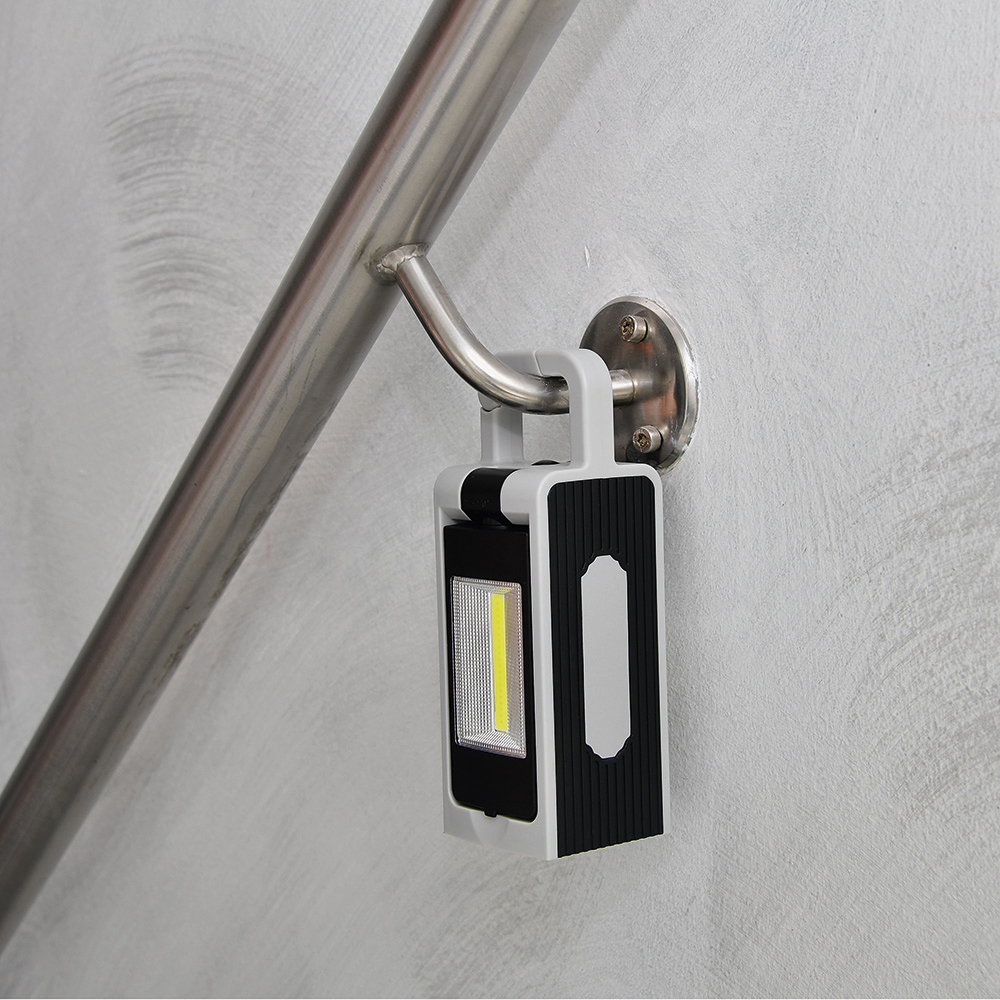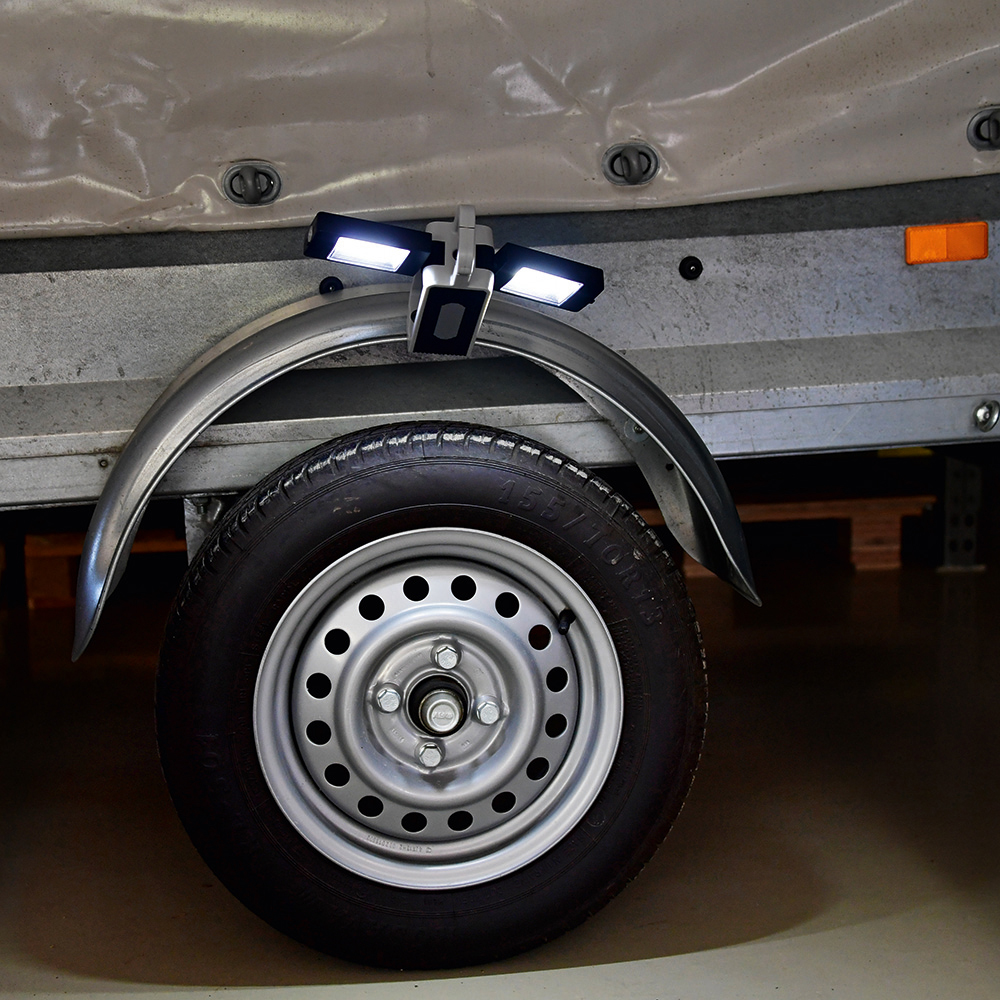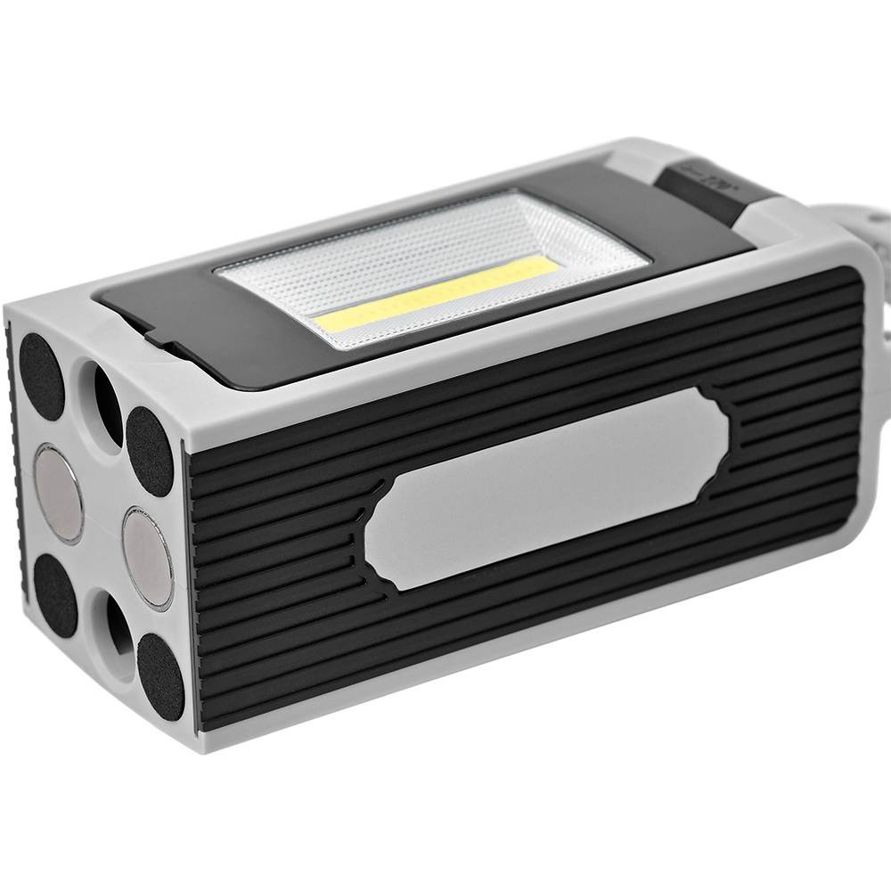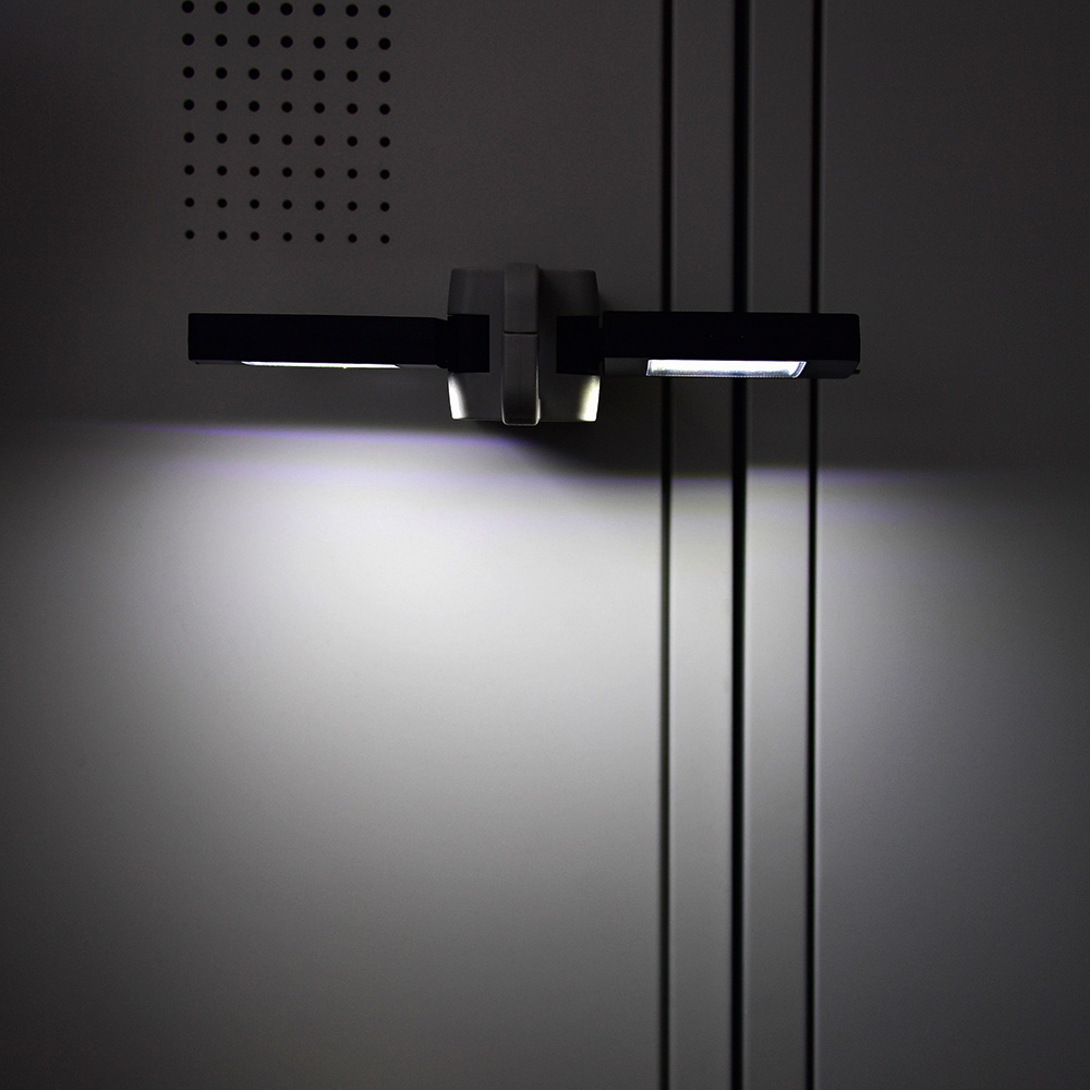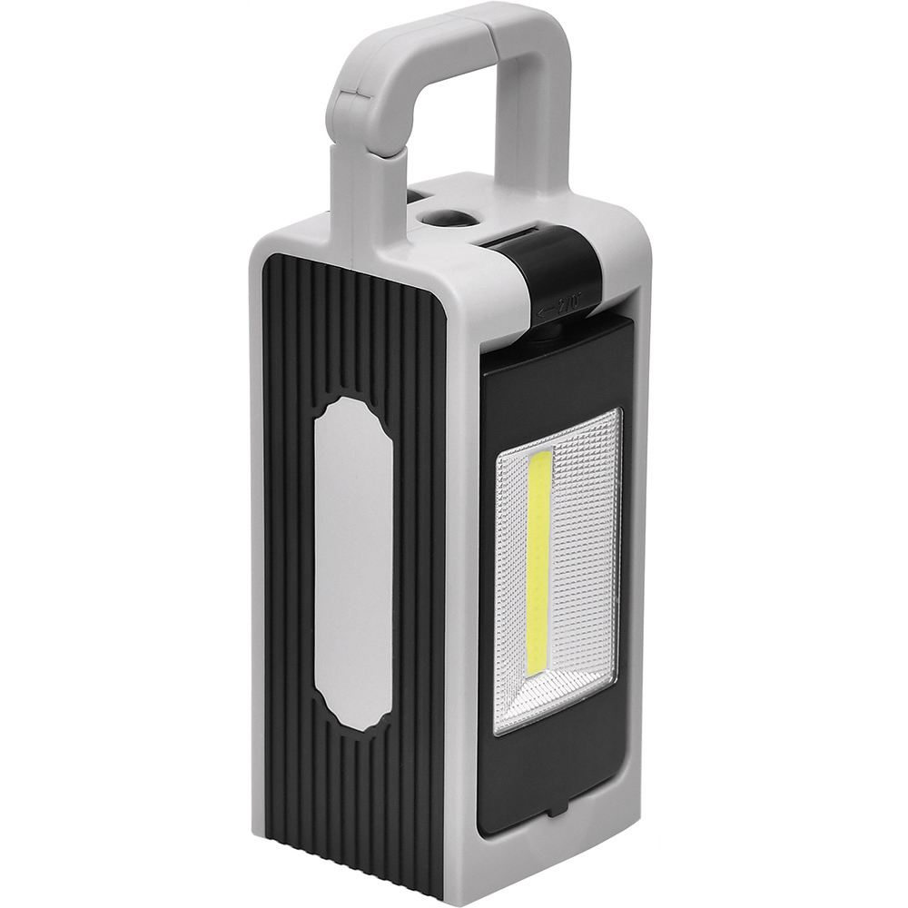 LED Arbeits- und Taschenleuchte. Optimale Helligkeit bei all Ihren Handwerksarbeiten und Freizeitaktivitäten. Klappen Sie die beiden LED Flügel aus und positionieren und drehen diese flexibel, um die perfekte Beleuchtung zu erhalten. Mit ihrem intelligenten Equipment ist die Leuchte vielseitig einsetzbar. Gehäuse: ABS. Leuchtmittel: 2 Flügel mit je einer 3W COB LED und 1W SMD LED. Lichtwerte: Flügel einseitig beleuchtet 260 Lumen, zweiseitig beleuchtet 235 Lumen, Flügel eingeklappt als Taschenleuchte 90 Lumen. Leuchtdauer: ca. 4,5 Stunden. Leuchtmodi: 100% Power weißes Licht. Equipment: jeder Flügel ist bis zu 180° ausstellbar und 270° drehbar, vier starke vernickelte Magnete im Fuß, Griff mit Karabiner, gummierte Füße. Schutzklasse: IP44. Stromversorgung: 3 x AA Batterie (inkl.). Verpackung: schwarze Geschenkverpackung.