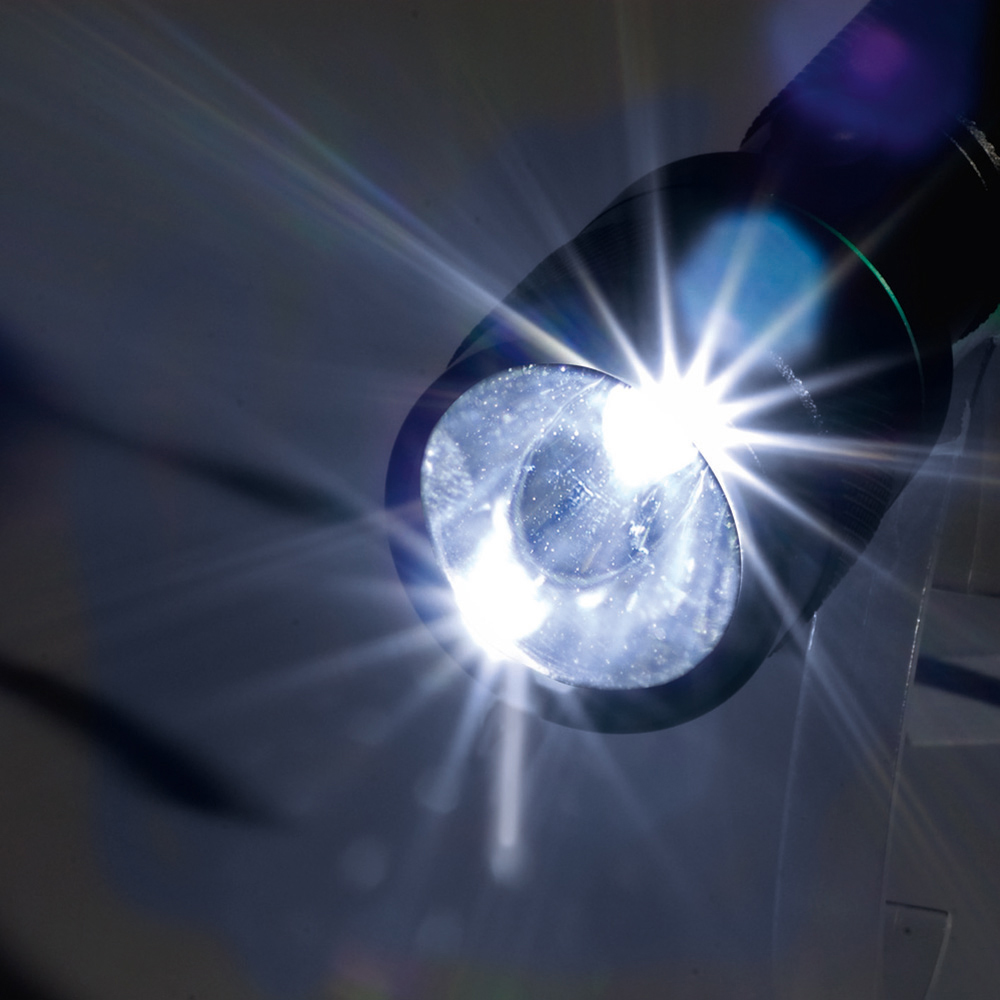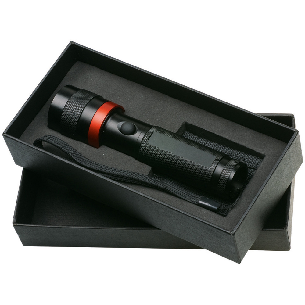 LED Taschenleuchte mit Nylon-Gürtelholster. Das griffige und sehr edel wirkende Gehäuse der Leuchte aus hochwertigem eloxiertem Aluminium, wird zusätzlich durch den farbigen Aluminiumring am Leuchtenkopf aufgewertet. Die Trageschlaufe garantiert, dass Sie die Leuchte immer fest im Griff haben. Das Gürtelholster aus Nylon sichert den schnellen Zugriff auf die Taschenleuchte. Gehäuse: Aluminium eloxiert. Leuchtmittel: OSRAM SMD LED. Lichtwerte: 400 Lumen. Leuchtdauer: ca. 10 Stunden. Leuchtmodi: 100% Power weißes Licht. Equipment: Handschlaufe, Nylon-Gürtelholster. Stromversorgung: 3 x AAA Batterien (inkl.). Verpackung: hochwertige Karton-Geschenkverpackung.