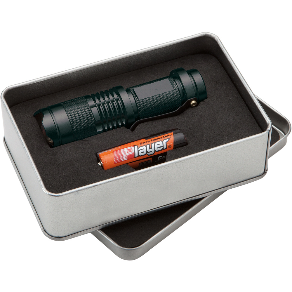 3 Watt CREE® LED Leuchte mit Signallicht. Eine robuste Taschenleuchte in technischem Design mit einer absolut leuchtstarken LED. Ausgestattet mit einem Gürtelclip und in einer attraktiven Metalldose verpackt. Gehäuse: Aluminium eloxiert. Leuchtmittel: High Power 3W CREE® SMD LED. Lichtwerte: 120 Lumen. Leuchtdauer: ca. 5 Stunden. Leuchtmodi: 100% Power weißes Licht / 50 % Power weißes Licht / Blinklicht weiß. Equipment: Gürtelclip. Stromversorgung: 1 x AA Batterie (inkl.). Verpackung: attraktive Metalldose.