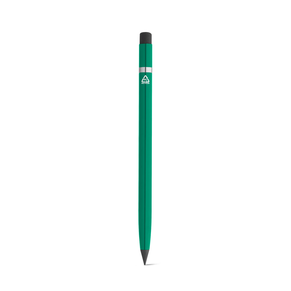 Tintenfreier Stift mit recycelt Aluminiumgehäuse (100% rAL) und PE-Kappe mit einer graphit Spitze. Geeignet für den Langzeitgebrauch, ohne dass er nachgespitzt werden muss. In der Spitze befindet sich ein Radiergummi, mit dem sich das Geschriebene leicht ausradieren lässt. ø8 x 150 mm