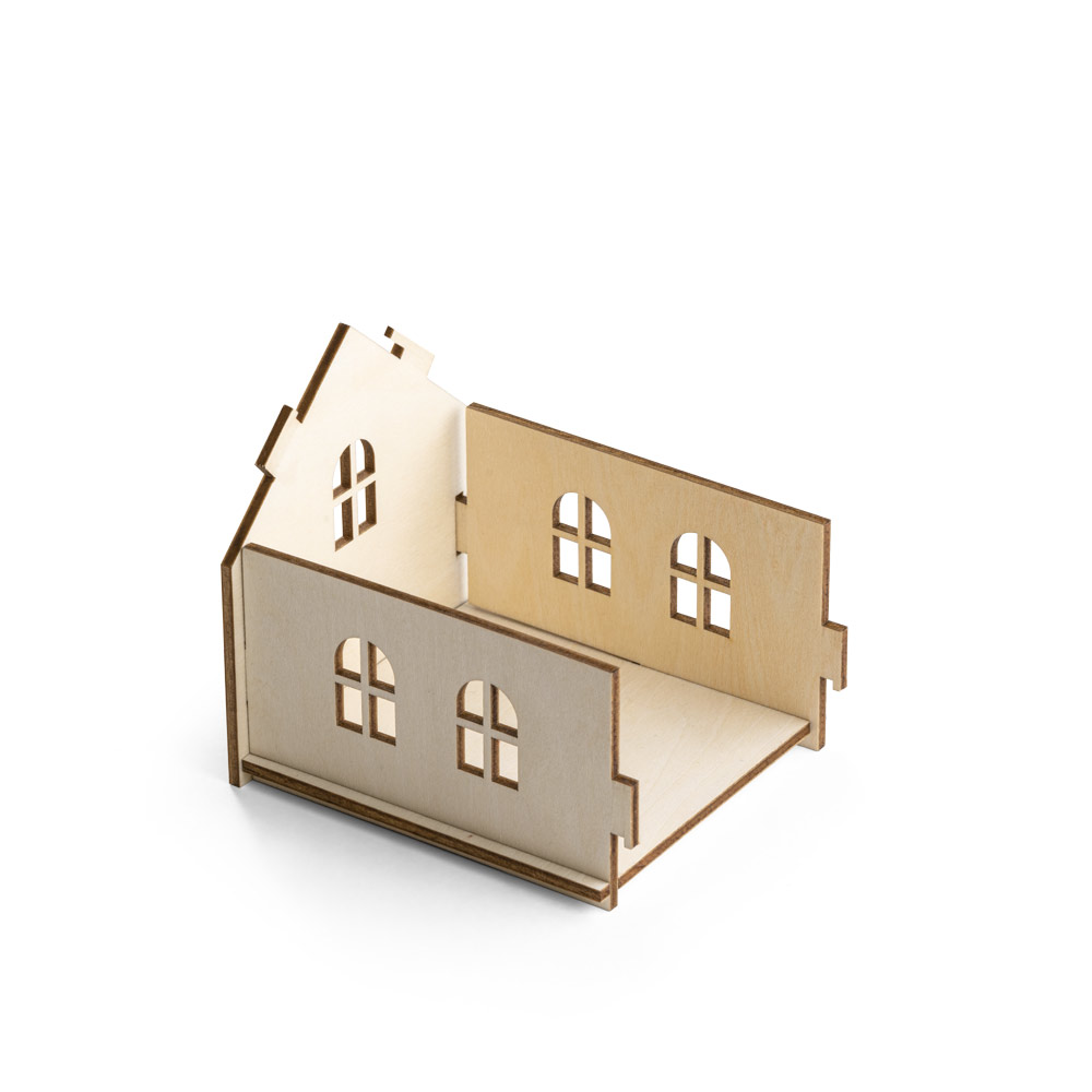 Dekorationshaus aus Sperrholz, geliefert mit Schlaufe zum Aufhängen. Kann als Geschenkverpackung genutzt werden. Wird nicht aufgebaut geliefert. 93 x 114 x 119 mm
