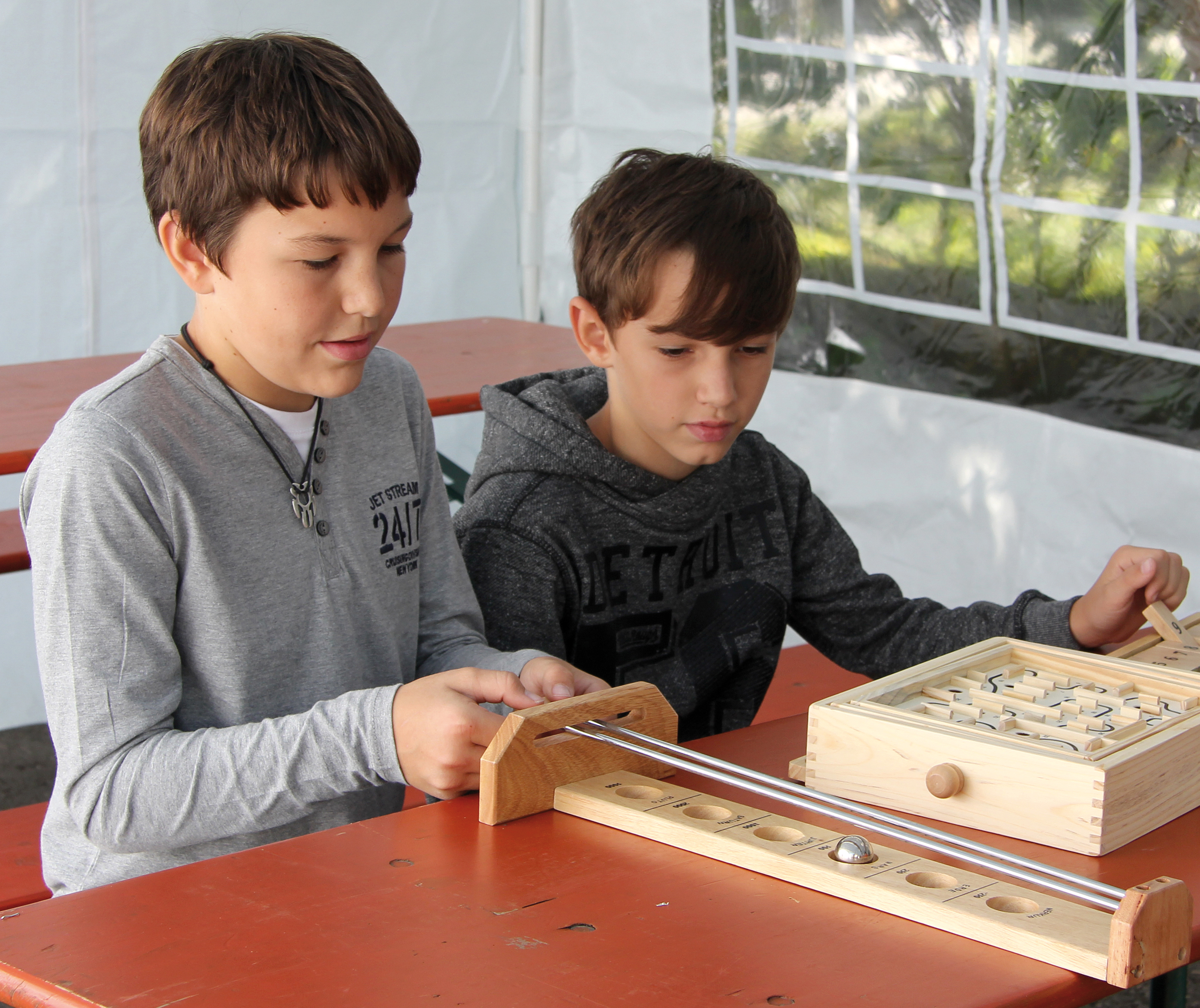 Durch Bewegen des hölzernen Spielbrettes soll die Metallkugel ins Ziel manövriert werden.