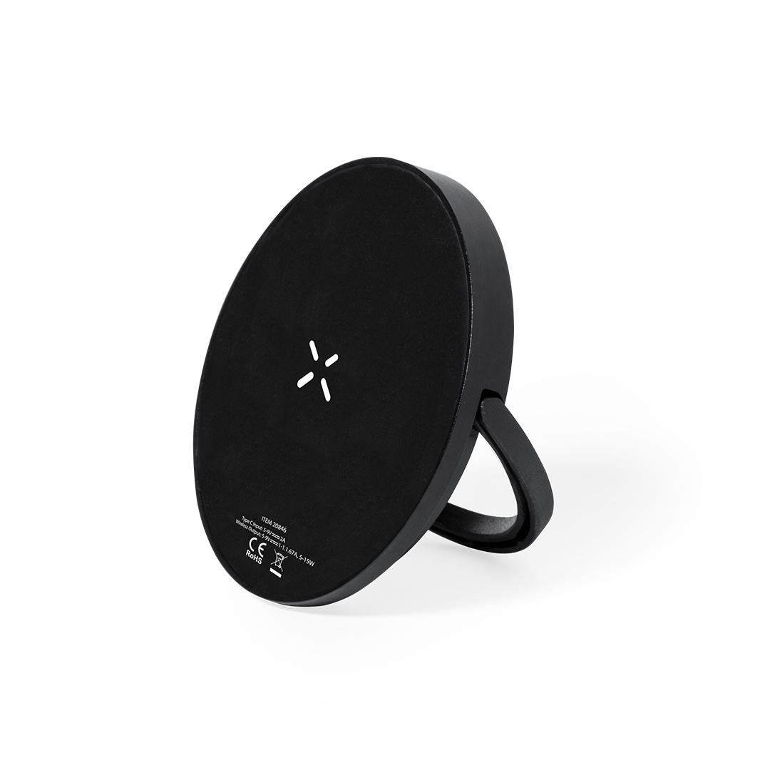 Magnetisches kabelloses Ladegerät 15W, hergestellt aus robustem Aluminium. Mit verstellbarer Halterung und Ladestatusanzeige. Kompatibel mit Geräten, die mit kabelloser Ladetechnologie ausgestattet sind und inklusive 1m USB-Ladekabel mit Aluminiumstecker. Große Branding-Fläche und präsentiert in einer attraktiven Designbox. Gebrauchsanweisung in Englisch und Spanisch erhältlich. Hergestellt gemäß den RoHS-Normen und in Übereinstimmung mit den folgenden Sicherheitsanforderungen:Überhitzungsschutzsystem.Überladungsschutzsystem. Blockiersystem zur Vermeidung von Kurzschlüssen.