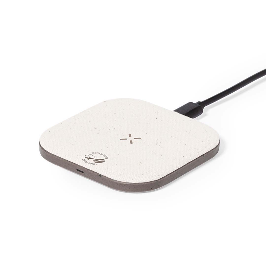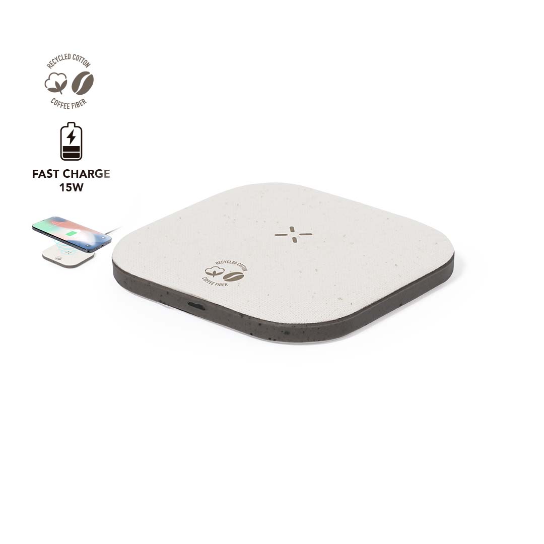 Kabelloses Ladegerät auKabelloses Ladegerät aus Kaffeefasern und recycelter Baumwolle. Rutschfeste Basis und kompatibel mit Geräten, die mit Qi-Ladetechnologie ausgestattet sind. Ladekapazität von 15 W, mit schwarzem Typ-C-Kabel im Lieferumfang. Mit Aufklebern aus Kaffeefasern und recycelter Baumwolle. Präsentiert in einer attraktiven Kraft-Design-Box, mit Bedienungsanleitung in Englisch und Spanisch. Kaffeefasern sind eine Kreislauflösung, die aus der Verwendung von Abfällen der Kaffeeproduktion gewonnen wird. Eine nachhaltige Alternative, die die Reduzierung der Verwendung von Kunststoffen begünstigt, Energie im Herstellungsprozess spart und zum Umweltschutz beiträgt. Es gibt eine GRS-Zertifizierung (Global Recycled Standard), die die recycelte Herkunft des für die Herstellung des Produkts verwendeten Materials garantiert. s Kaffeefasern und recycelter Baumwolle. Rutschfeste Basis und kompatibel mit Geräten, die mit Qi-Ladetechnologie ausgestattet sind. Ladekapazität von 15 W, mit schwarzem Typ-C-Kabel im Lieferumfang. Mit Aufklebern aus Kaffeefasern und recycelter Baumwolle. Präsentiert in einer attraktiven Kraft-Design-Box, mit Bedienungsanleitung in Englisch und Spanisch.