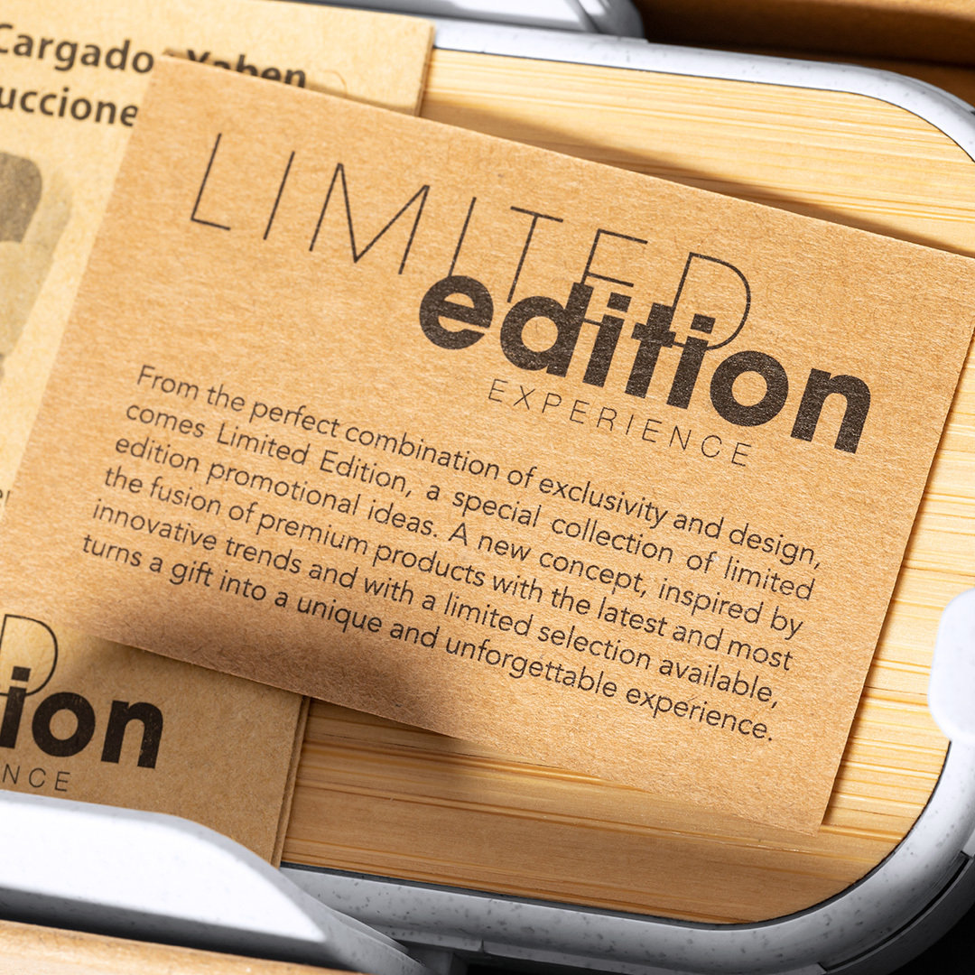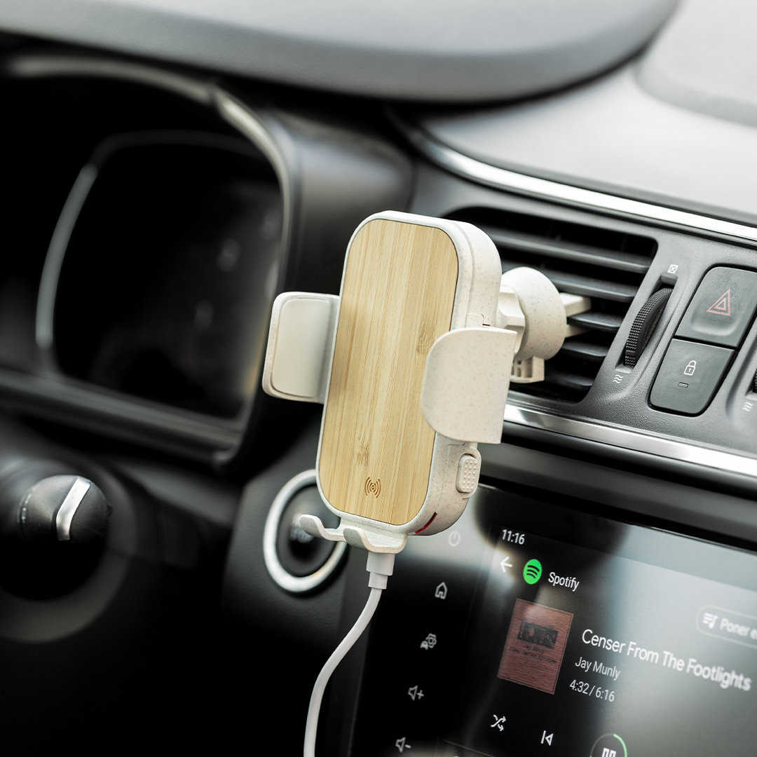 Kabellose Autoladehalterung Limited Edition Ein innovativer Stil, bei dem Ökologie und Design mit modernster Technologie in erstklassiger Qualität kombiniert werden. Hergestellt aus Bambus und einem Gehäuse aus haltbarem ABS und Weizenrohr, um die Verwendung natürlicher Rohstoffe zu fördern und Schadstoffemissionen zu reduzieren. Mit kabellosem 15-W-Ladegerät. Kompatibel mit kabellos aufladbaren Mobilgeräten, inklusive 100 cm USB-C-Ladekabel und Bedienungsanleitung in Englisch und Spanisch. Aus der perfekten Kombination von Exklusivität und Design ist Limited Edition entstanden, eine besondere Kollektion von Werbeideen in limitierter Auflage. Ein neues Konzept, inspiriert durch die Verschmelzung von Premium-Artikeln mit den neuesten und innovativsten Trends und mit einer begrenzten Auswahl an Einheiten, die ein Geschenk zu einem einzigartigen und unvergesslichen Erlebnis machen. Exklusiver Limited Edition-Präsentationskoffer, Design durch gewerbliche Schutzrechte geschützt. Einschließlich einer Karte mit der Beschreibung von Limited Edition Experience auf recyceltem Karton.
