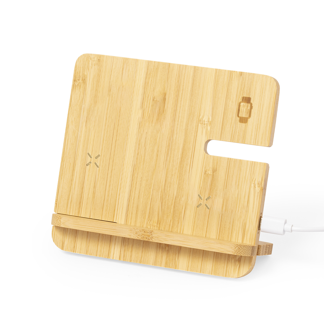 Komplettes 15W kabelloses Multi-Ladegerät mit Gadget-Halter, aus Bambus. Konzipiert für das gleichzeitige Laden von Smartphone, Kopfhörer und Smartwatch: eine vielseitige All-in-One-Ladestation mit verschiedenen Halterungen. Präsentiert in einer Kraft-Design-Box. Bedienungsanleitung in Englisch und Spanisch. Materialien wie Bambus fördern die Verwendung natürlicher Rohstoffe und reduzieren die Schadstoffemissionen. Es stammt von einer sehr widerstandsfähigen und vielseitigen Pflanze mit schnellem Wachstum und Regeneration, was es zu einer ausgezeichneten Alternative zu traditionellem Holz macht. Hergestellt nach RoHS-Standards und in Übereinstimmung mit den folgenden Sicherheitsanforderungen:Überhitzungsschutzsystem.Überladungsschutzsystem. Blockiersystem zur Vermeidung von Kurzschlüssen.