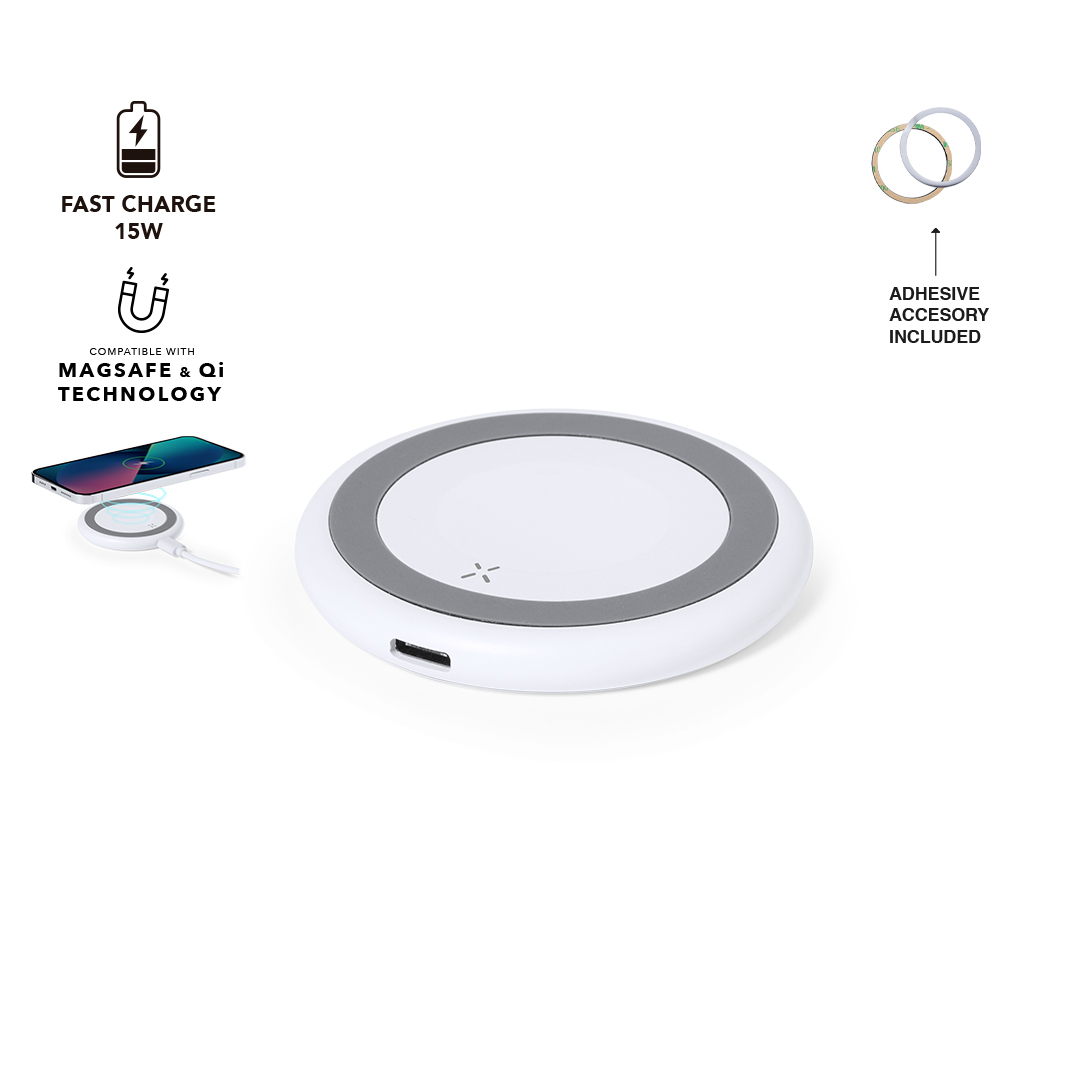 Kabelloses 15-W-Ladegerät mit rundem Design. Rutschfeste Basis und kompatibel mit Geräten, die mit Qi-Ladetechnologie ausgestattet sind. Geeignet zum Aufladen von Smartphones, Kopfhörern und Smartwatches. Präsentiert in einer attraktiven Kraft-Design-Box. Handbuch in Englisch und Spanisch erhältlich.