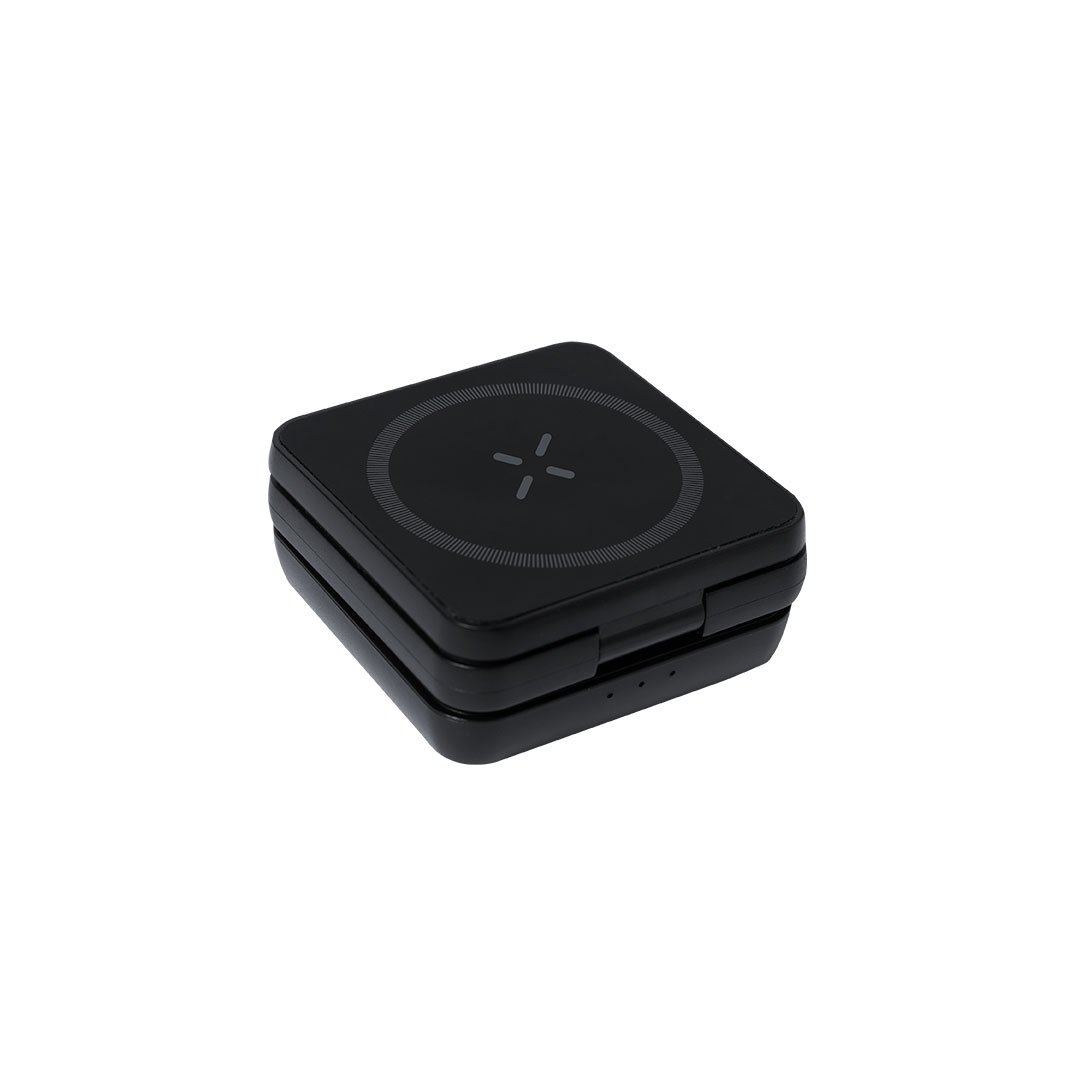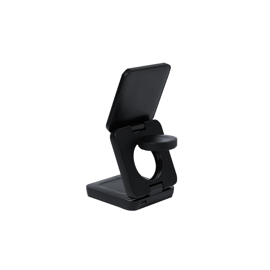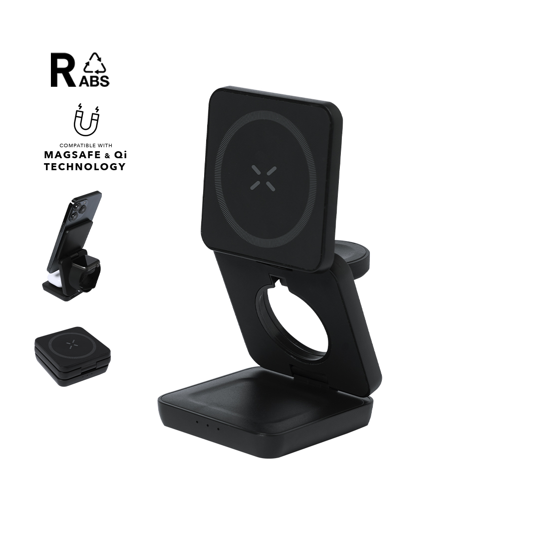4-in-1 tragbares, magnetisches kabelloses Ladegerät mit 15 W, hergestellt aus recyceltem ABS (RABS). Entwickelt für das gleichzeitige Laden von Smartphone, Kopfhörern, Smartwatch und Halter. Ein All-in-One-Gadget: faltbar, tragbar, kompakt, sehr vielseitig und funktional im Design. Mit matter, gummierter Oberfläche. USB-Typ-C-Anschluss - Kabel inklusive -.RABS ist ein hochgradig recycelbarer Kunststoff mit hoher Widerstandsfähigkeit und zahlreichen Anwendungen, die ihn zu einer umweltfreundlichen Lösung machen. Hergestellt gemäß RoHS-Standards und erfüllt die folgenden Sicherheitsanforderungen:Überhitzungsschutz.Überlastschutz. Sicherheitssystem zur Kurzschlussvermeidung.