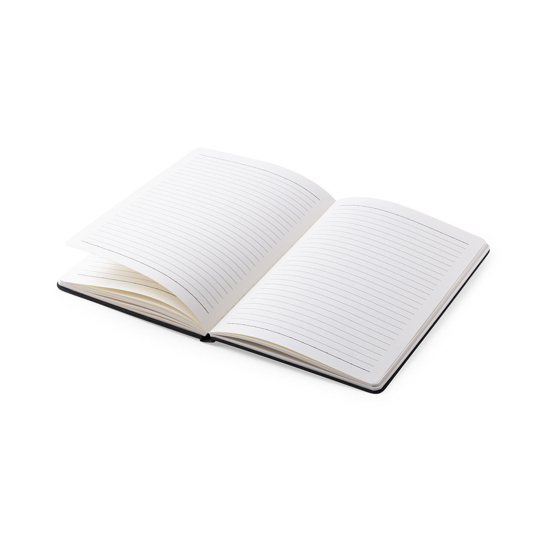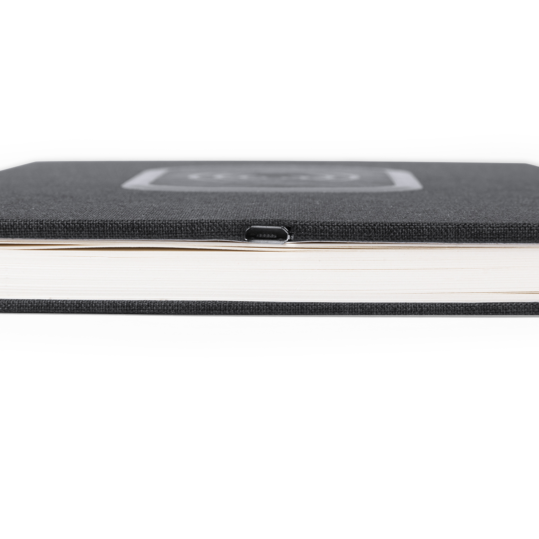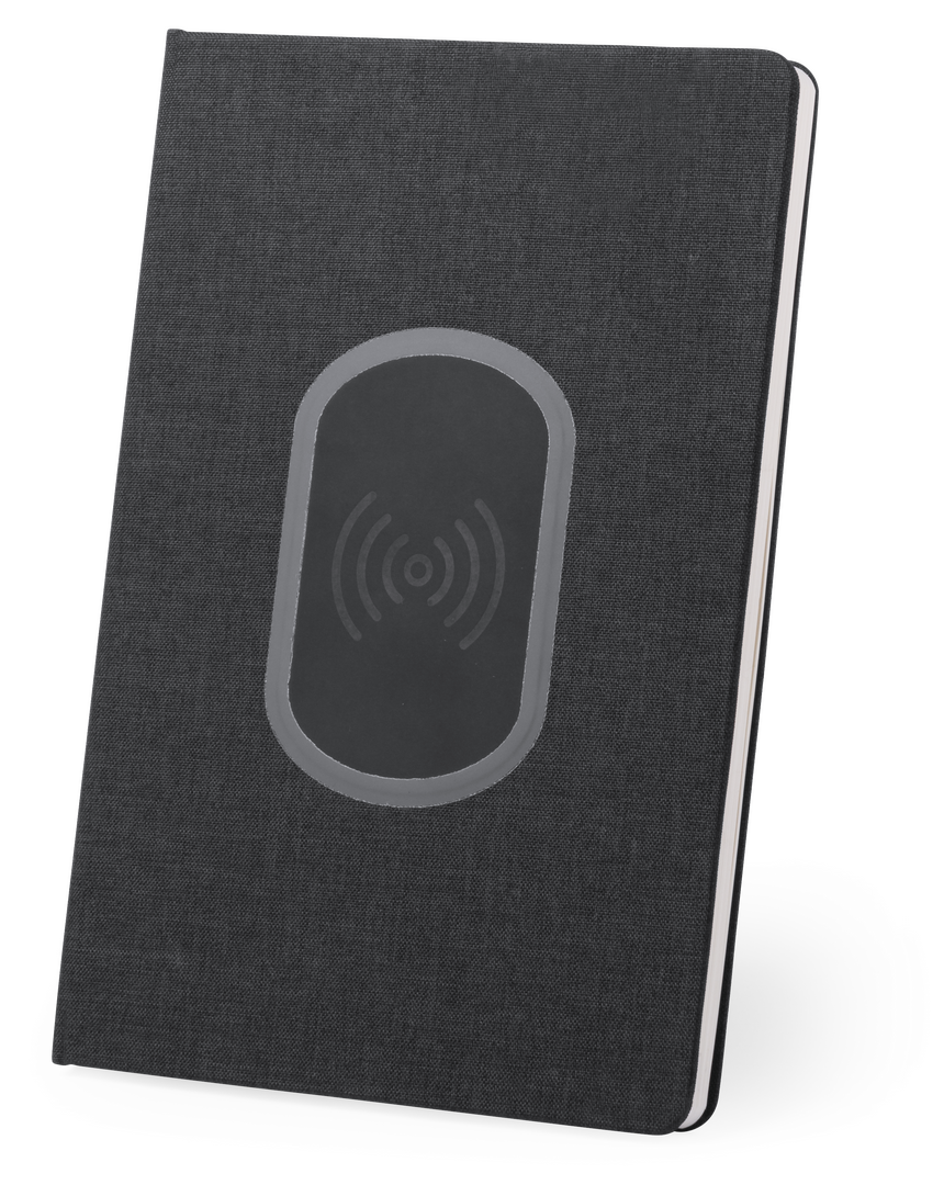 Notizblock aus robustem 300D Polyester mit schlichtem Design und integriertem, kabellosem Ladegerät. Ladestation auf dem Cover. Mit 80 linierten Blättern.