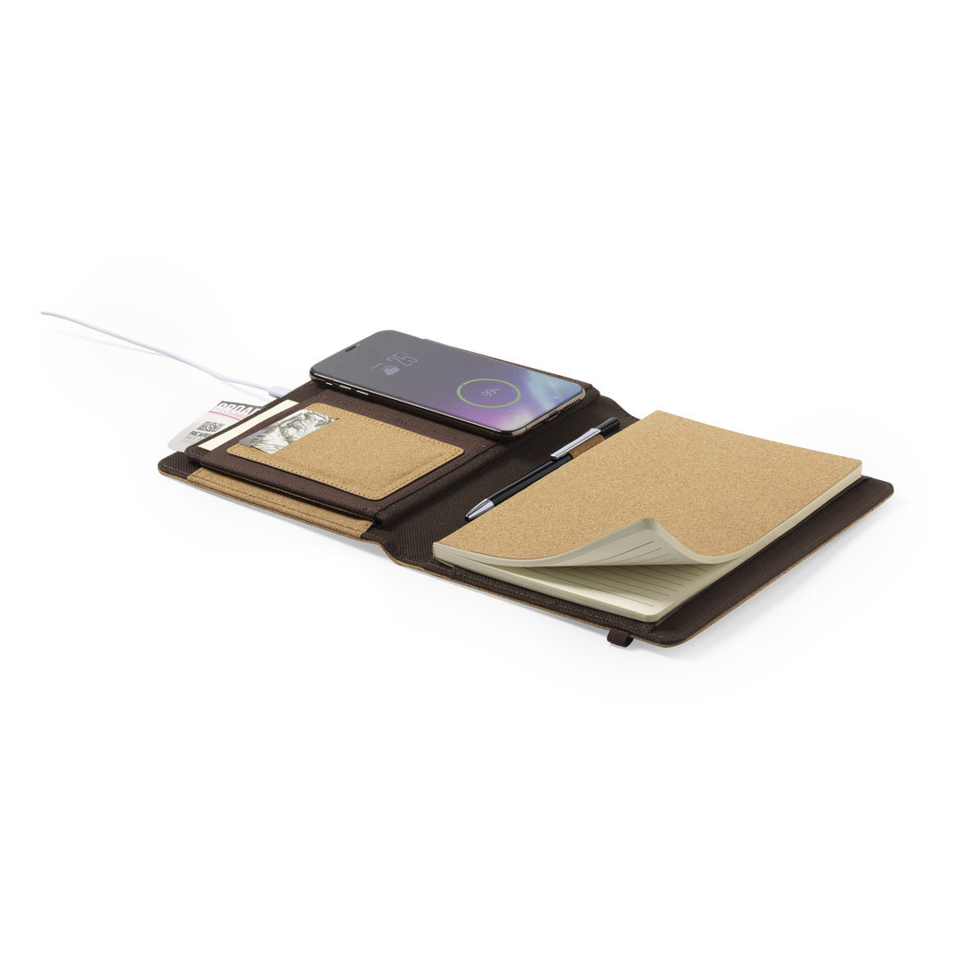 Naturlinie, Notizblock mit integriertem kabellosen Ladegerät. Umschläge aus Naturkork, in schlichtem Design, mit der Ladestation auf der Rückseite des Umschlags. 64-Blatt-Notizblock mit gestreiftem Layout. Kompatibel mit Geräten, die mit kabelloser Ladetechnik ausgestattet sind. Inklusive Mikro-USB-Ladekabel und erhältlich in einer attraktiven, umweltfreundlichen Design-Box.