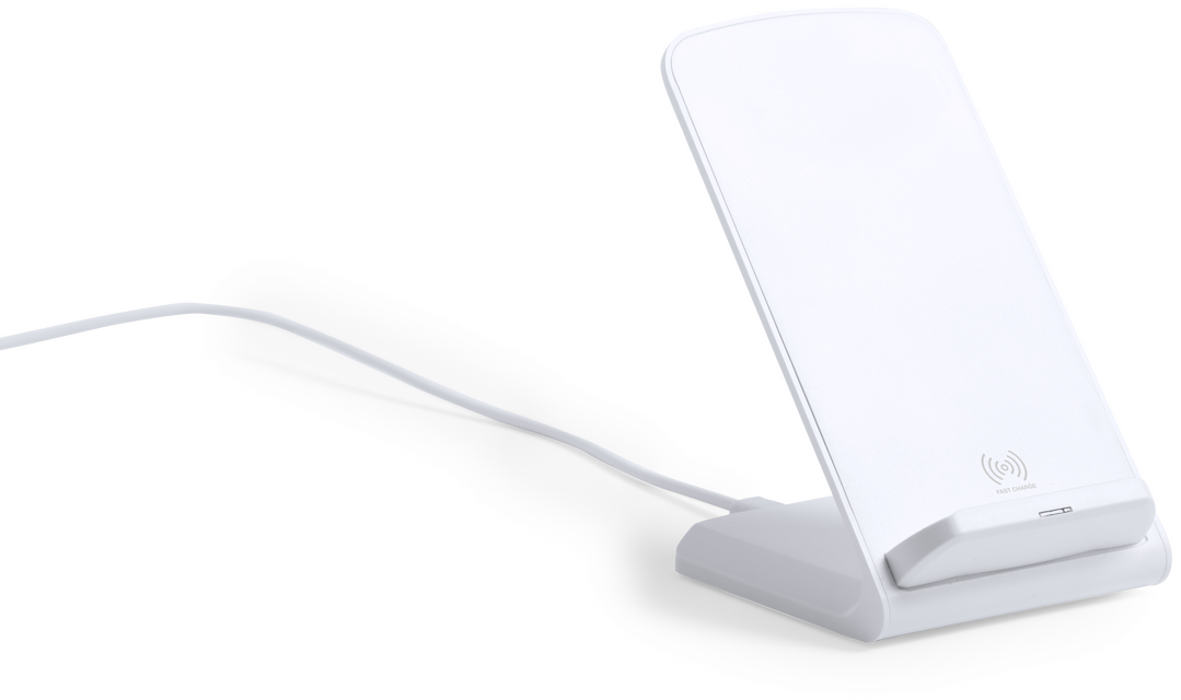 Drahtloses Ladegerät in elegantem Weiß, mit Smartphone-Halterungsfunktionalität. Mit Schnellladung, 10W-Funktion und kompatibel mit Geräten, die mit drahtloser Ladetechnologie ausgestattet sind. Großer Druckbereich und präsentiert in einer attraktiven, individuellen Design-Box.