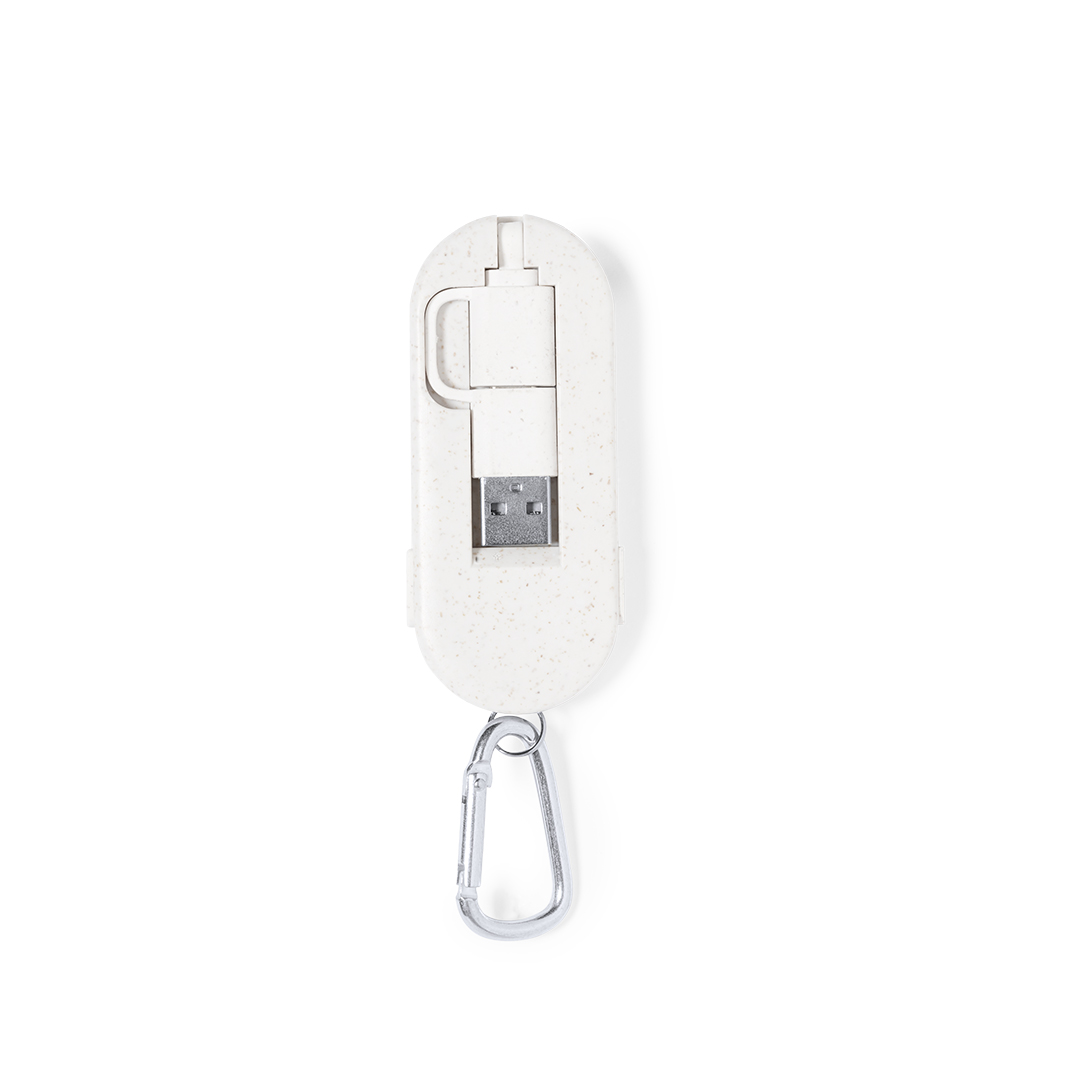 Ladekabel mit Karabiner aus Weizenfaser und Bambus. Mit Typ-C- und USB-Eingangsanschlüssen und Typ-C-, Lightning- und Micro-USB-Ausgängen. 5V DC 2A. Präsentiert in einer individuellen Kraft-Design-Tasche. Hergestellt aus pflanzlichen Elementen, um die Verwendung natürlicher Rohstoffe zu fördern und Schadstoffemissionen zu reduzieren.
