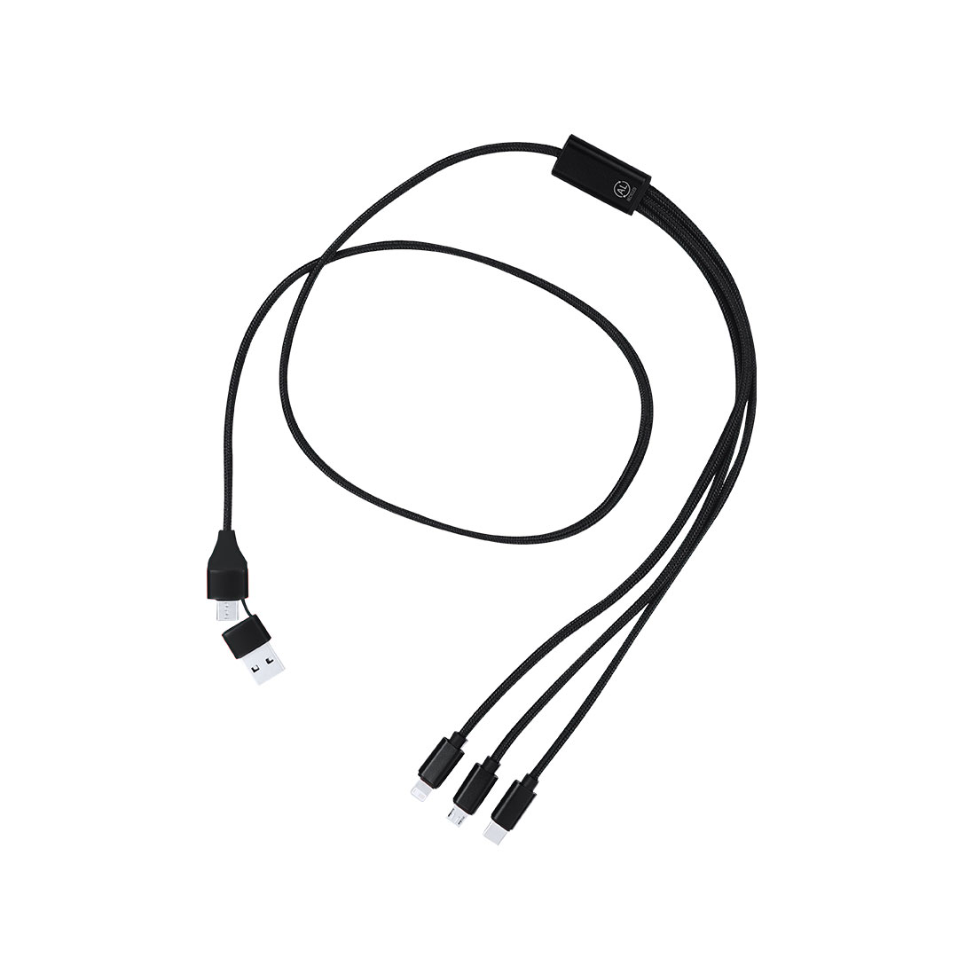 Ladekabel aus recyceltem Aluminium. Mit dualem Typ-C / USB-Eingang und Ausgängen Typ-C, Lightning und Micro-USB. Enthält ein Zeichen für recyceltes Aluminium. Recyceltes Aluminium ist ein Material mit nahezu unendlichen Recyclingmöglichkeiten, ohne dabei seine ursprünglichen Eigenschaften zu verlieren und weniger Energie in diesem Prozess zu verbrauchen. GRS-Zertifizierung (Global Recycled Standard), die die recycelte Herkunft des Materials garantiert, das zur Herstellung des Produkts verwendet wurde. Micro-USB-, Typ-C- und Lightning-Anschluss 5V DC 2.4A