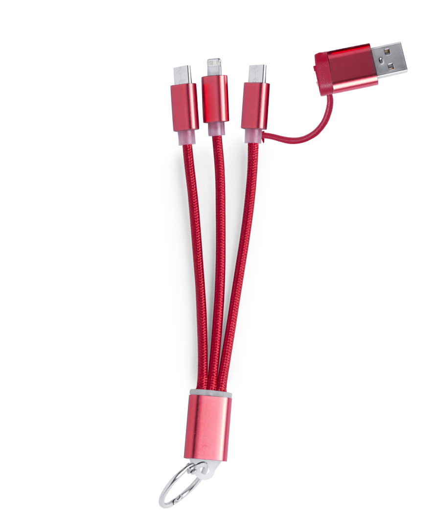 Ladekabel mit zwei Micro-USB / Lightning- und Typ-C-Anschlüssen (Eingang und Ausgang). Aluminiumanschlüsse und Metallplakette speziell für die Lasergravur entwickelt.
