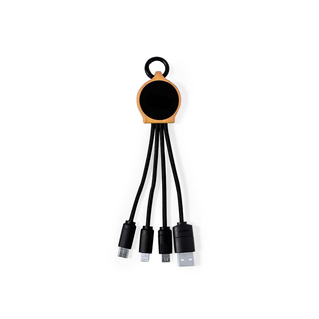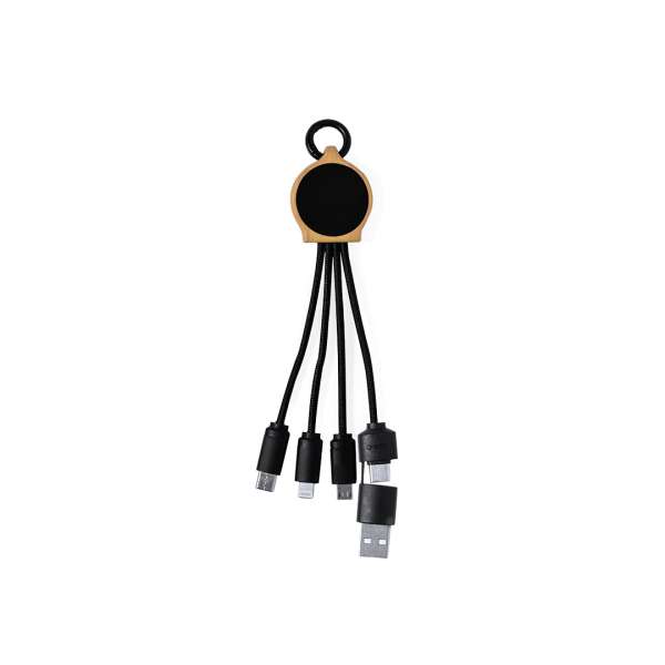Ladekabel aus Bambus und Oberfläche in elegantem Schwarz, mit LED-Innenbeleuchtung und einer Außenbeschichtung, die speziell für die Laserbeschriftung entwickelt wurde und so das Logo beleuchtet. Mit Typ-C- und USB-Eingangsanschlüssen und Typ-C-, Lightning- und Micro-USB-Ausgängen. 5V DC 2,4A. Präsentiert in einer individuellen Kraft-Design-Tasche.