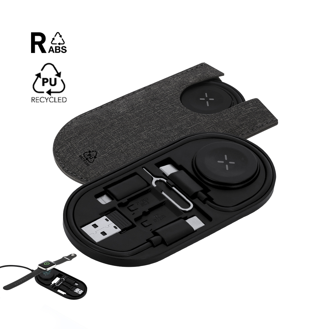 Set aus Ladekabeln aus recyceltem ABS (RABS). Enthält:- Drahtloses Laden für Smartwatch.- Multifunktionskabel mit USB-, Typ-C- und Lightning-Anschlüssen, kompatibel mit einer Vielzahl von Geräten und mit Datenübertragungsfähigkeit.- SIM-Ejektor mit Fächern für Lagerung von Nano SIM und TF-Karten. RAB ist ein hochgradig recycelbarer Kunststoff von großer Festigkeit und mit zahlreichen Anwendungen, der es zu einer umweltfreundlichen Lösung macht. Mit RCS-Zertifizierung, die die recycelte Herkunft gewährleistet und mit geprägtem RABS-Logo.