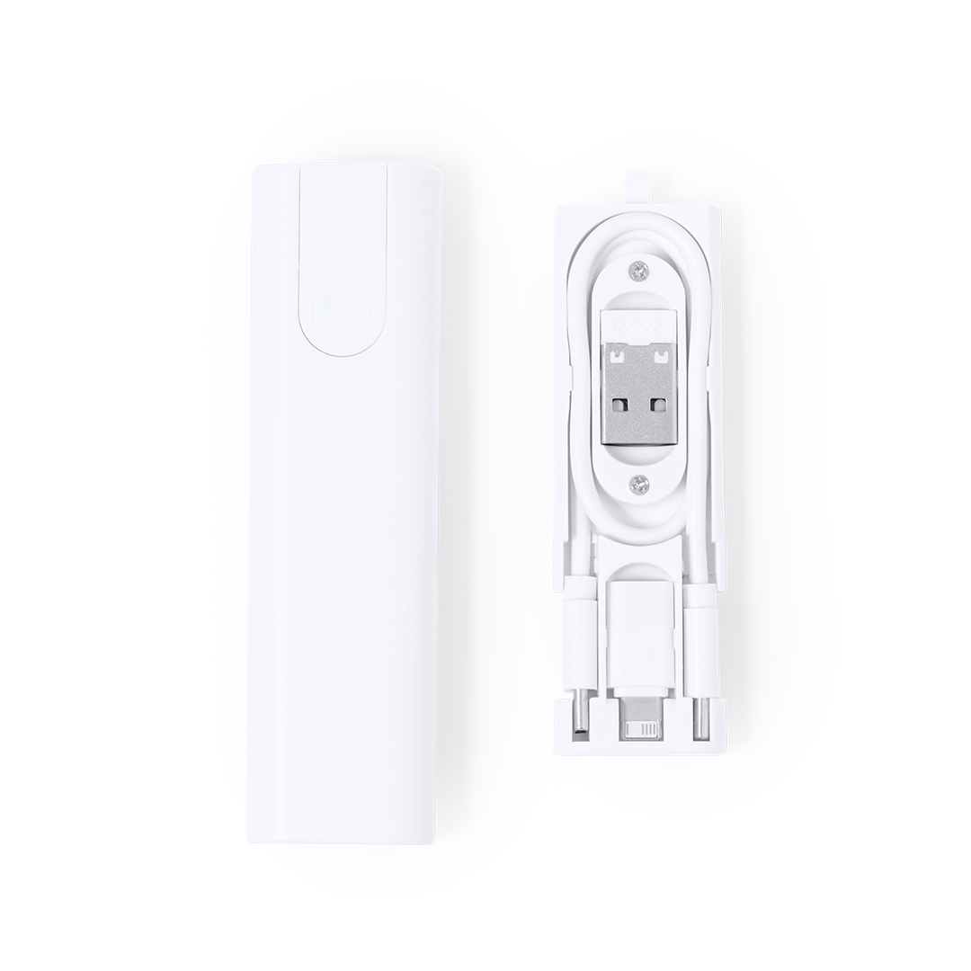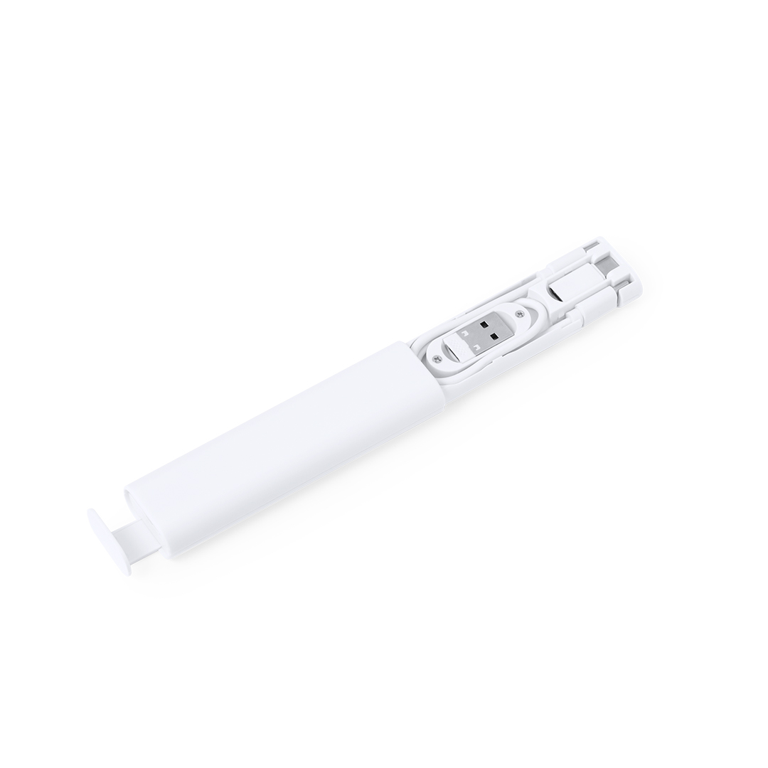 Kompletter Satz Ladekabel. Verpackt in einem kompakten Gehäuse aus widerstandsfähigem weißem ABS mit integrierter Smartphone-Halterung. Inklusive Ladegerät und Sync-Kabel, geeignet für die Datenübertragung und mehrere Verbindungen: Micro USB, Typ C und Lightning; SIM-Auswerfer enthalten. 5V DC 3A. Präsentiert in einer Kraft-Design-Box.