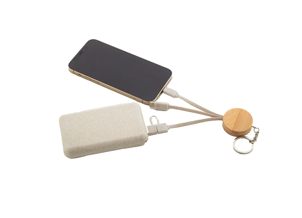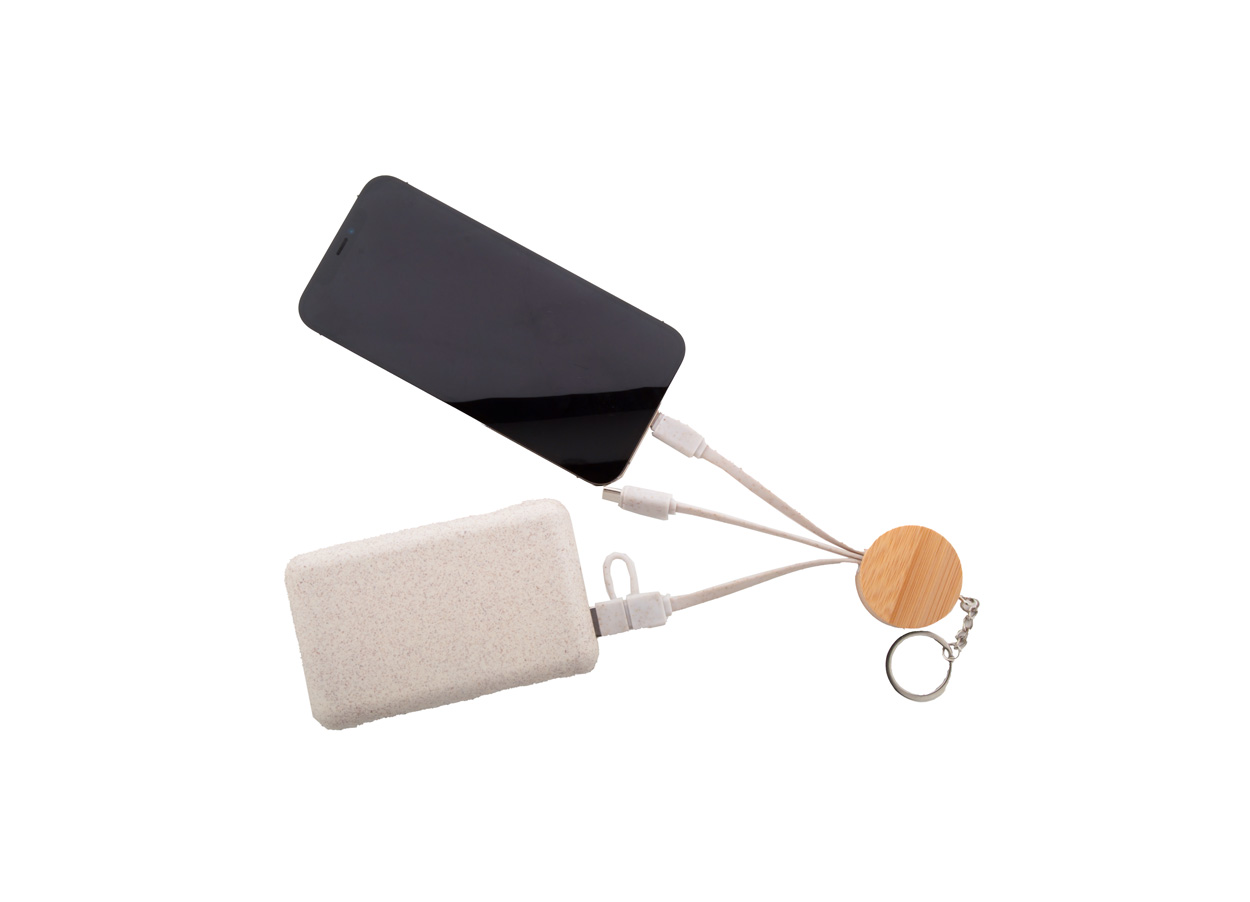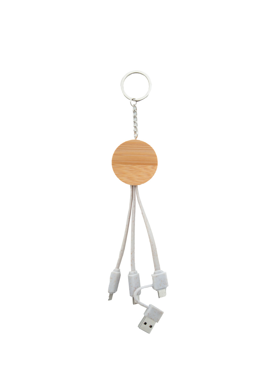 USB Ledekabel / Schlüsselanhänger aus ökologischem Weizenstrohkunststoff und Bambus mit Mikro-USB, USB-C und Lightning-Steckern sowie USB und USB-C Eingangsbuchsen.