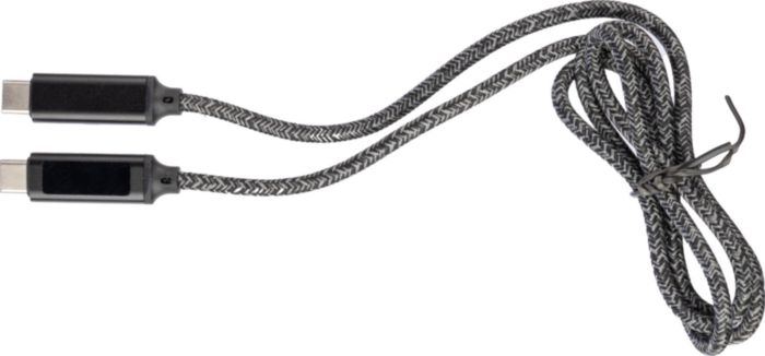 Ladekabel aus Nylongewebe mit Aluminiumbuchsen. Länge: 1 Meter. USB-C auf USB-C. Kapazität: 65 W. Blaues Licht zur Anzeige der Ladegeschwindigkeit an einer Buchse. Datenübertragungsrate 480Mbps.