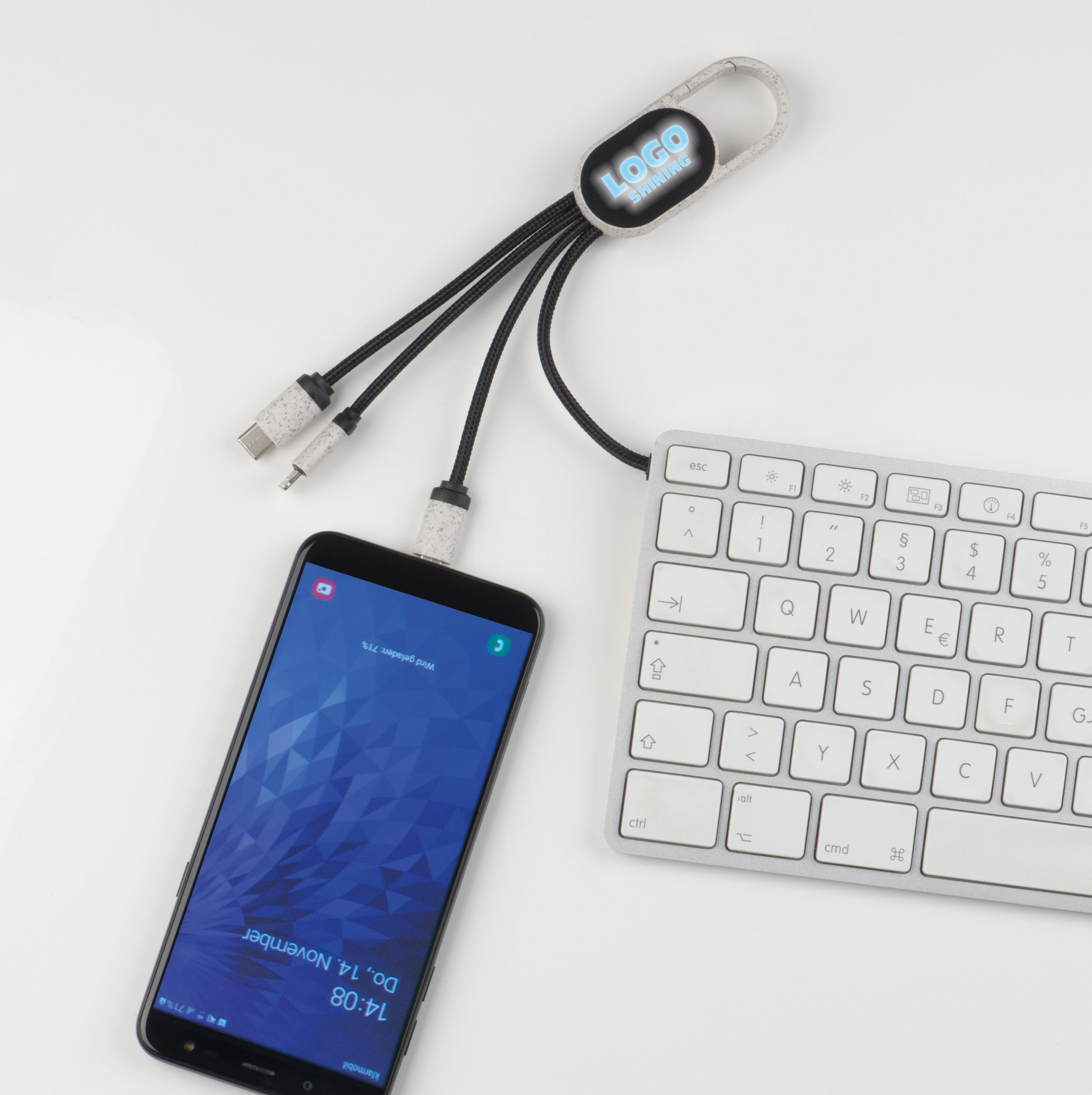 3in1 Ladekabel aus Weizenstroh mit USB Ladekabel, Micro USB, C Type, iOS und 8 Pin Stecker. Ihre Werbung gravieren wir auf die schwarze Fläche, somit leuchtet das Logo während des Ladevorgangs.