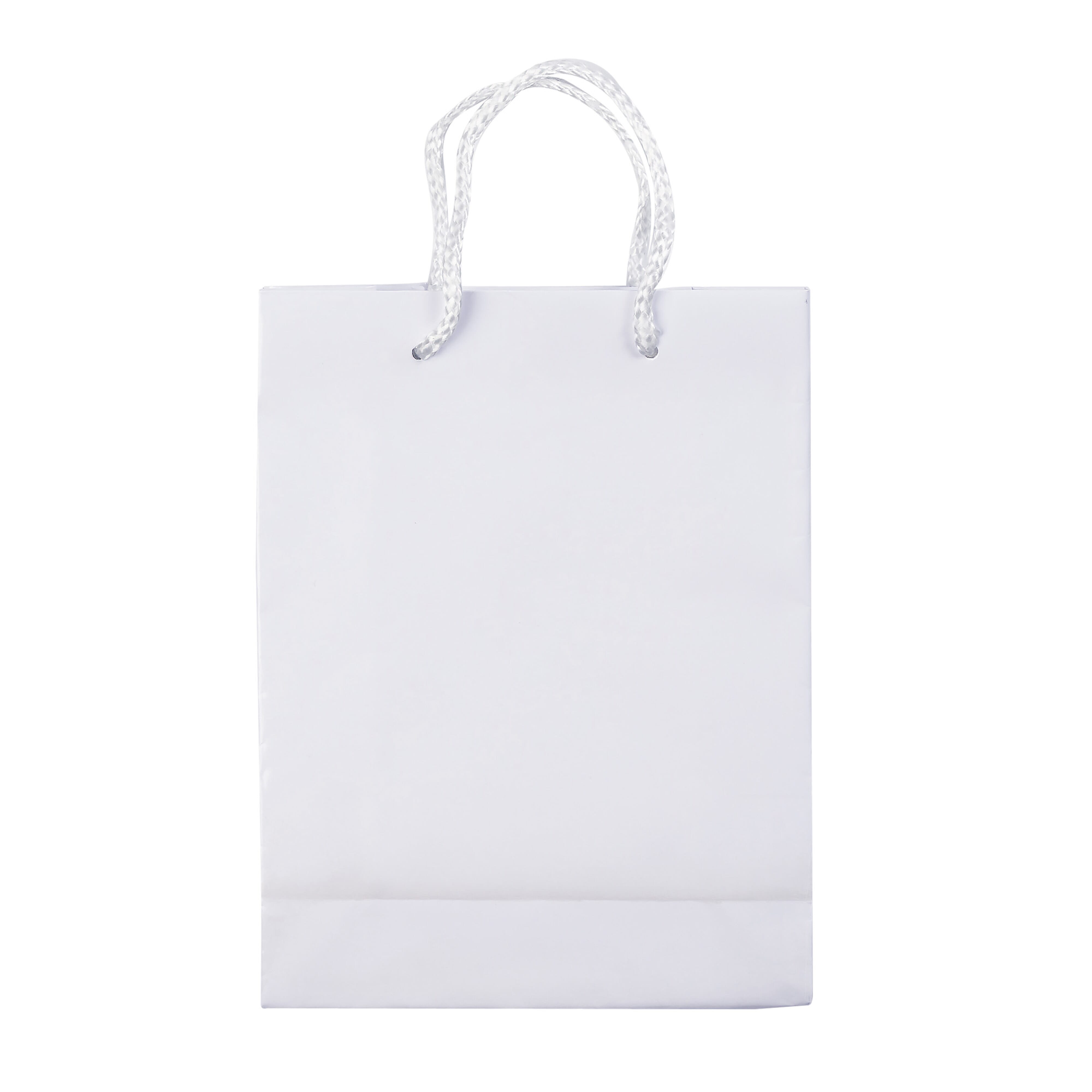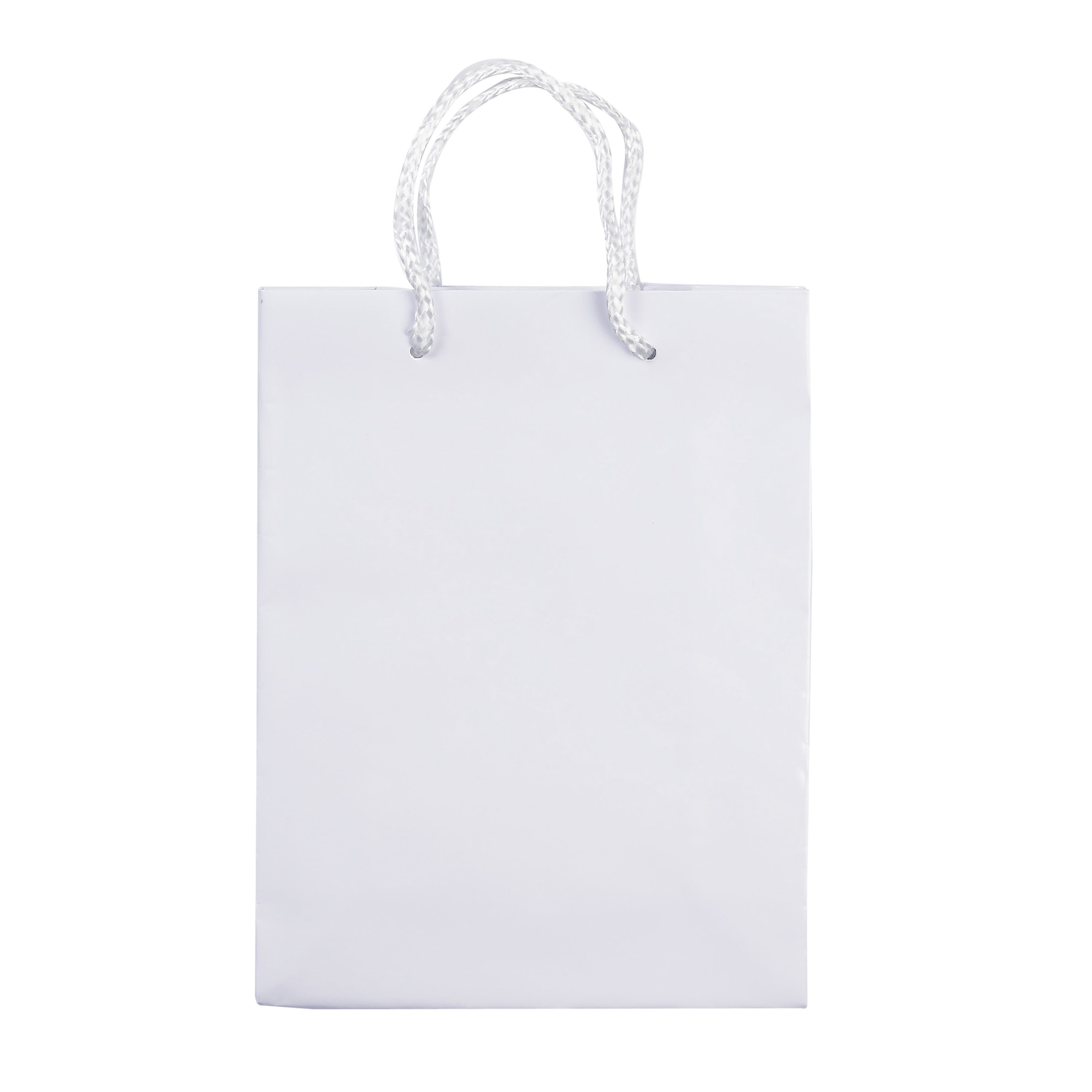 Kleine Papiertüte mit Seilgriffen. Erhältlich in mehreren Farben mit Riemen in Schwarz oder Weiß. Stark und für kleine Artikel geeignet. Glänzende Laminierung.