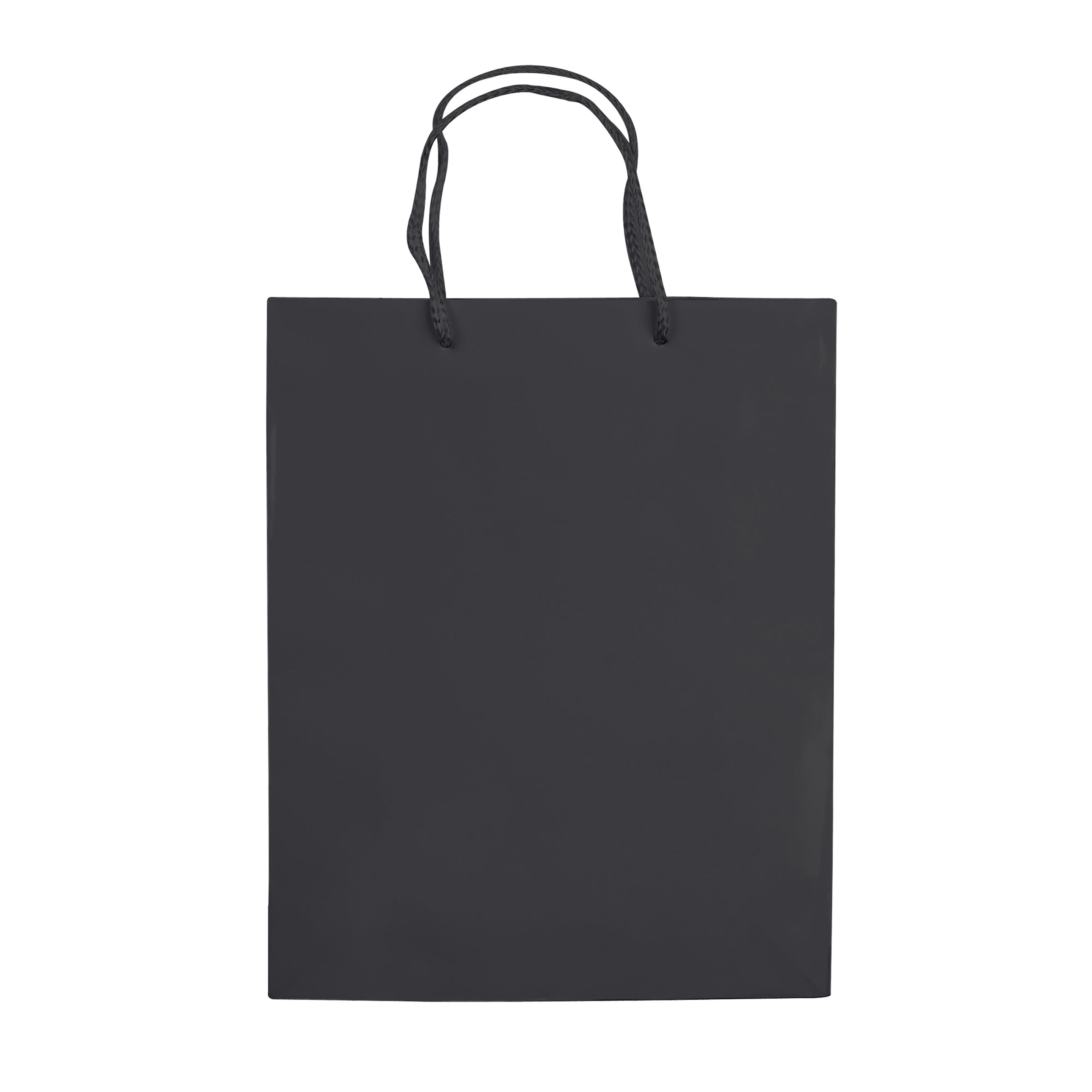 Mittelgroße Papiertüte mit Seilgriffen. Erhältlich in mehreren Farben mit Riemen in Schwarz oder Weiß. Große Druckfläche auf beiden Seiten. Starke Tasche. Glänzende Laminierung.