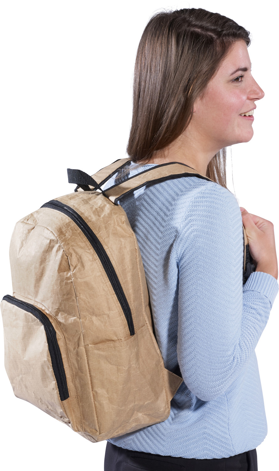 Laminierter Papier Rucksack 'Mate' mit einer silberfarbigen Folie, die der Isolierfunktion dient. Die große Tasche hat einen Reißverschluss, sowie die kleine Tasche vorne. Die Schultergurte sind verstellbar.