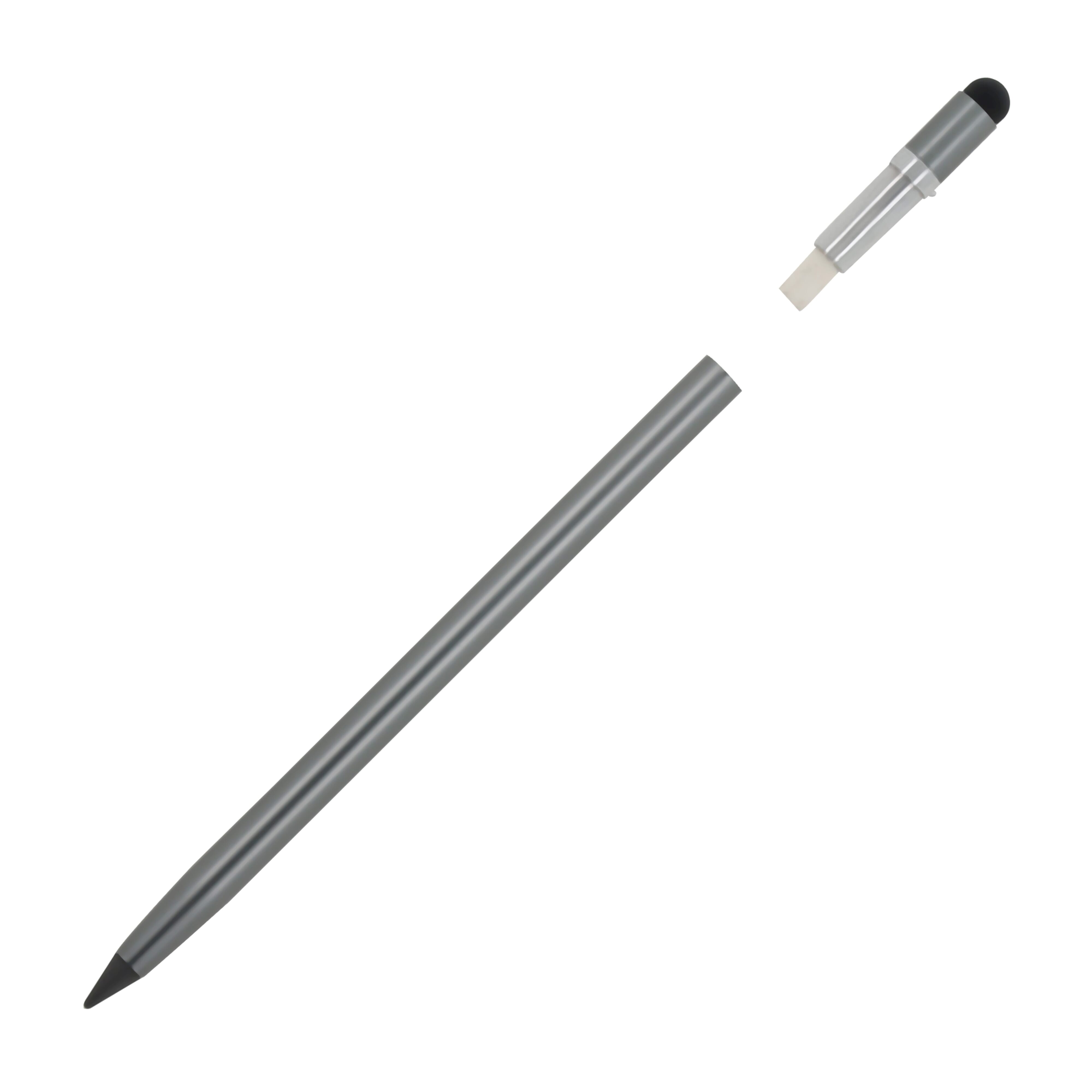Aluminiumbleistift mit Radiergummi als Ersatz für den herkömmlichen Bleistift. Dieser langlebige Bleistift hat eine Graphitspitze. Er schreibt wie ein herkömmlicher Bleistift und kann auch ausradiert werden. Die Spitze muss nicht angespitzt werden und nutzt sich sehr langsam ab, wodurch der Bleistift bis zu 100 Mal länger hält als ein herkömmlicher Bleistift.