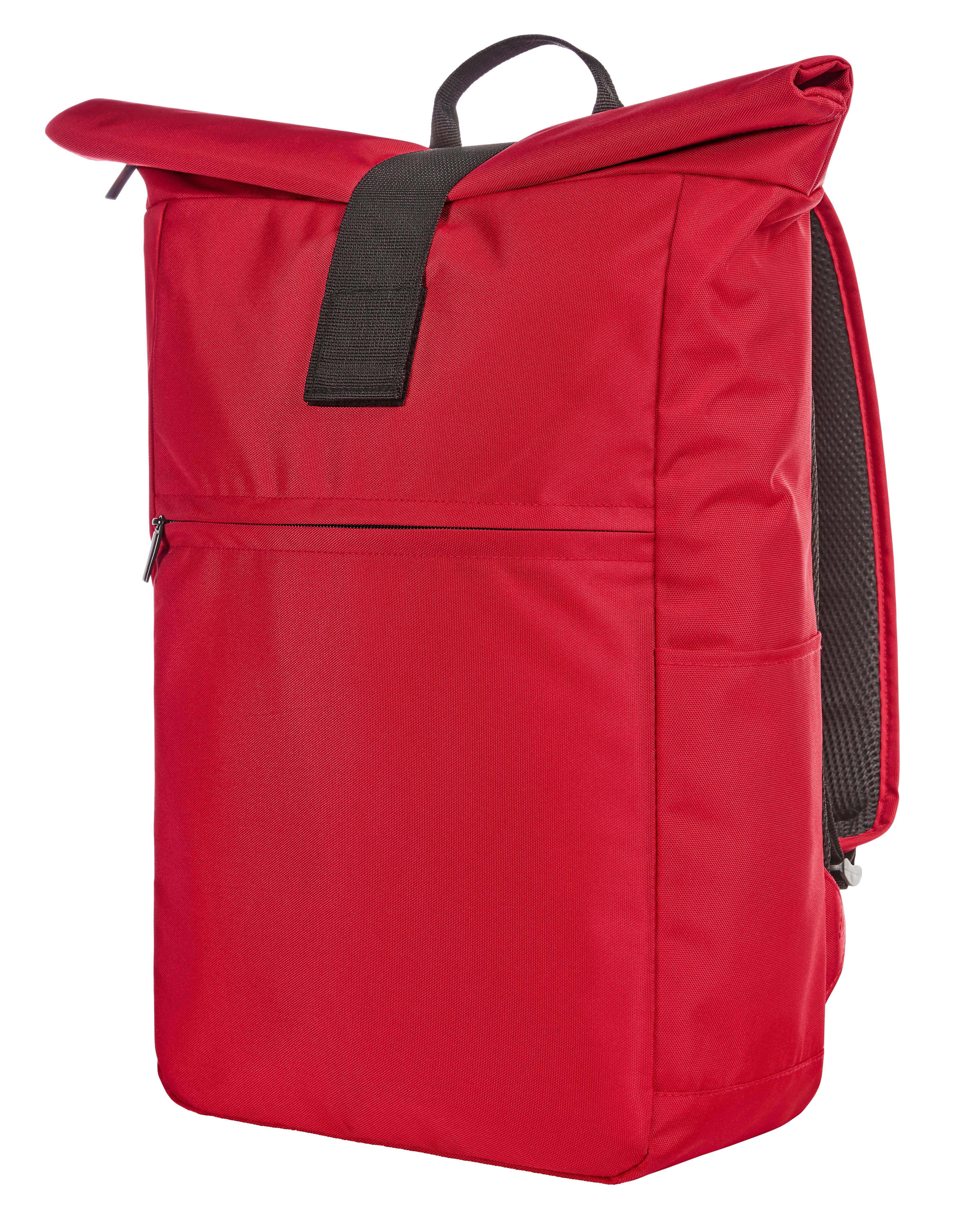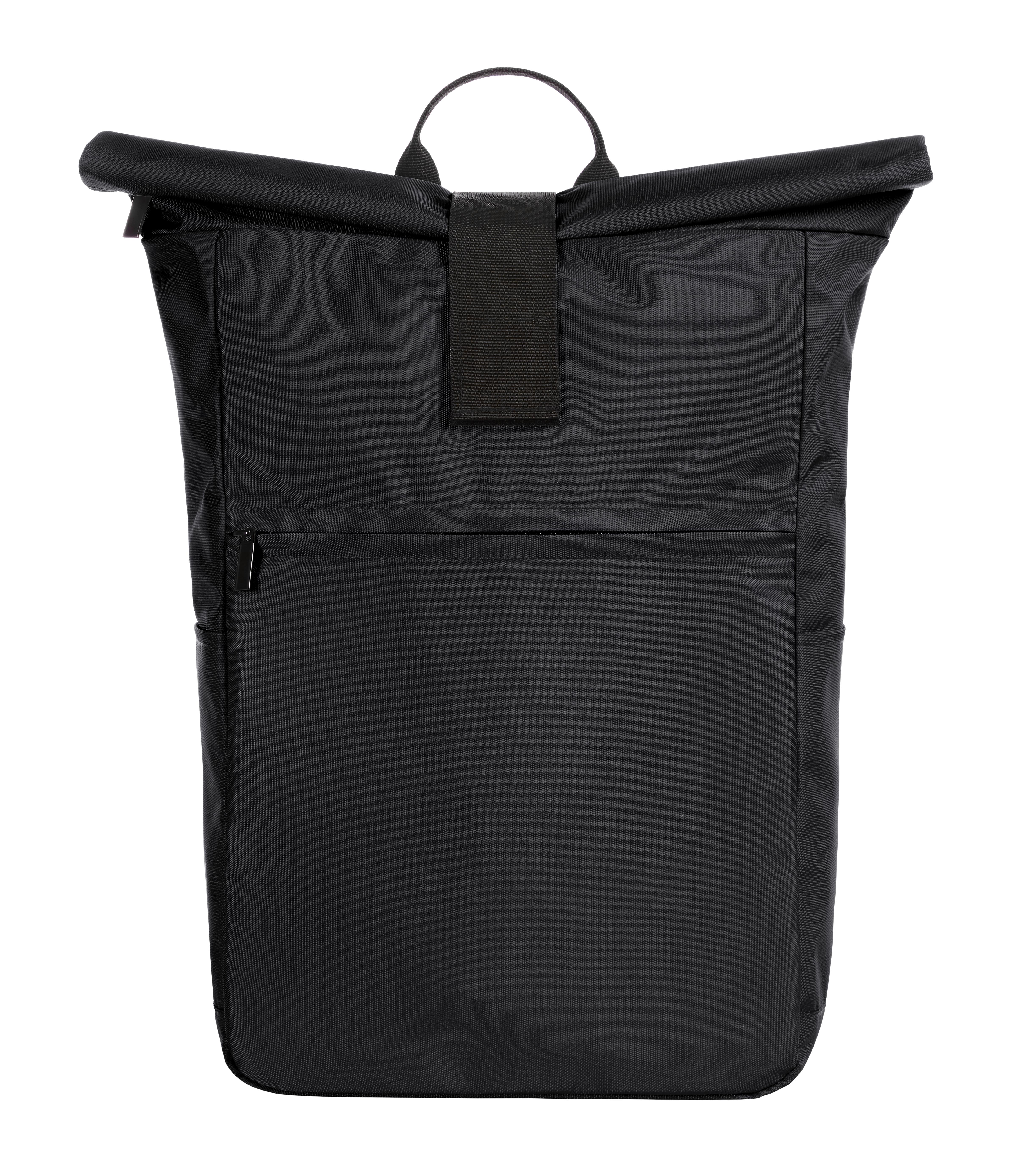 Urbaner Überschlag-Rucksack; großes Hauptfach mit Reißverschluss und zusätzlicher Klettlasche; RPET-Obermaterial; gepolstertes Notebookfach und flaches Einsteckfach innen; große Reißverschluss-Vortasche auf der Front; zwei seitliche Einsteckfächer für z. B. Trinkflaschen; gepolstertes Tragesystem; Handgriff
