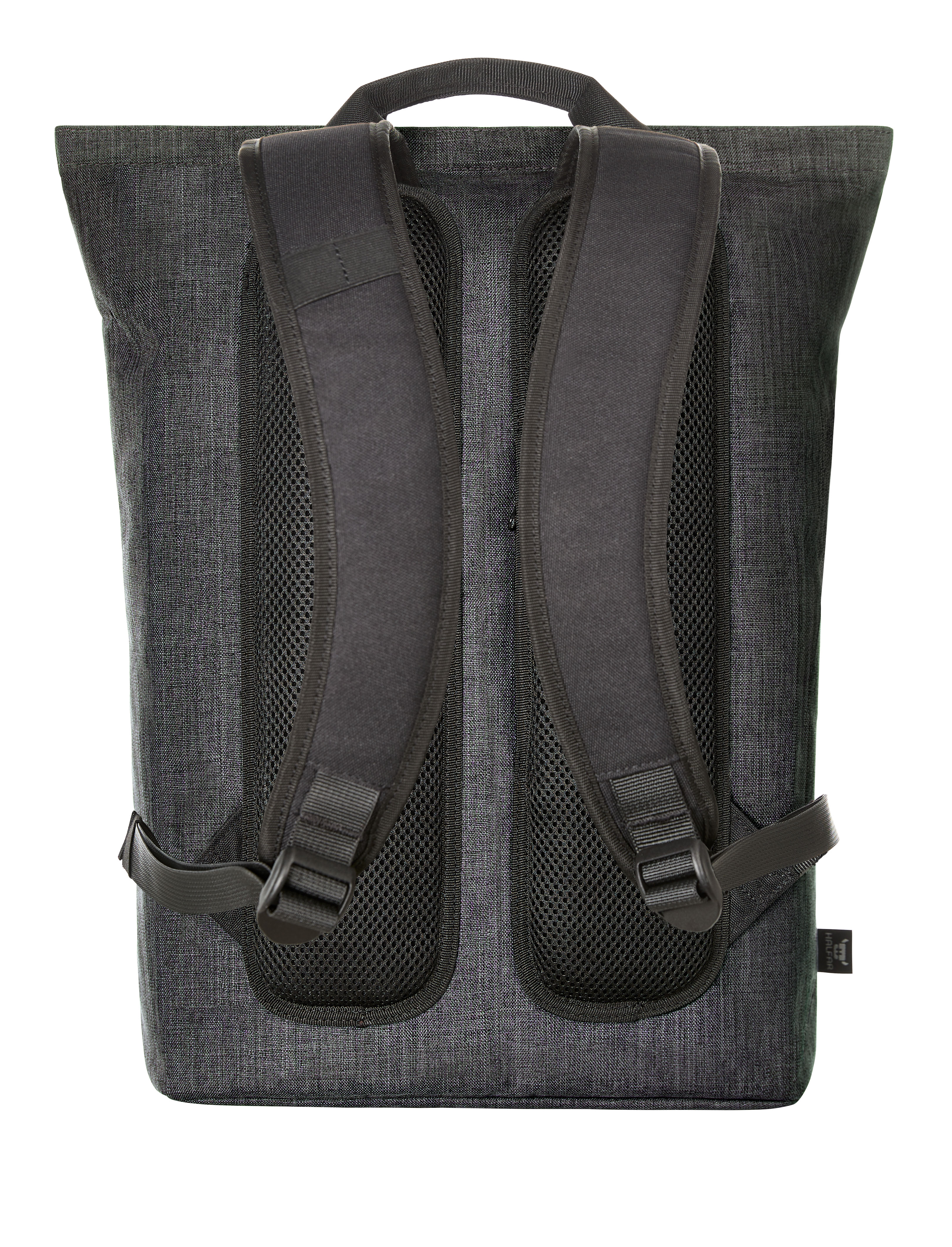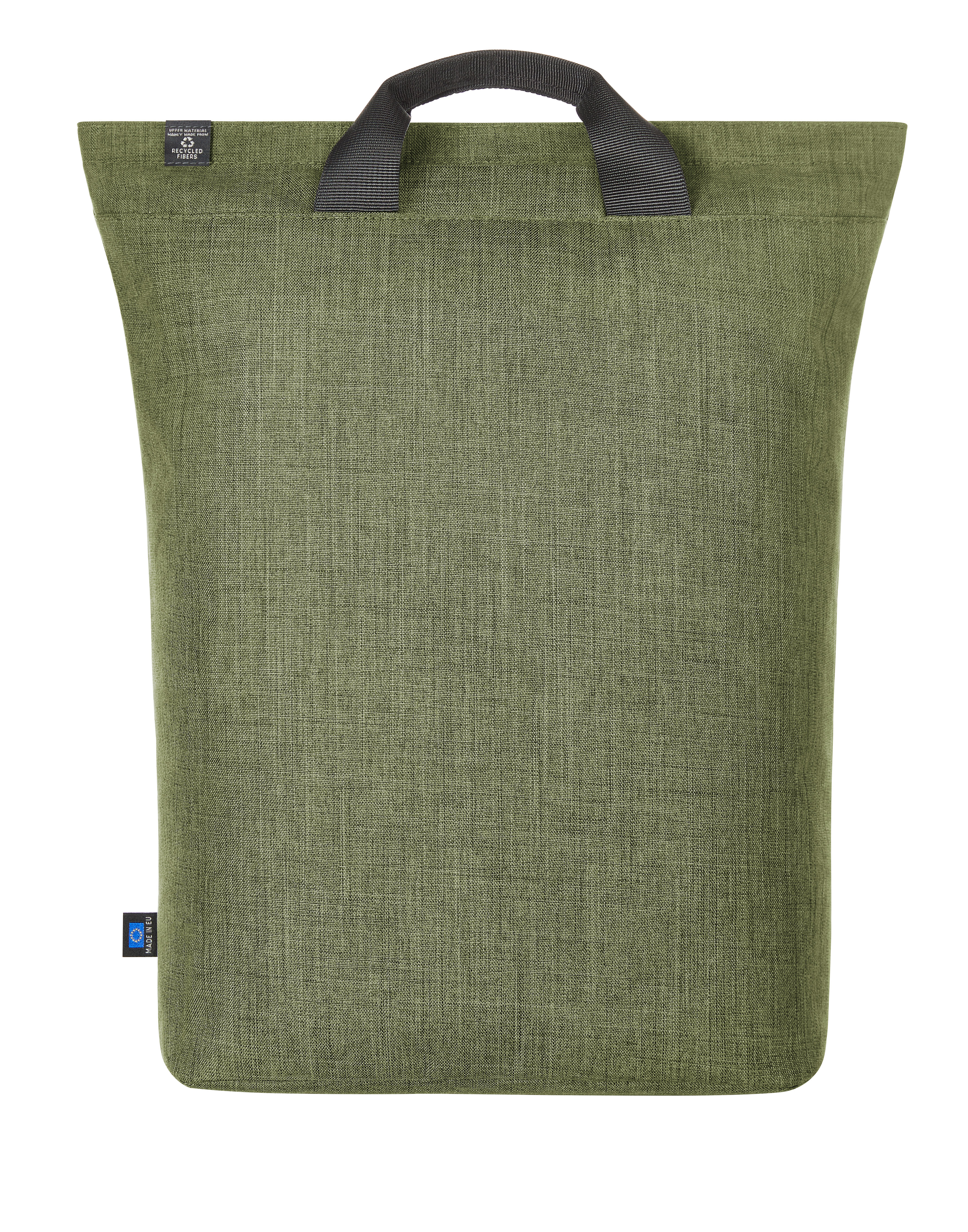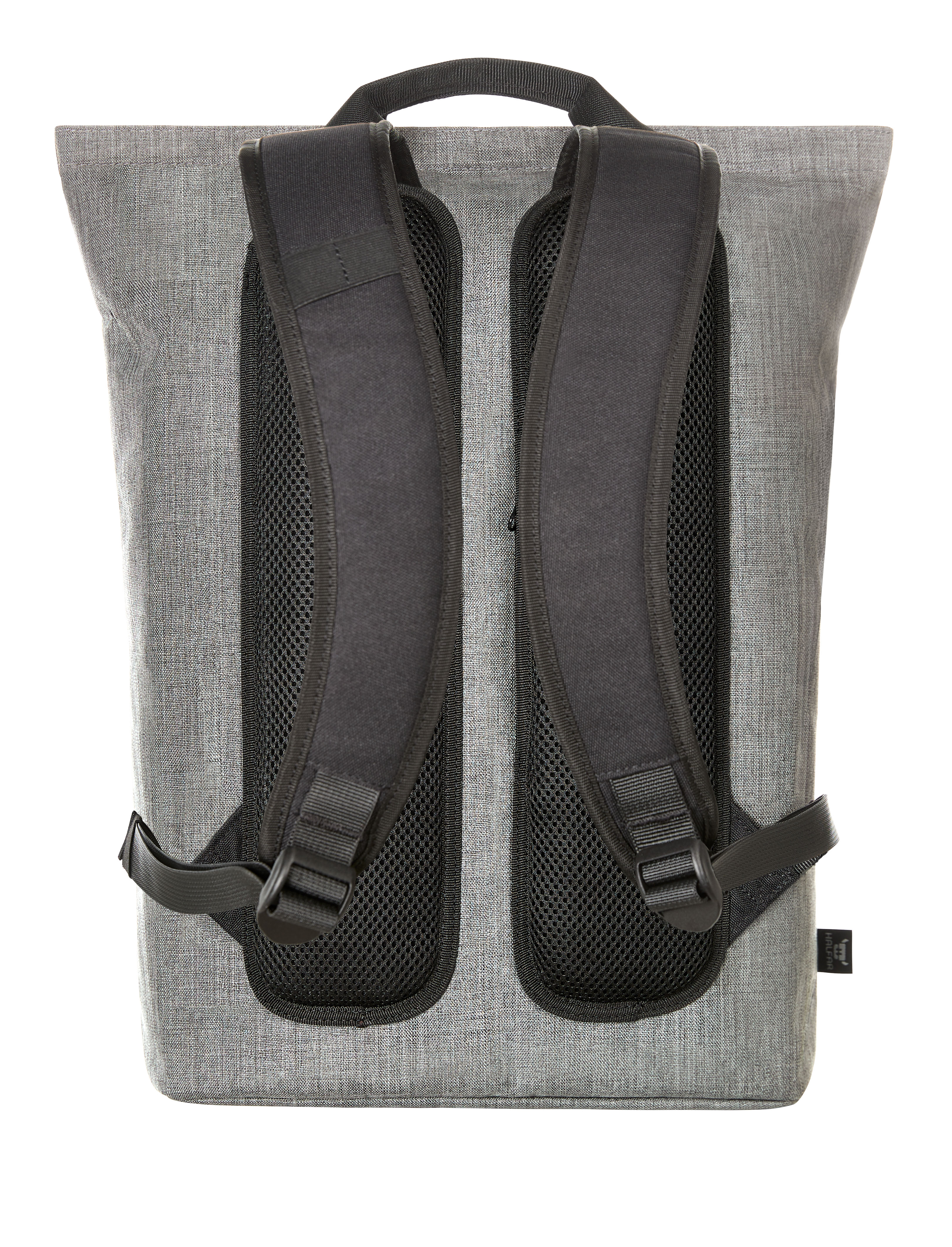 Gradliniger, moderner Rucksack; Reißverschluss-Hauptfach mit gepolstertem Notebookfach; rPET Obermaterial; wertige Metall-Accessoires; gepolsterter Boden; aufwändig gepolsterter Rücken mit verstecktem Reißverschlussfach; längenverstellbare gepolsterte Schultergurte mit Gummischlaufen zum Befestigen von z. B. Sonnenbrille; Handgriffe