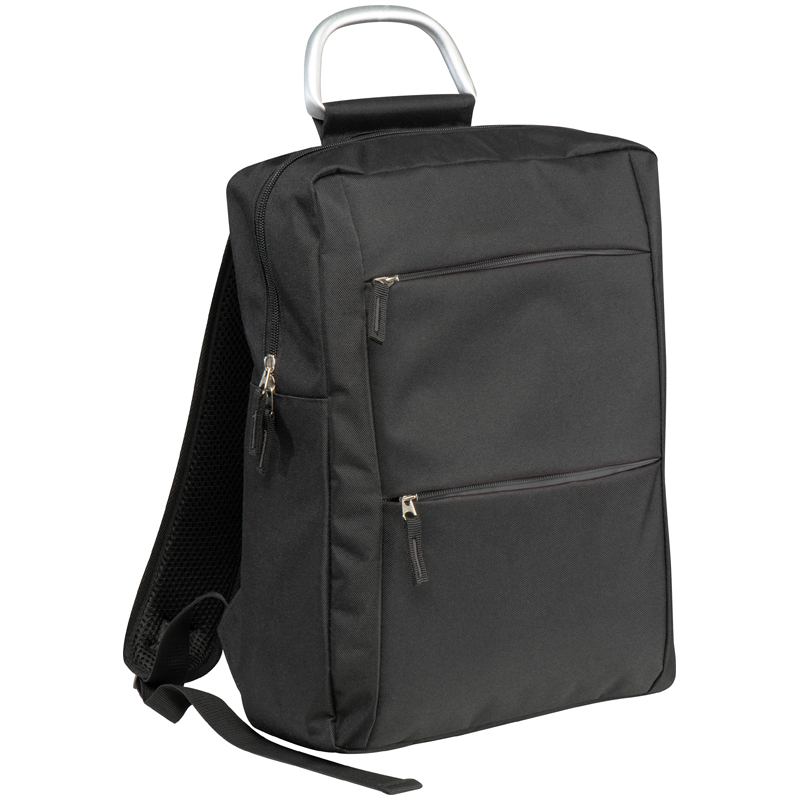 Laptoprucksack aus 600D Polyester im neuen attraktiven Design. Viele Innenfächer und 2 Außenfächer. Ihre Werbung drucken wir auf das Mittelteil.