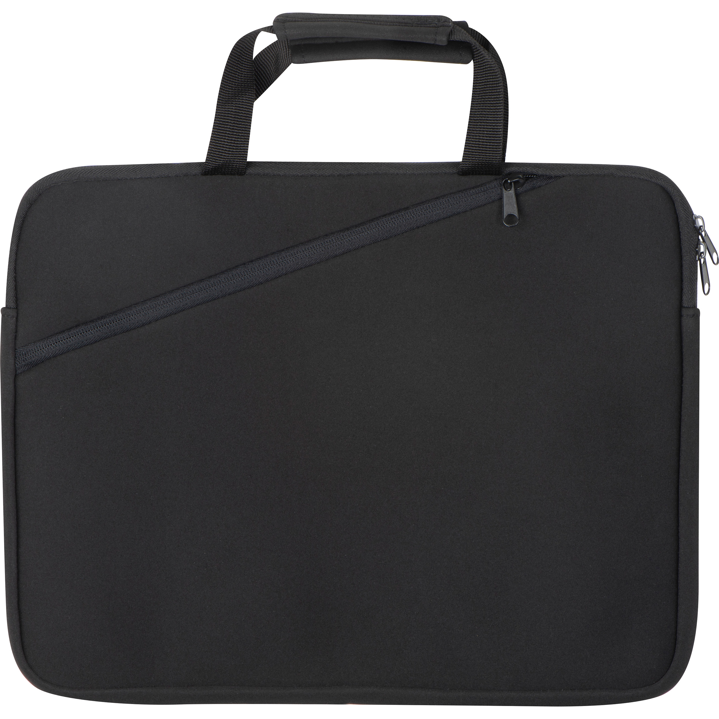 Laptoptasche aus Neopren Softshell mit Reißverschlüssen, gepolsterten Tragehenkeln und Vorfach. Die Werbung wird auf das Vorfach gedruckt.