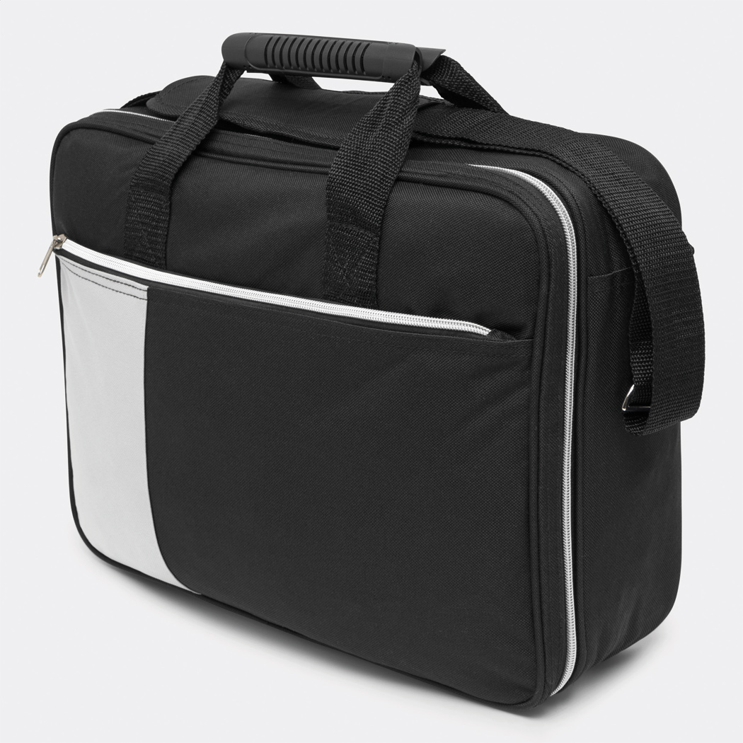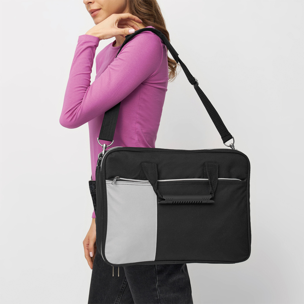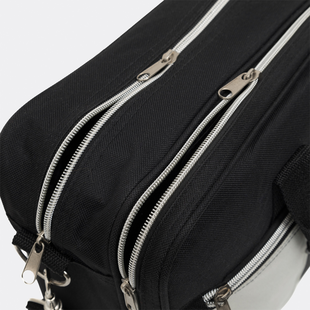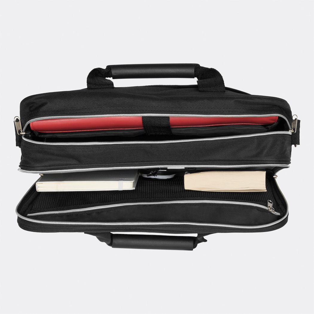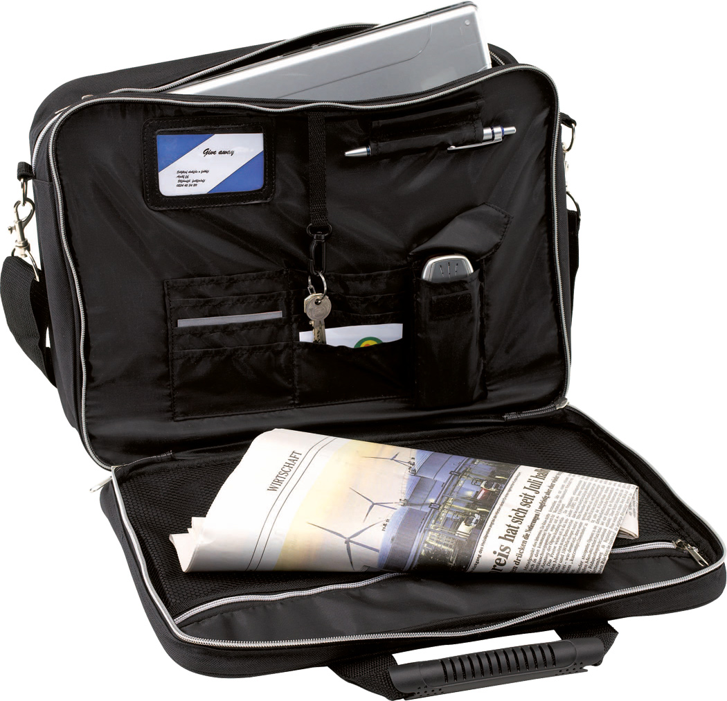 Laptoptasche MEETING: erstes Reißverschluss-Hauptfach mit gepolstertem Laptopfach, zweites Reißverschluss-Hauptfach mit umfangreichem Organizer, 1 Reißverschluss-Vorfach, 1 rückseitiges Klettverschluss-Einsteckfach (mit Sichtfenster für 1 Visitenkarte) mit Boden-Reißverschluss als Reporterfunktion