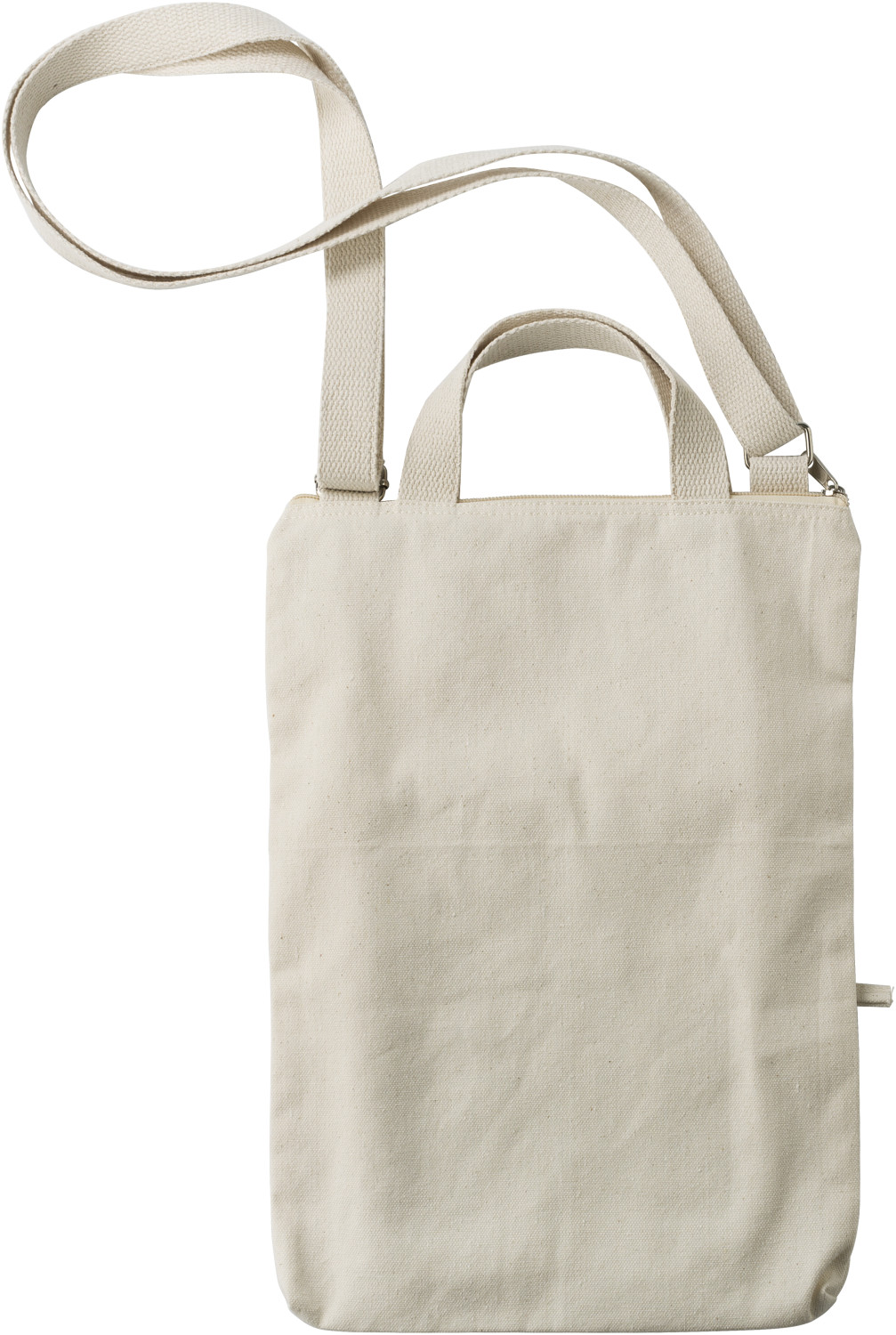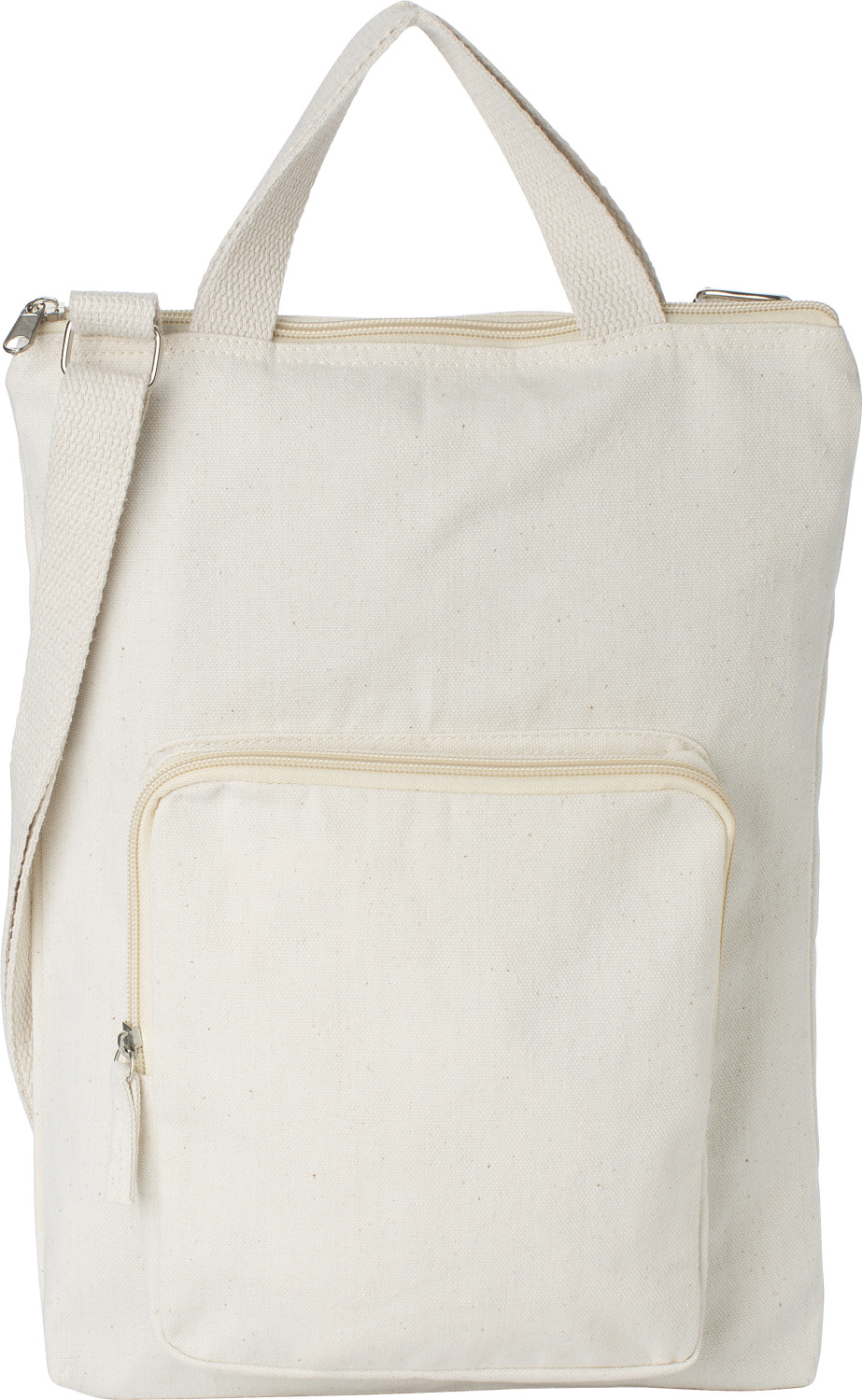 Laptoptasche aus Baumwolle (340 g / m²) (15 Zoll). Ein großes Fach mit Reißverschluss, kleine Fronttasche mit Reißverschluss. Zwei kurze Griffe und ein verstellbarer Schultergurt.