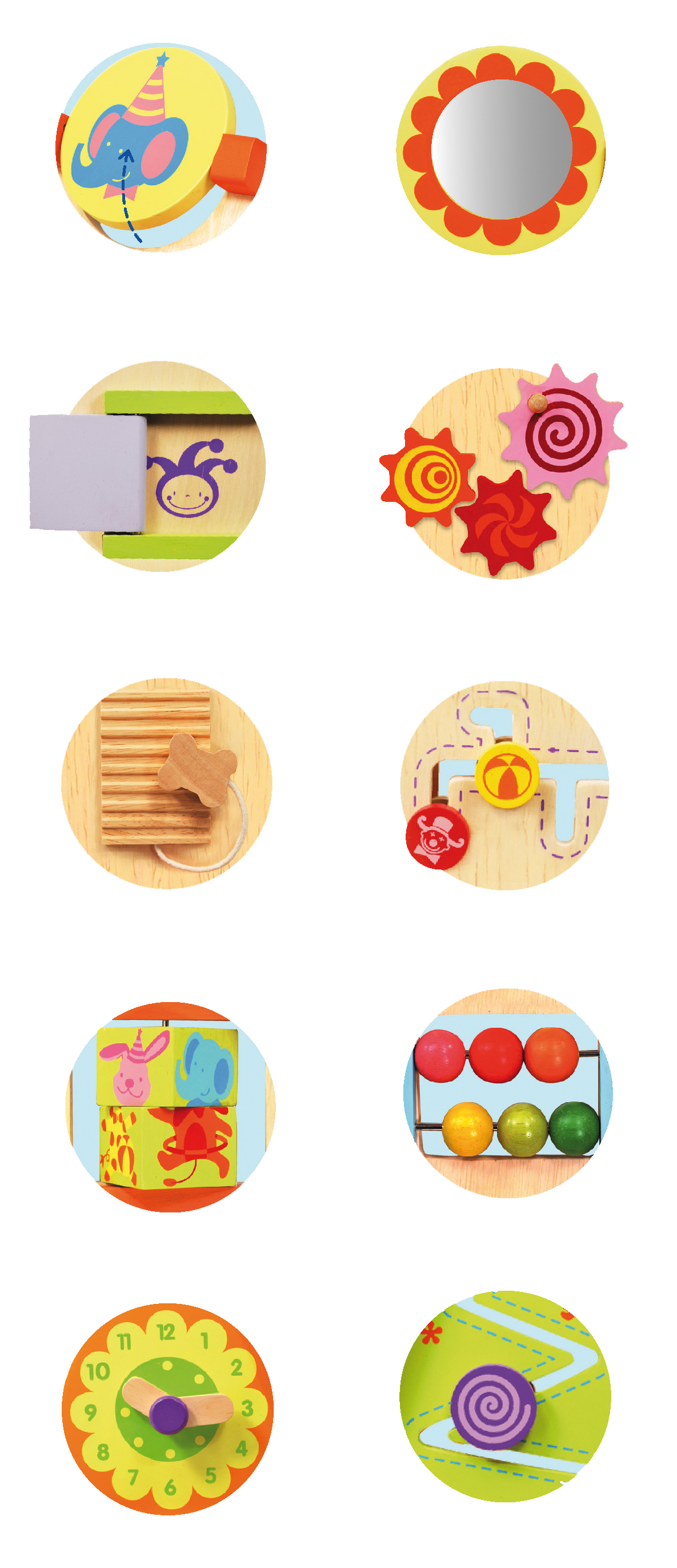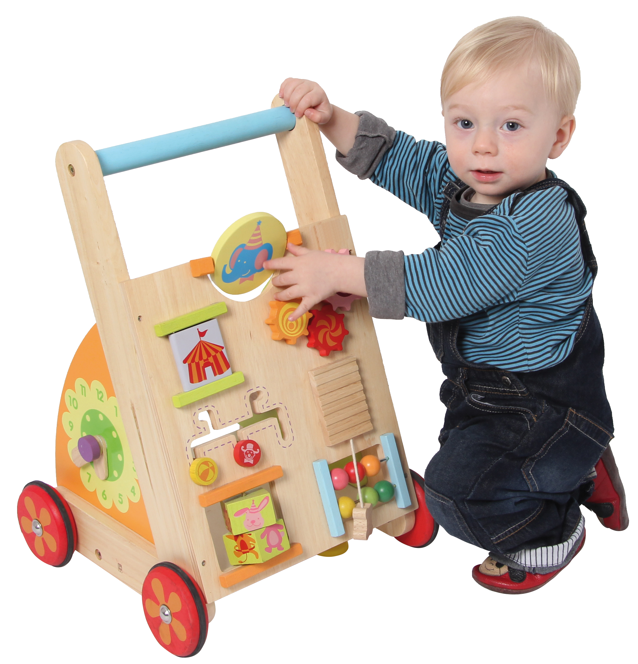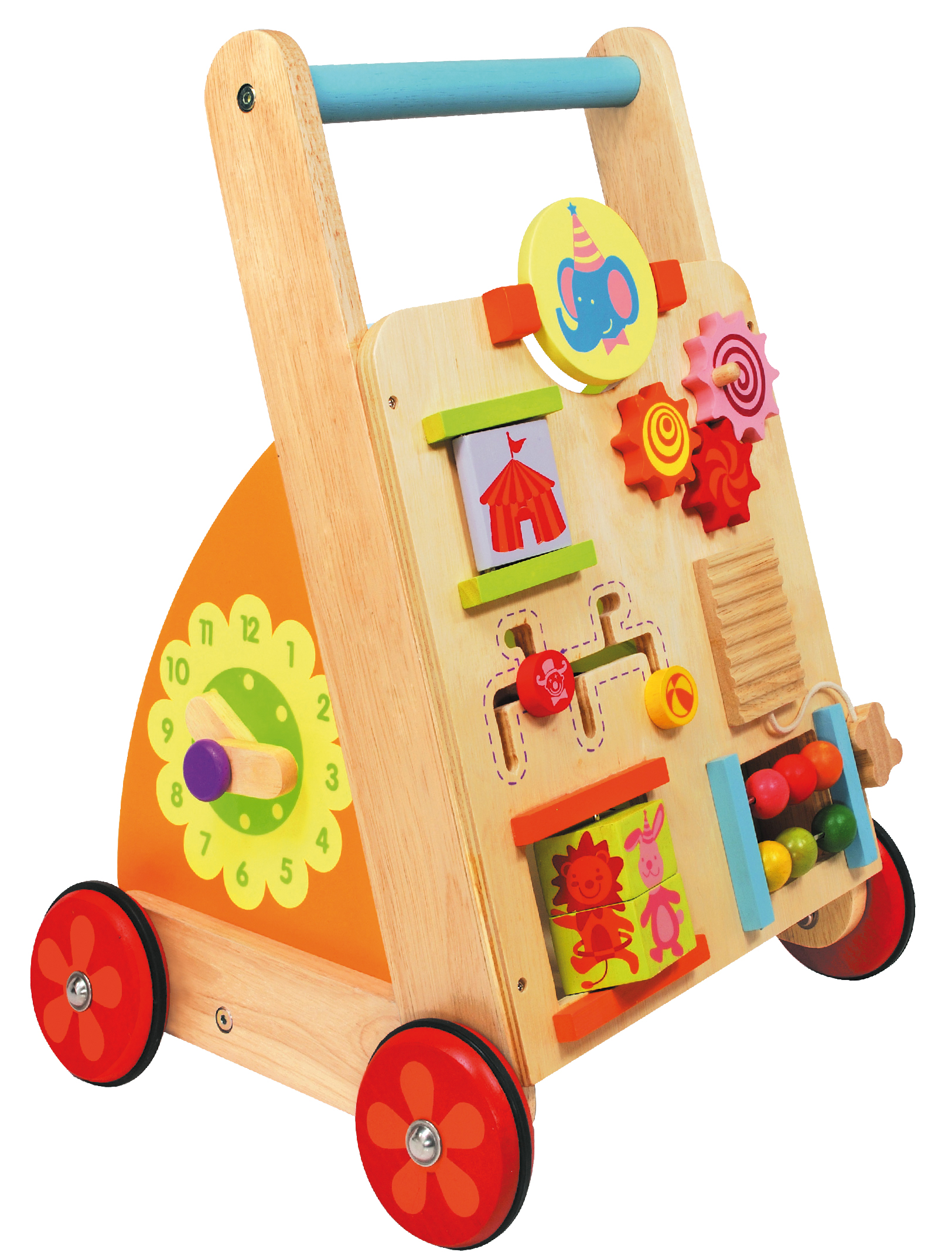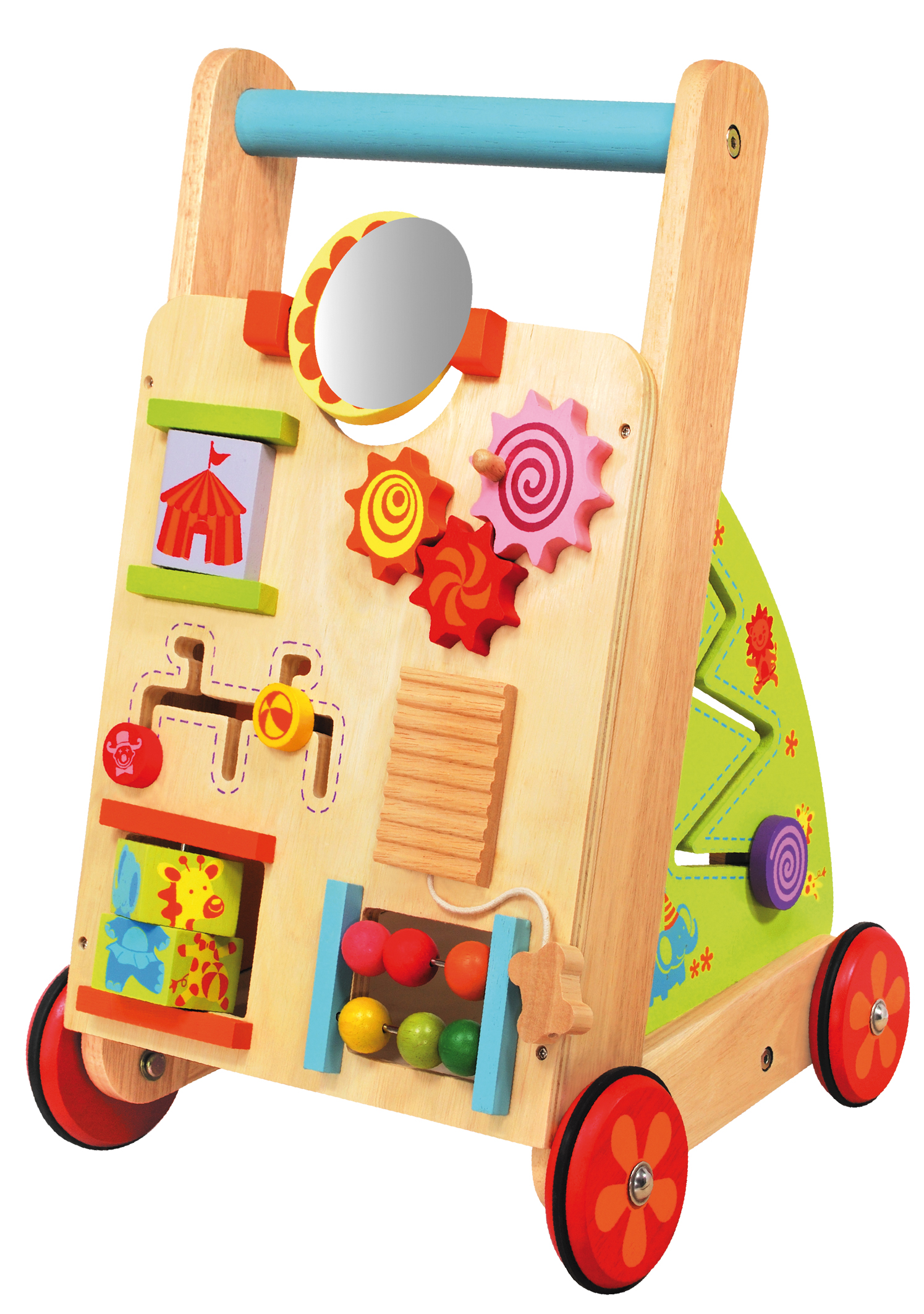 Multifunktionelles Spielgefährt aus Gummibaumholz für kleine Entdecker ab 19 Monaten. Mit vielen Lernspielideen: Lernuhr, Kinderspiegel, Zählrahmen, Zahnräder, Drehscheibe, Drehwürfel Waschbrett, Motorikspiele. Griffhöhe: 50 cm.