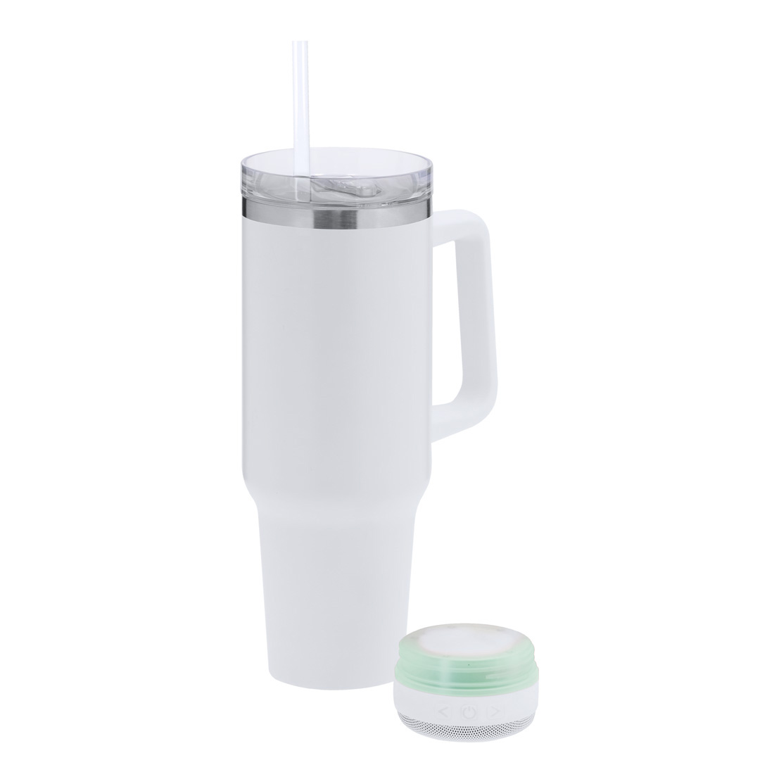 Thermobecher mit integriertem Bluetooth® 5.3 Lautsprecher von 3W. Mit einer Kapazität von 1,25L, ergonomischem Griff und aus doppelwandigem Edelstahl gefertigt, gewährleistet er maximale Haltbarkeit und eine hervorragende Temperaturerhaltung für sowohl kalte als auch heiße Getränke. Ideal für den Schreibtisch, Tisch oder jede Oberfläche, auf der man sein Lieblingsgetränk in Ruhe genießen kann. Der Deckel verfügt über einen Schnappverschluss und einen leicht zu öffnenden Spender, BPA-frei, was Sicherheit und Benutzerfreundlichkeit gewährleistet. Er verfügt über eine passende rutschfeste Basis für mehr Stabilität. Der in die Basis des Bechers integrierte Bluetooth-Lautsprecher ist dank seines Schraubsystems leicht abnehmbar und enthält eine intelligente RGB-LED-Beleuchtung, die sich im Rhythmus der Musik synchronisiert und ein einzigartiges visuelles und auditives Erlebnis schafft. Außerdem ermöglicht die Freisprechfunktion das Annehmen von Anrufen, ohne das zu unterbrechen, was man gerade tut.
