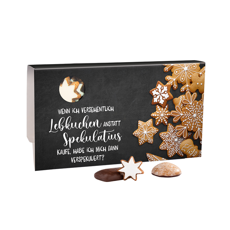 Haeberlein-Metzger Lebkuchenmischung im Werbeschuber aus weißem Karton, individuell bedruckt. Inhalt: Lebkuchenmischung von Haeberlein-Metzger mit 8 verschiedenen Sorten, 150 g Saisonartikel - solange der Vorrat reicht!