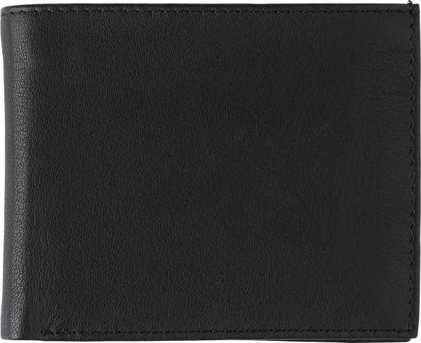 RFID-Geldbörse aus Leder (Ziegenleder) mit Münzfach, das mit einem Druckknopfverschluss verschlossen wird, und verschiedenen anderen Fächern für Bargeld oder Karten.