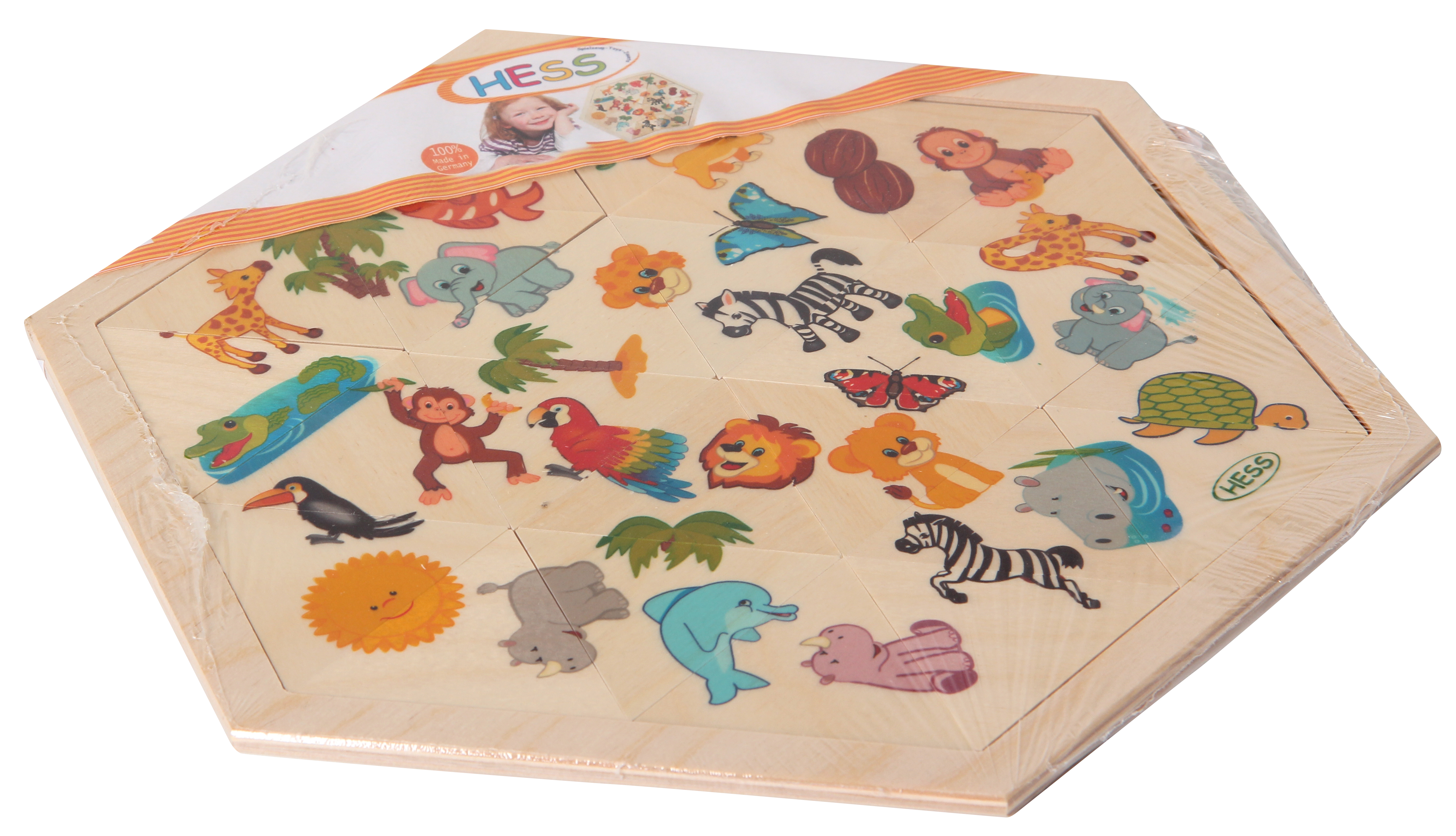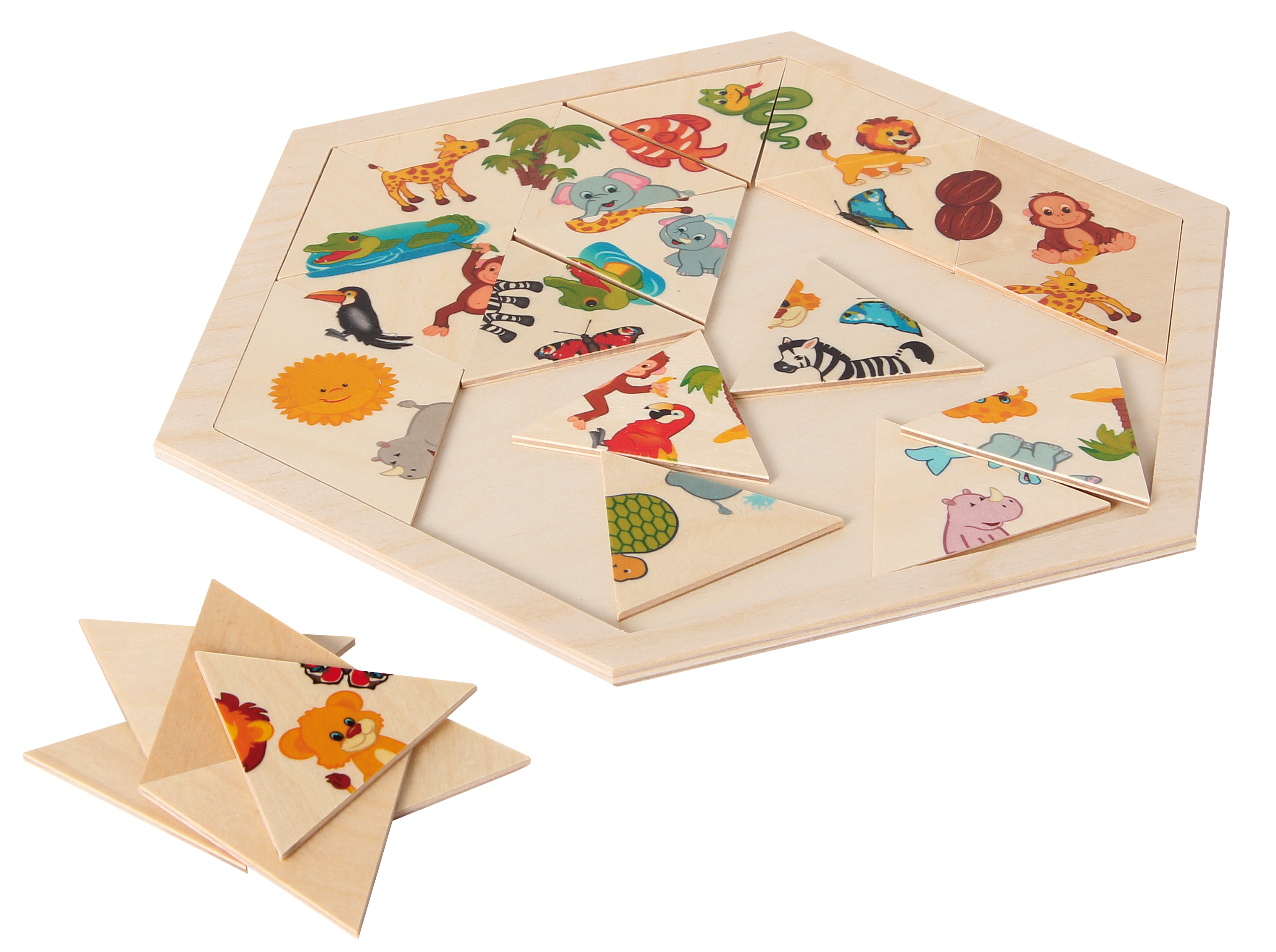 Spannendes Legepuzzle mit kindgerechten Motiven aus Holz. Die 24 Dreiecke sollen so in den sechseckigen Holzrahmen eingesetzt werden, dass die Motive nach allen Seiten zusammenpassen. Made in Germany.