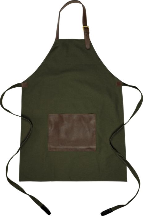 Leinenschürze (450 g / m2) mit rPET-PU-Tasche und verstellbarem Nackenband. Wasserabweisend.