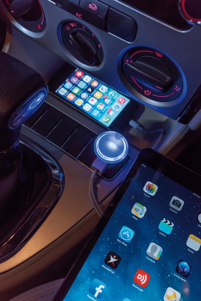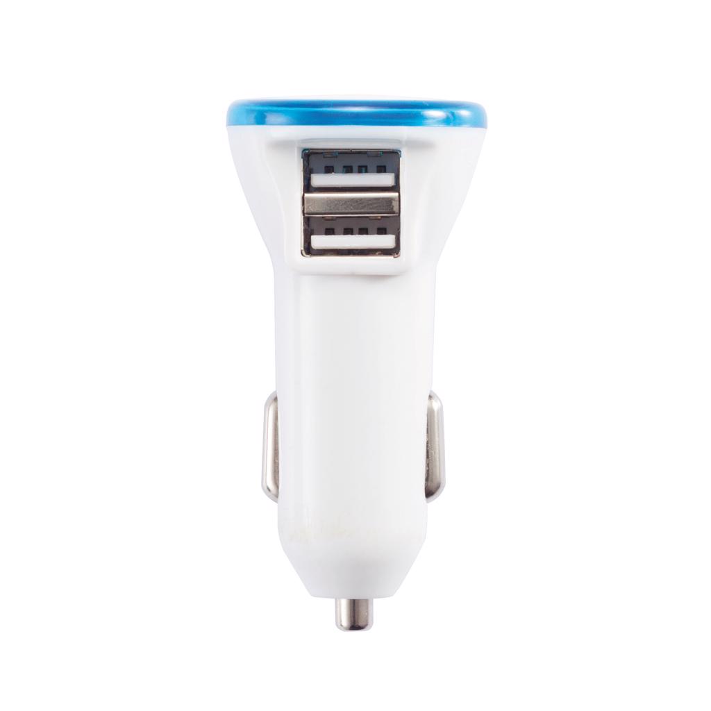 Auto-Ladeadapter mit doppeltem USB Anschluss und integriertem LED Licht an der Oberseite. Output: 5V/2.1A.