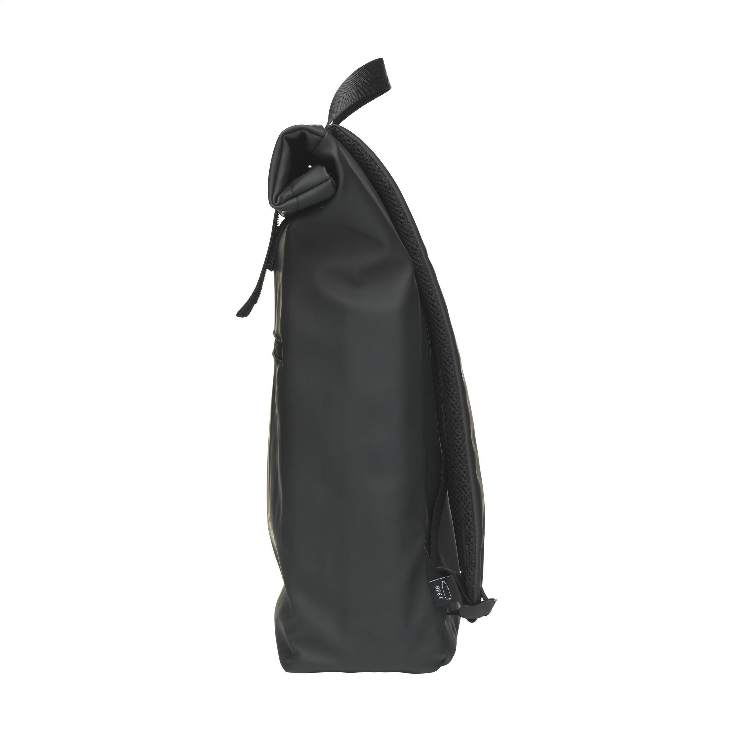 Praktischer, robuster und großzügiger 'Rolltop'-Laptop-Rucksack mit extra Reißverschlussfach auf der Vorderseite. Dieser Rucksack hat an der Oberseite nicht nur einen praktischen Rollverschluss mit Klettband, sondern auch einen Reißverschluss. Dieser Rucksack besteht aus wasserabweisendem PU, zu 5% aus recyceltem PU und zu 42% aus recyceltem Polyester. Der Rucksack hat ein sauber verarbeitetes Futter aus recyceltem PET und ist mit allem Komfort ausgestattet. Das großzügige Innenfach verfügt über ein separates Fach für einen Laptop (bis zu 15,6 Zoll) oder ein Tablet. Darüber hinaus finden Sie auf der Innenseite mehrere Einschubfächer zur organisierten Aufbewahrung von Handy, Schreibutensilien oder anderem Zubehör. Ein elastisches Band im Inneren hält eine Trinkflasche aufrecht an ihrem Platz. Mit praktischer Trageschlaufe. Für zusätzlichen Tragekomfort sind die Rückseite und die verstellbaren Schulterriemen mit weichem Schaumstoff ausgestattet. Dieser Rucksack ist perfekt für den täglichen Gebrauch und lässt sich leicht in die Schule oder zur Arbeit mitnehmen. RCS-zertifiziert. Gesamtes recyceltes Material: 47%. Fassungsvermögen: ca. 19 Liter.