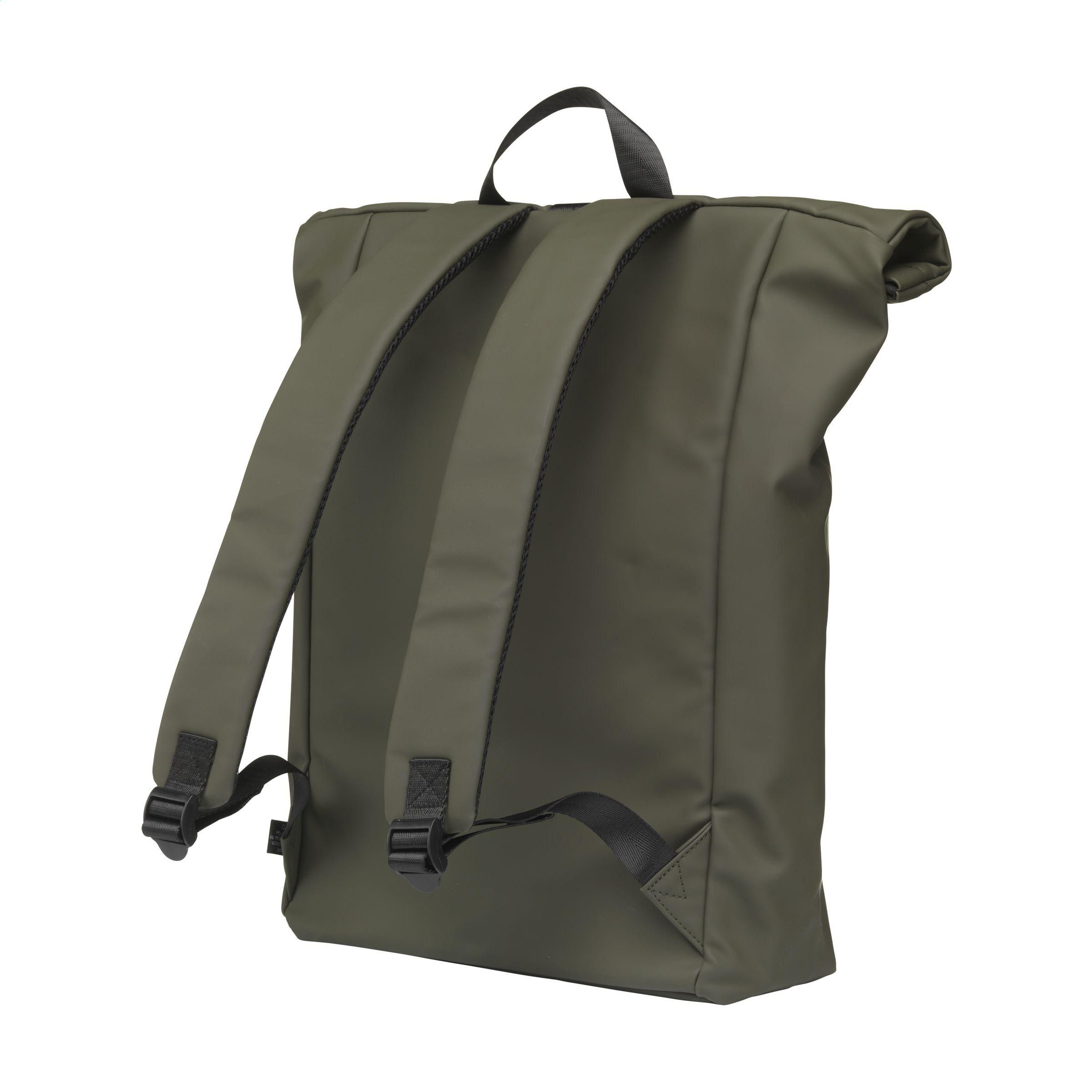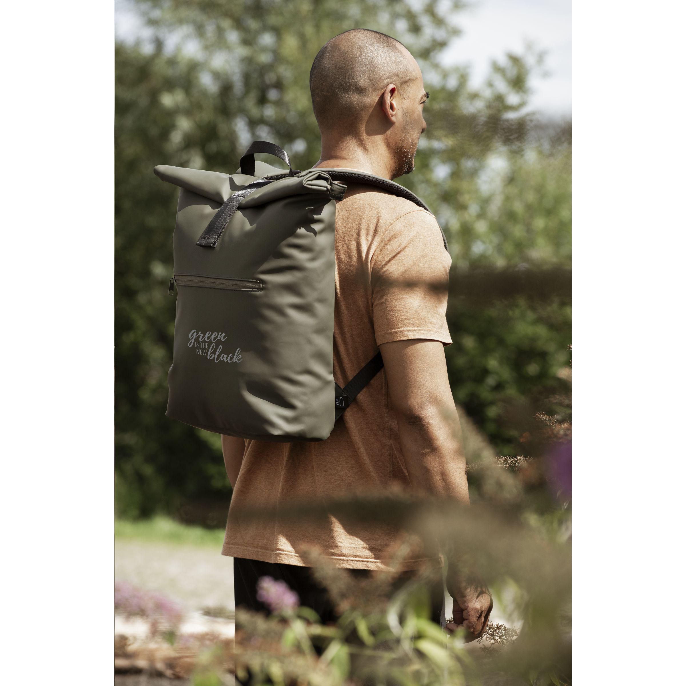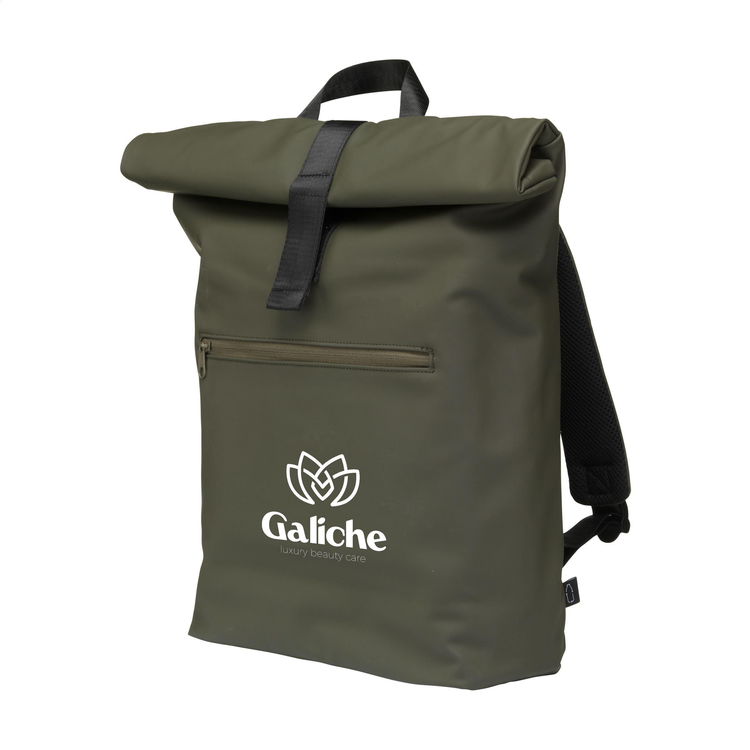 Praktischer, robuster und großzügiger 'Rolltop'-Laptop-Rucksack mit extra Reißverschlussfach auf der Vorderseite. Dieser Rucksack hat an der Oberseite nicht nur einen praktischen Rollverschluss mit Klettband, sondern auch einen Reißverschluss. Dieser Rucksack besteht aus wasserabweisendem PU, zu 5% aus recyceltem PU und zu 42% aus recyceltem Polyester. Der Rucksack hat ein sauber verarbeitetes Futter aus recyceltem PET und ist mit allem Komfort ausgestattet. Das großzügige Innenfach verfügt über ein separates Fach für einen Laptop (bis zu 15,6 Zoll) oder ein Tablet. Darüber hinaus finden Sie auf der Innenseite mehrere Einschubfächer zur organisierten Aufbewahrung von Handy, Schreibutensilien oder anderem Zubehör. Ein elastisches Band im Inneren hält eine Trinkflasche aufrecht an ihrem Platz. Mit praktischer Trageschlaufe. Für zusätzlichen Tragekomfort sind die Rückseite und die verstellbaren Schulterriemen mit weichem Schaumstoff ausgestattet. Dieser Rucksack ist perfekt für den täglichen Gebrauch und lässt sich leicht in die Schule oder zur Arbeit mitnehmen. RCS-zertifiziert. Gesamtes recyceltes Material: 47%. Fassungsvermögen: ca. 19 Liter.