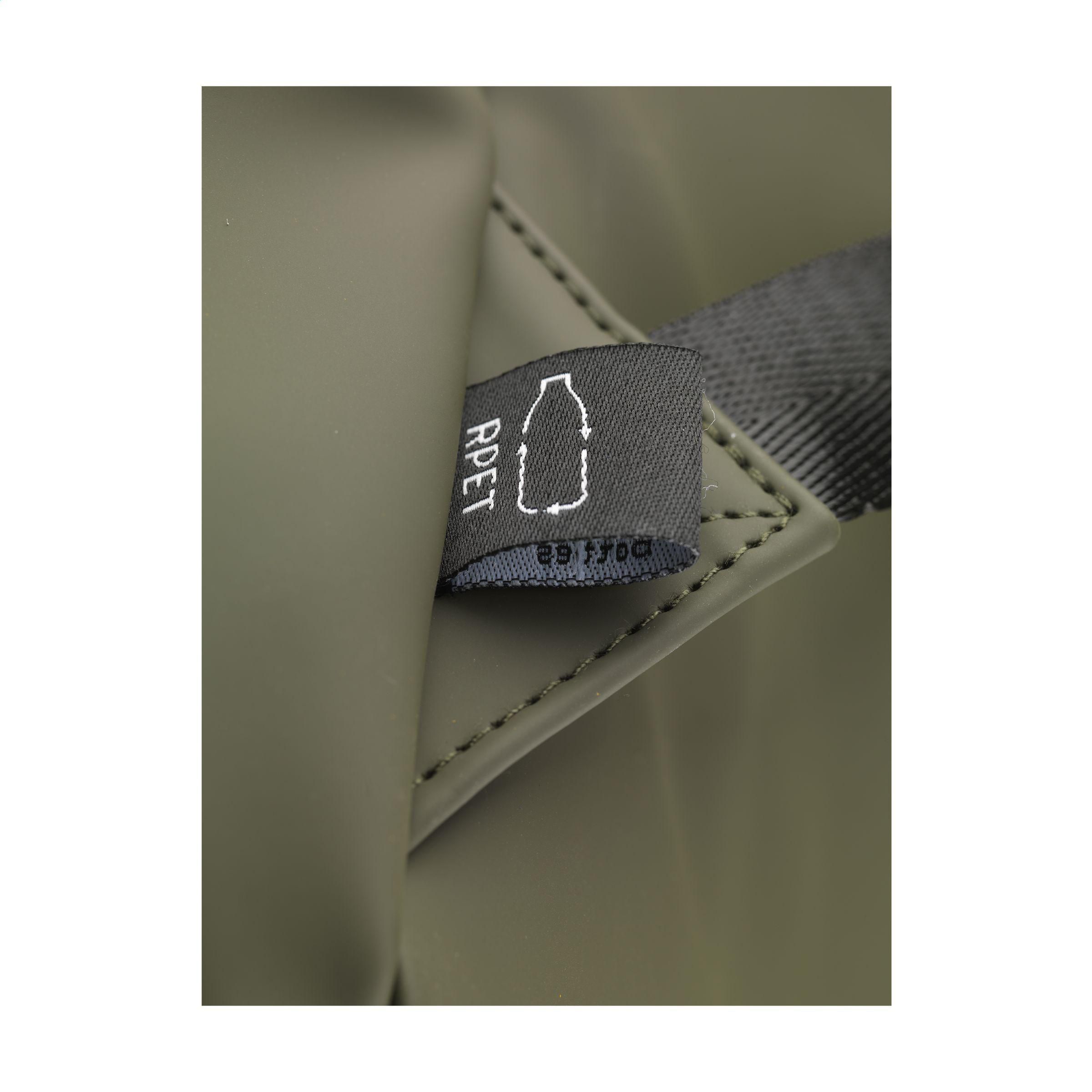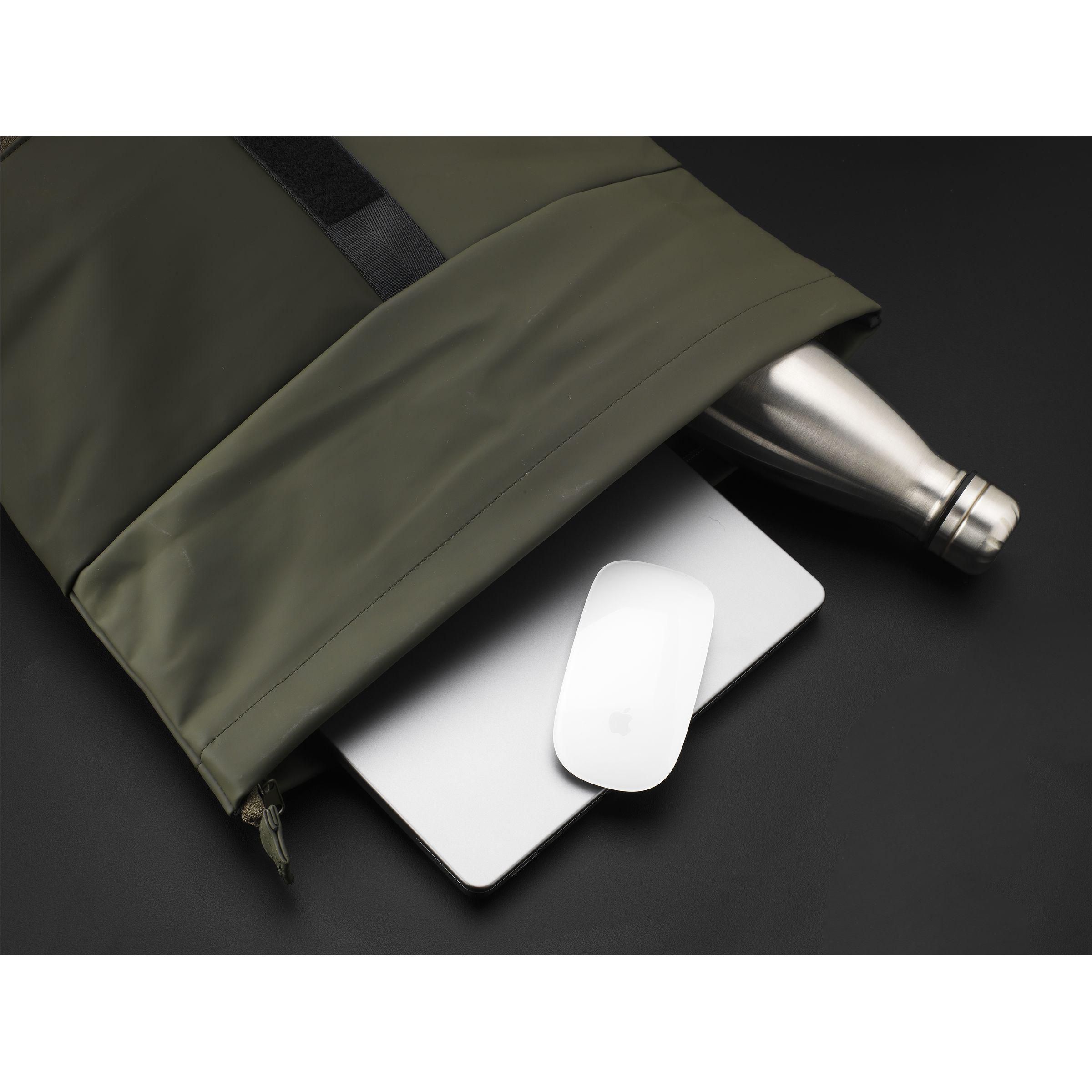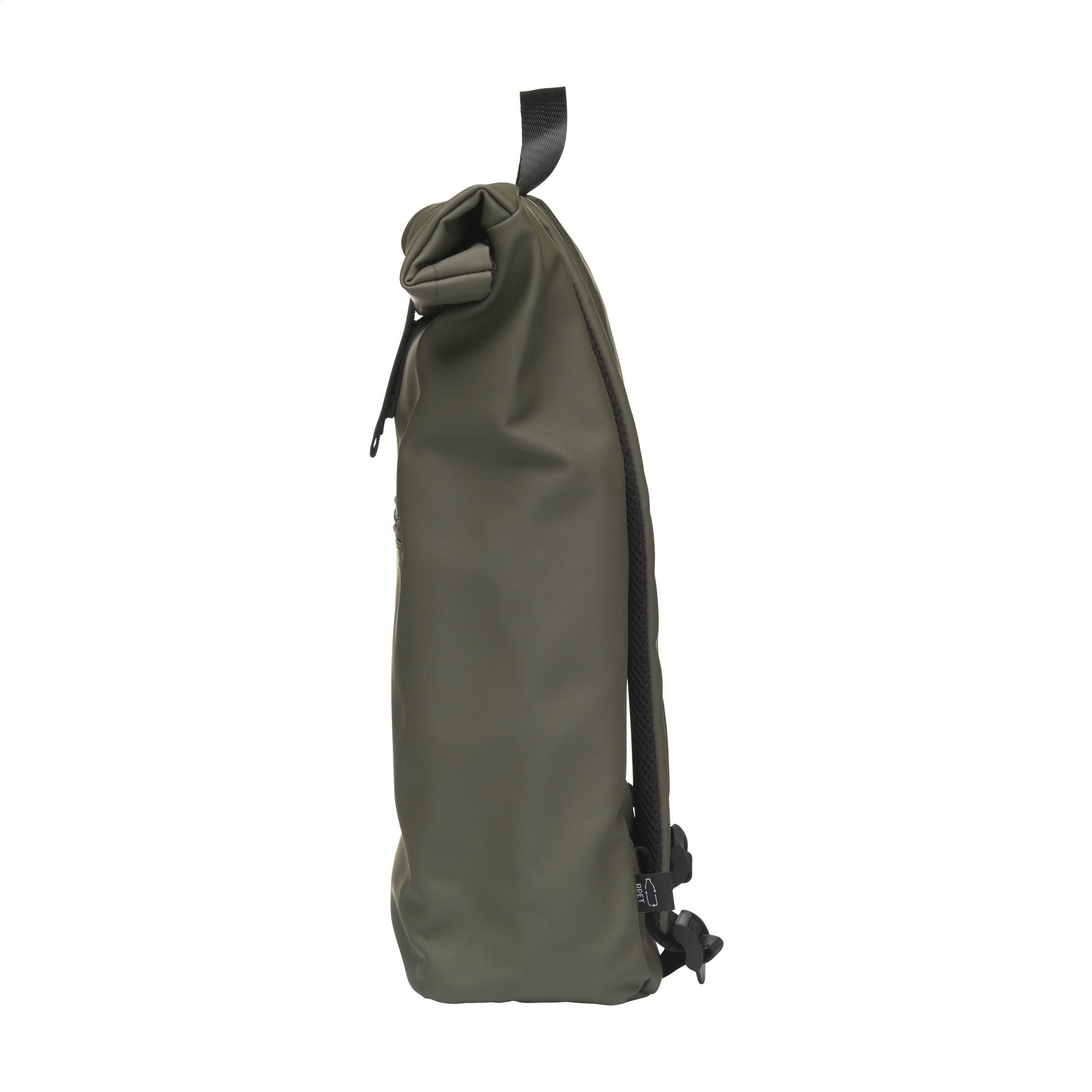 Praktischer, robuster und großzügiger 'Rolltop'-Laptop-Rucksack mit extra Reißverschlussfach auf der Vorderseite. Dieser Rucksack hat an der Oberseite nicht nur einen praktischen Rollverschluss mit Klettband, sondern auch einen Reißverschluss. Dieser Rucksack besteht aus wasserabweisendem PU, zu 5% aus recyceltem PU und zu 42% aus recyceltem Polyester. Der Rucksack hat ein sauber verarbeitetes Futter aus recyceltem PET und ist mit allem Komfort ausgestattet. Das großzügige Innenfach verfügt über ein separates Fach für einen Laptop (bis zu 15,6 Zoll) oder ein Tablet. Darüber hinaus finden Sie auf der Innenseite mehrere Einschubfächer zur organisierten Aufbewahrung von Handy, Schreibutensilien oder anderem Zubehör. Ein elastisches Band im Inneren hält eine Trinkflasche aufrecht an ihrem Platz. Mit praktischer Trageschlaufe. Für zusätzlichen Tragekomfort sind die Rückseite und die verstellbaren Schulterriemen mit weichem Schaumstoff ausgestattet. Dieser Rucksack ist perfekt für den täglichen Gebrauch und lässt sich leicht in die Schule oder zur Arbeit mitnehmen. RCS-zertifiziert. Gesamtes recyceltes Material: 47%. Fassungsvermögen: ca. 19 Liter.