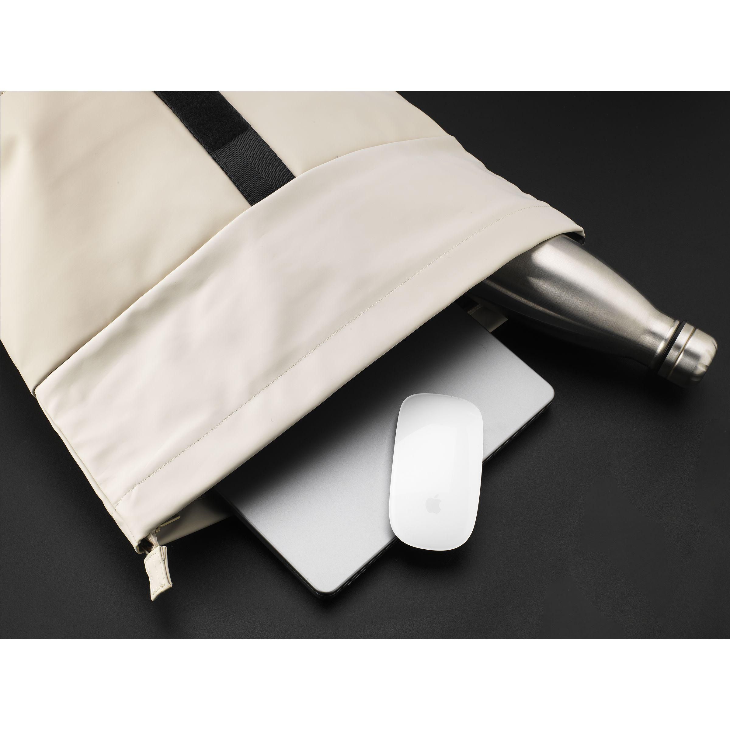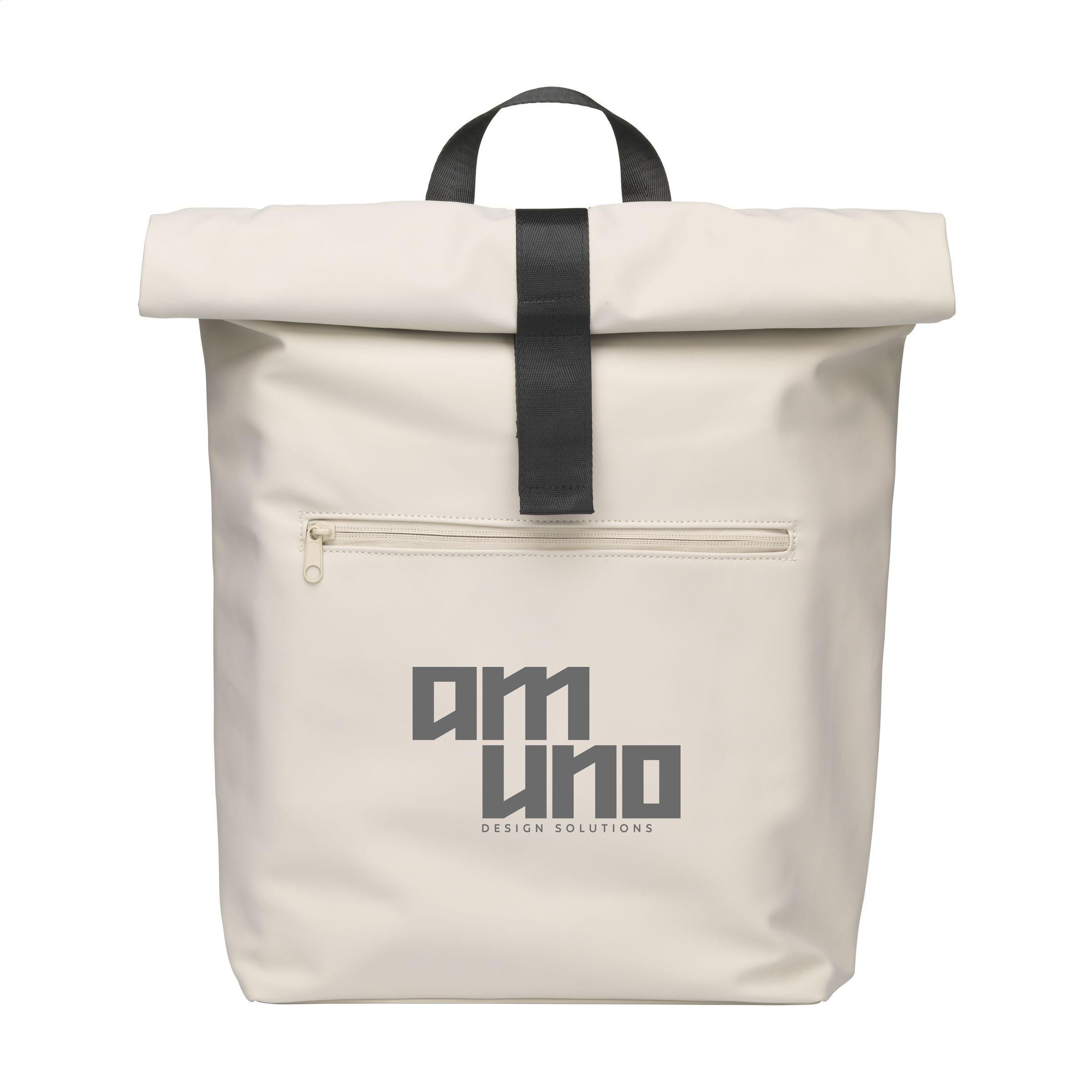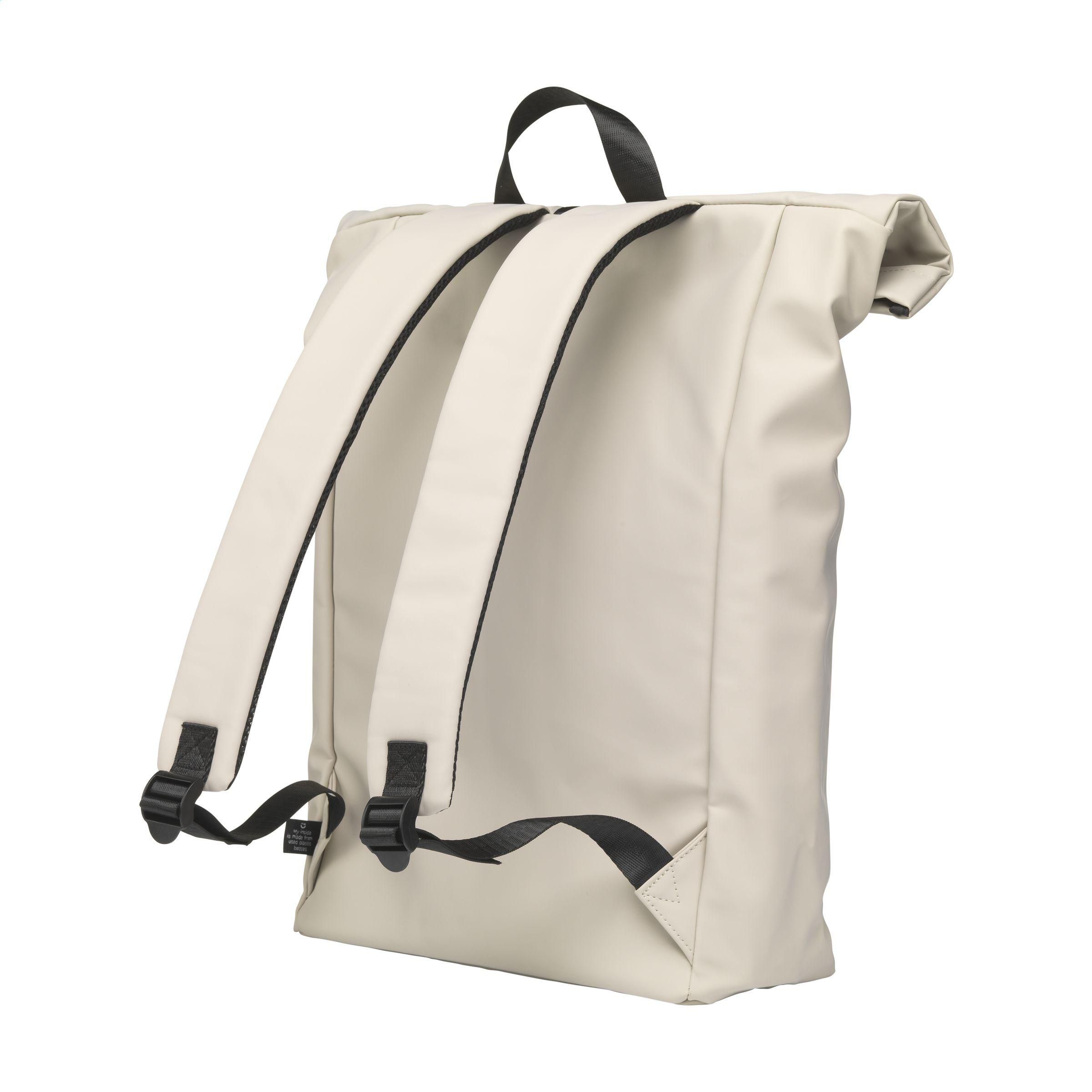 Praktischer, robuster und großzügiger 'Rolltop'-Laptop-Rucksack mit extra Reißverschlussfach auf der Vorderseite. Dieser Rucksack hat an der Oberseite nicht nur einen praktischen Rollverschluss mit Klettband, sondern auch einen Reißverschluss. Dieser Rucksack besteht aus wasserabweisendem PU, zu 5% aus recyceltem PU und zu 42% aus recyceltem Polyester. Der Rucksack hat ein sauber verarbeitetes Futter aus recyceltem PET und ist mit allem Komfort ausgestattet. Das großzügige Innenfach verfügt über ein separates Fach für einen Laptop (bis zu 15,6 Zoll) oder ein Tablet. Darüber hinaus finden Sie auf der Innenseite mehrere Einschubfächer zur organisierten Aufbewahrung von Handy, Schreibutensilien oder anderem Zubehör. Ein elastisches Band im Inneren hält eine Trinkflasche aufrecht an ihrem Platz. Mit praktischer Trageschlaufe. Für zusätzlichen Tragekomfort sind die Rückseite und die verstellbaren Schulterriemen mit weichem Schaumstoff ausgestattet. Dieser Rucksack ist perfekt für den täglichen Gebrauch und lässt sich leicht in die Schule oder zur Arbeit mitnehmen. RCS-zertifiziert. Gesamtes recyceltes Material: 47%. Fassungsvermögen: ca. 19 Liter.