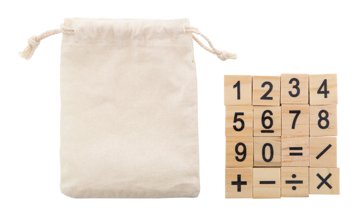 Lernspiel aus Holz zum Zählen in einem Baumwollbeutel mit Kordelzug. Mit 32 Spielsteinen, darunter Zahlen und Rechenoperationszeichen.
